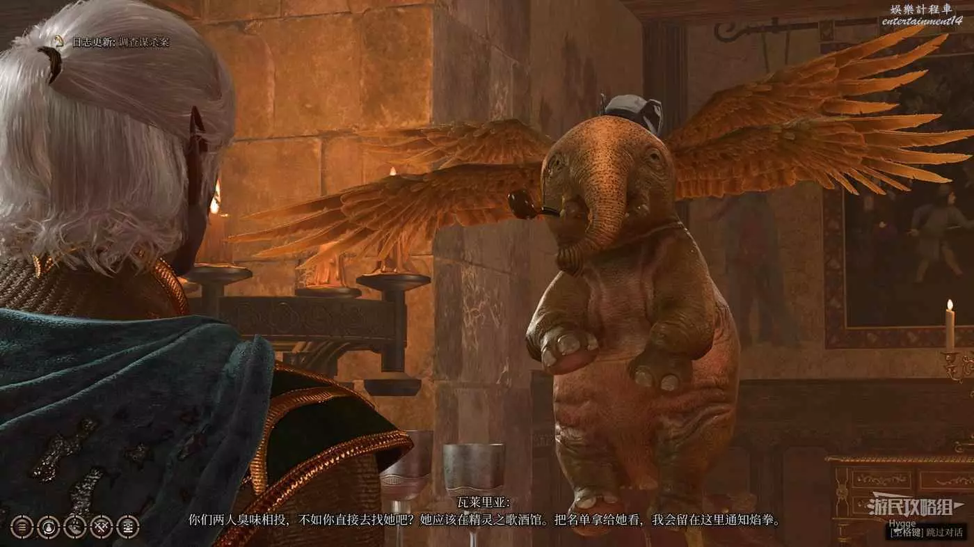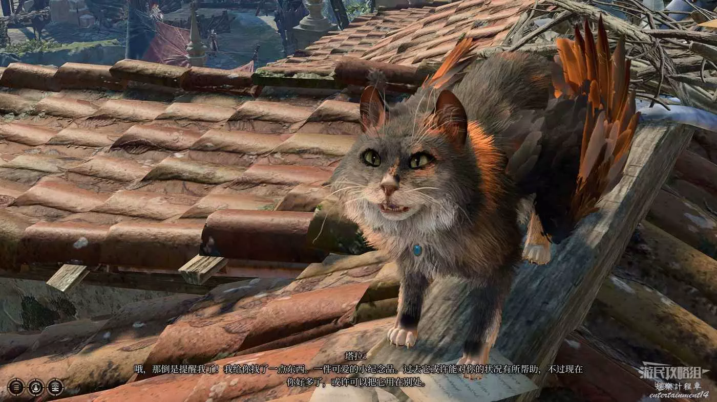 與蓋爾交談時翼貓塔拉會直接鳥巢中的戒指和信件送給我們,其他角色來需要通過各種檢定才能夠獲得這些東西。