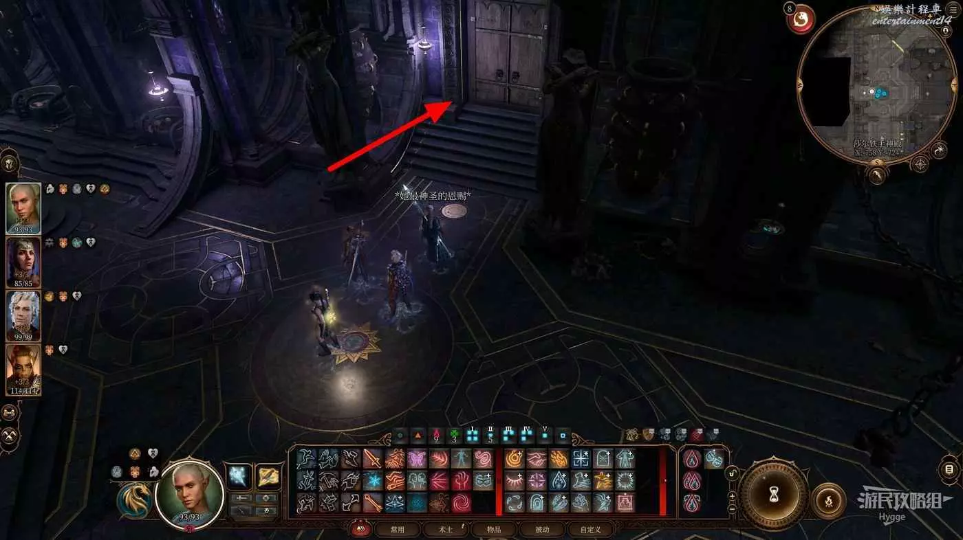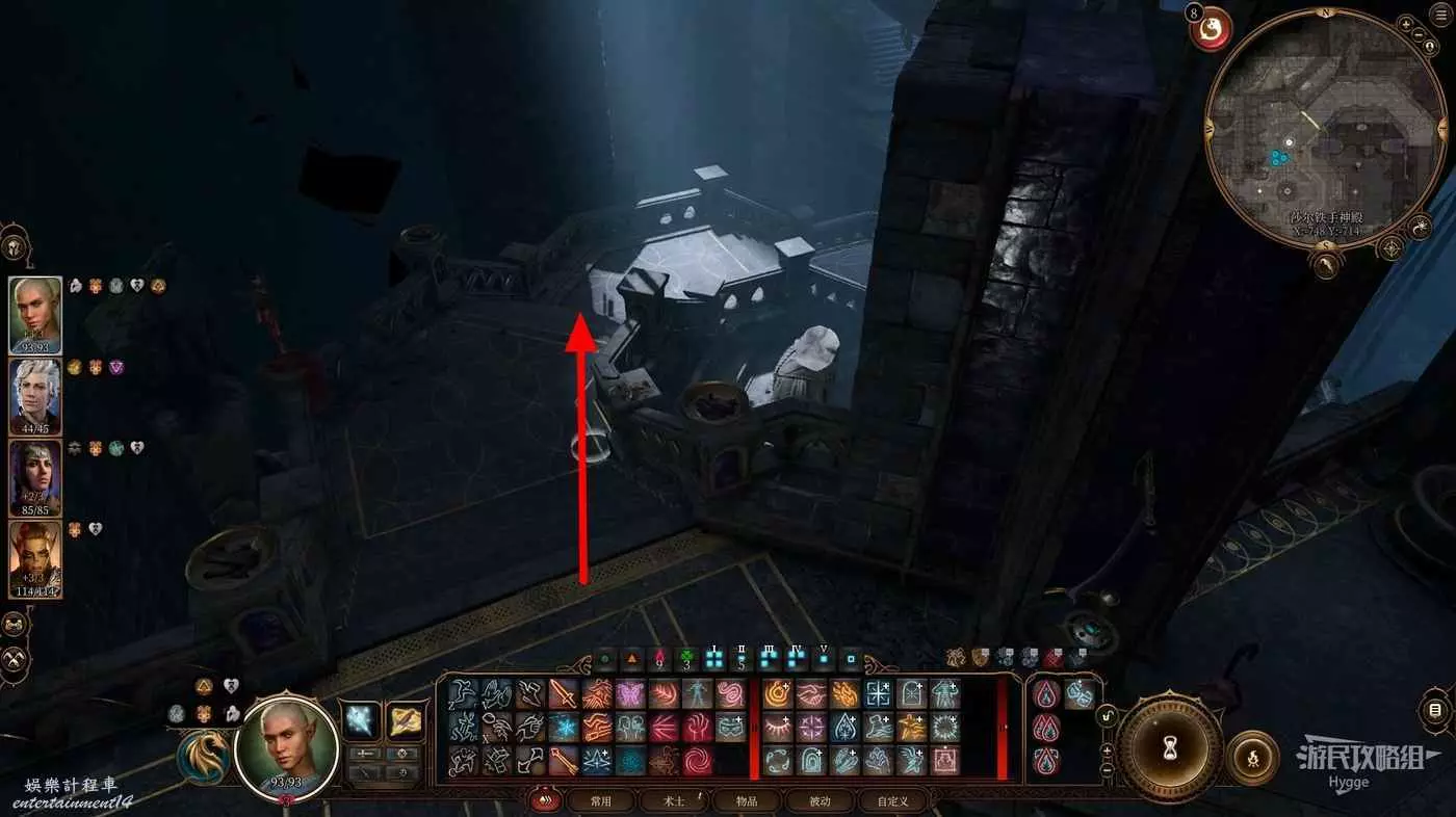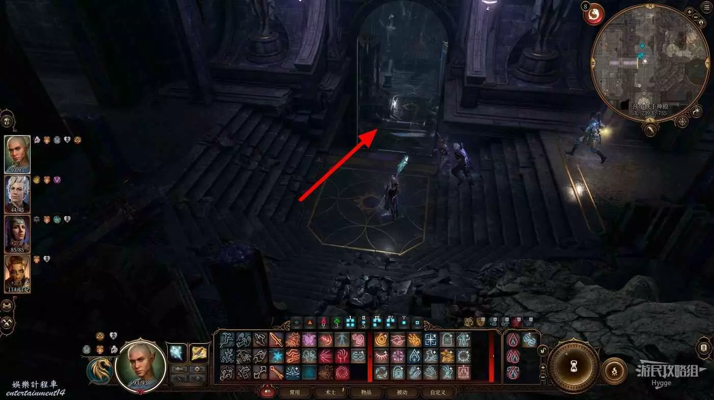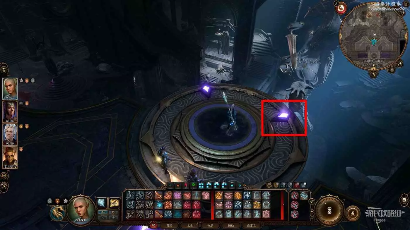 全員登上移動平臺後與地板上的穿越寶石互動進入神殿內部。