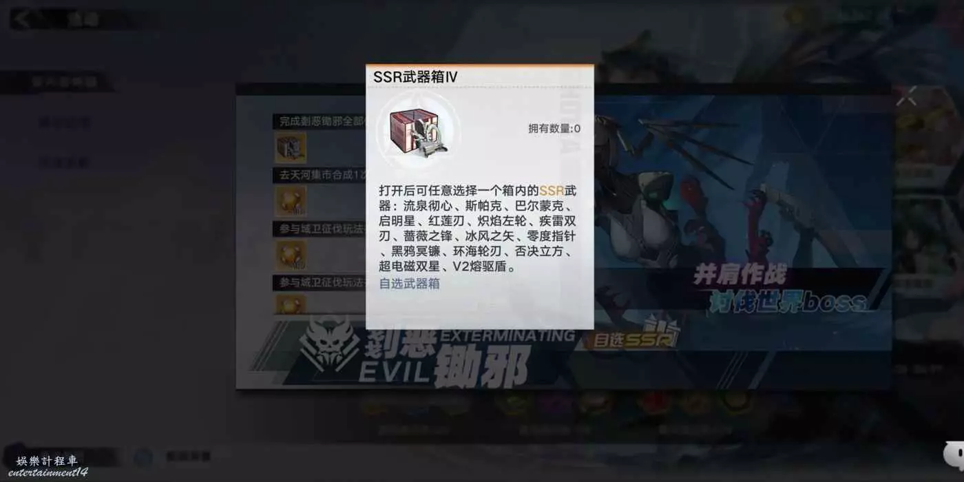 SSR自選箱之一的獲取方法是參與版本更新後,資訊專欄中的剗惡鋤邪任務。除去最後直接拿獎勵的,剩下還有5個任務。等到5個任務全部做完,就可以領取SSR自選箱了。