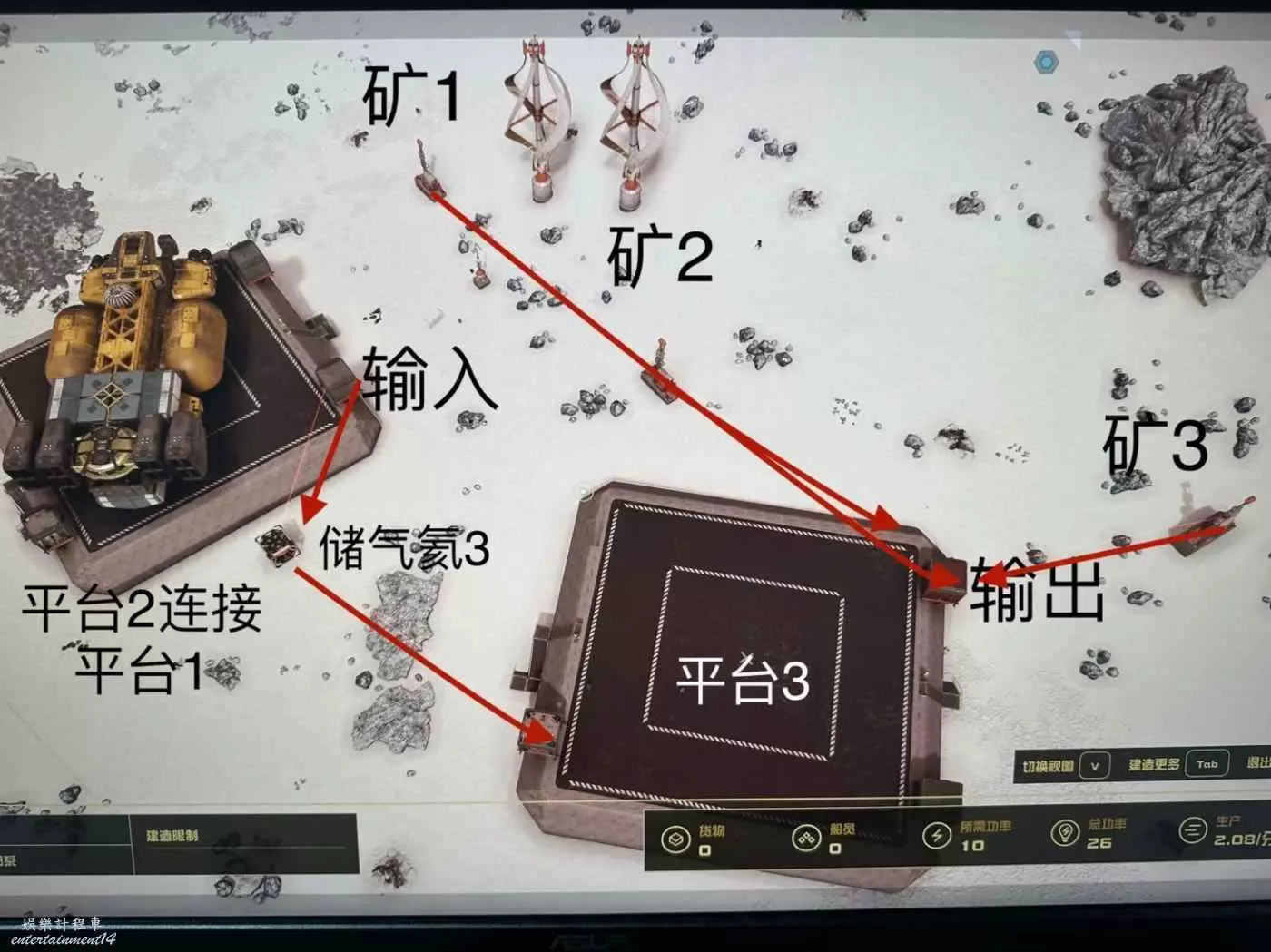 首先還是在礦源建立哨站和發電機,然後建立平台2號。對接方法是平台上樓梯處有一台電腦,可以設置對接有未連結的平台,這裡對接了前面的木衛一的平台1號。一個平台同時只能對接一個平台。然後建造儲氣罐並連結平台2的輸入箱。這樣一來這個星球就有了氦3源頭。再將儲氣箱對接給平台3的氦罐做能源。然後把礦塔連接到平台3的輸出上,這樣,平台3就準備好給主基地的平台送貨了。