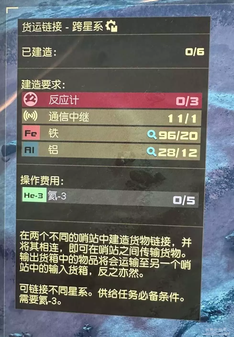 然後我們要找一顆有氦3的星球,比如木衛一,可能每個人不同。登陸星球後按F觀察地面,當發現有標有氦3的綠色地形是(注意不是噴氣口)就建立哨站+發電機+跨星貨運平台。然後建造兩個采氣用的提取氣。一個連接給跨星平台的儲氦罐。一個連結到輸出箱子。箭頭是連接方向。滑鼠移到箱子會在左上角顯示輸出或輸入。這樣一個單方面輸出的平台建立好了
