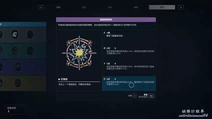 目標控制系統主要用於太空戰鬥,可以鎖定敵方飛船精確打擊,這個對於打架能力提升很大,而且任務裡面有不少太空戰鬥的情景,又不太好操作,這個技能就至關重要了。