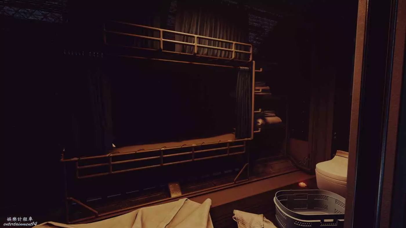 來到第二個隔間,內飾就豐富了很多,船長室的單人床隔間,對面是書桌,本是應該很溫馨的區域,欄色的燈管白色的鐵牆卻顯得有些冰冷,要是暖色燈光感覺會好很多