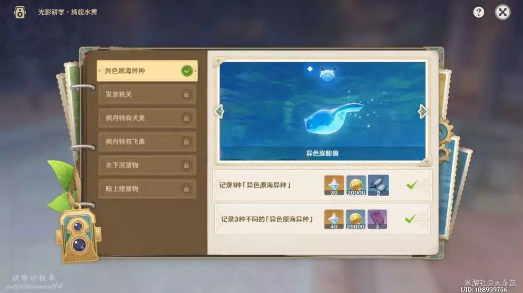 原神 (Genshin Impact) 光影研學活動Day1攻略 14 9 月 2023-09-14 廣告 作者:天龍筮 來源:米遊社論壇 活動時間 2023/09/14 10:00 ~ 2023/09/25 03:59 參與條件 冒險等階≥20級 且解鎖楓丹任意七天神像 任務攻略 我們先傳送到楓丹釣魚協會右側的錨點 然後我們往右手邊看 在這個位置就有兩種【異色原海異種】 然後我們傳送到海底左下角的錨點 我們直接往背後就能看見最後一種【異色原海異種】了