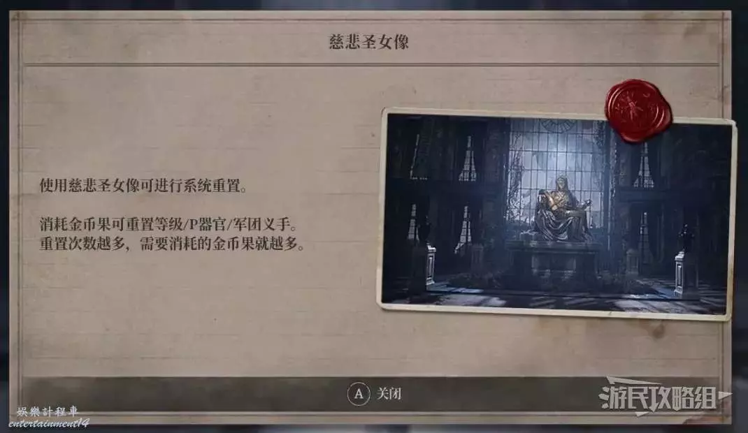 繼續推進主線流程,直到擊敗冠軍維克多,見到西蒙·瑪努斯,拿到【慈悲聖女像展廳鑰匙】,從入口離開BOSS戰區域,走右側樓梯開啟溫室的門,在雕像前可以使用金幣果來重置等級、P器官和軍團義手,但需要注意的是,重置的次數越多,需要的金幣果數量就越多。除此之外,金幣果還可以用來在基安喬的商店中購買道具。