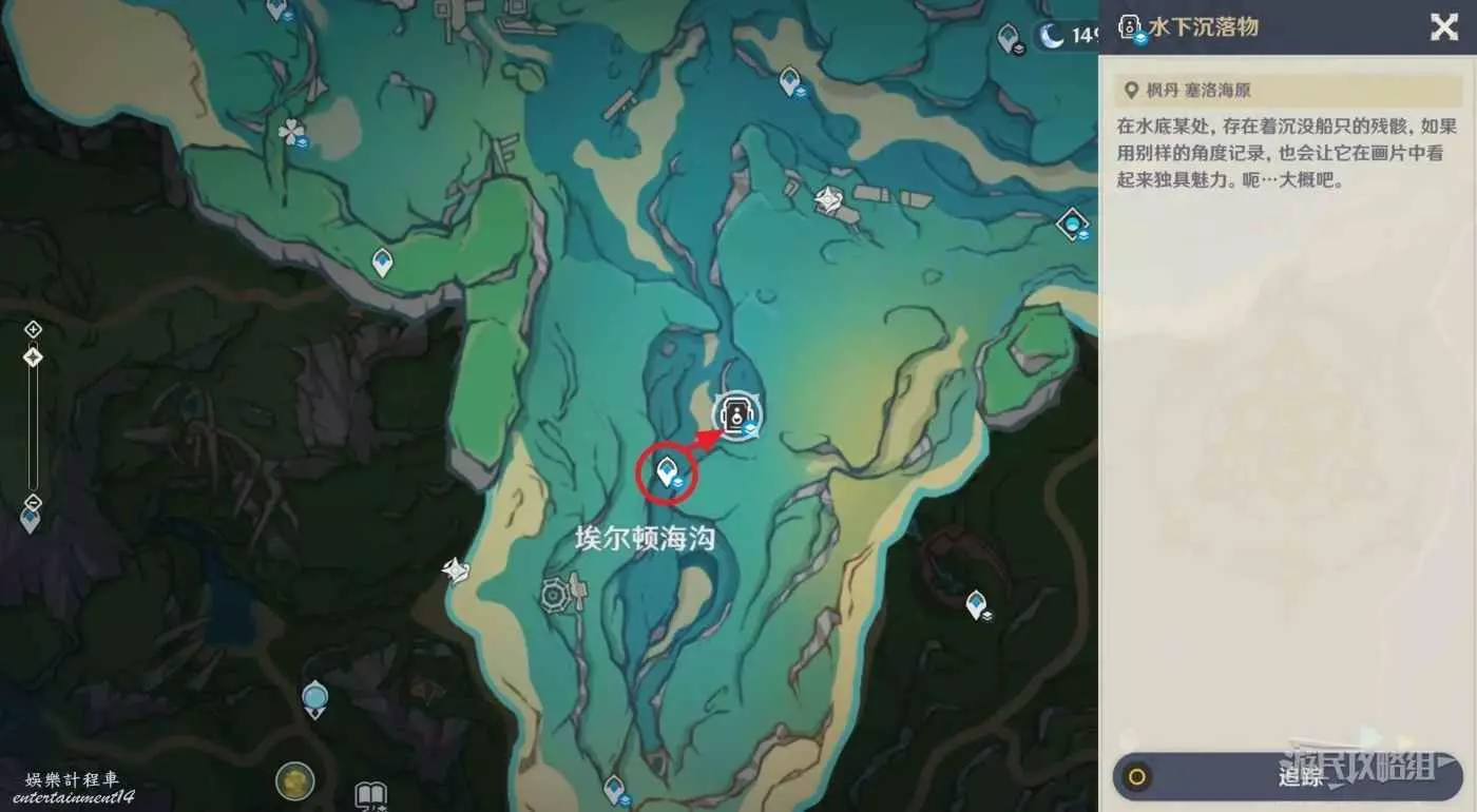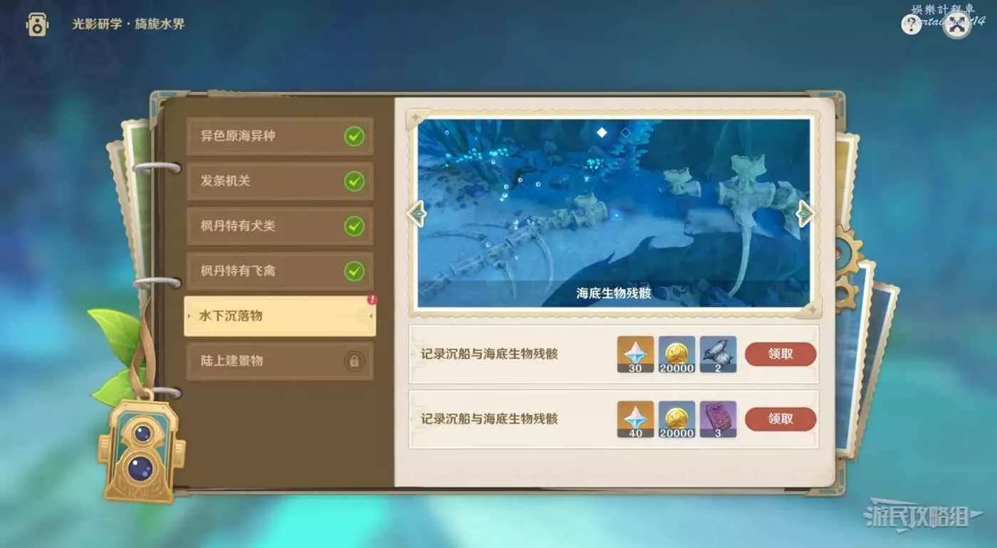 原神 (Genshin Impact) 4.0光影研學第五天拍照位置推薦 18 9 月 2023-09-18 廣告 作者:瑞破受氣包 來源:遊民星空 其他關卡拍照位置請參考這篇攻略。 第一個位置位於愛爾頓海溝,傳送到下圖所示的水下傳送錨點。 傳送完畢後直接轉身,打開相機即可拍照。 第二個位置在希望之路水下傳送錨點。 傳送完畢後,直接打開相機調整一下方向,對準海草旁的骨架即可拍照。