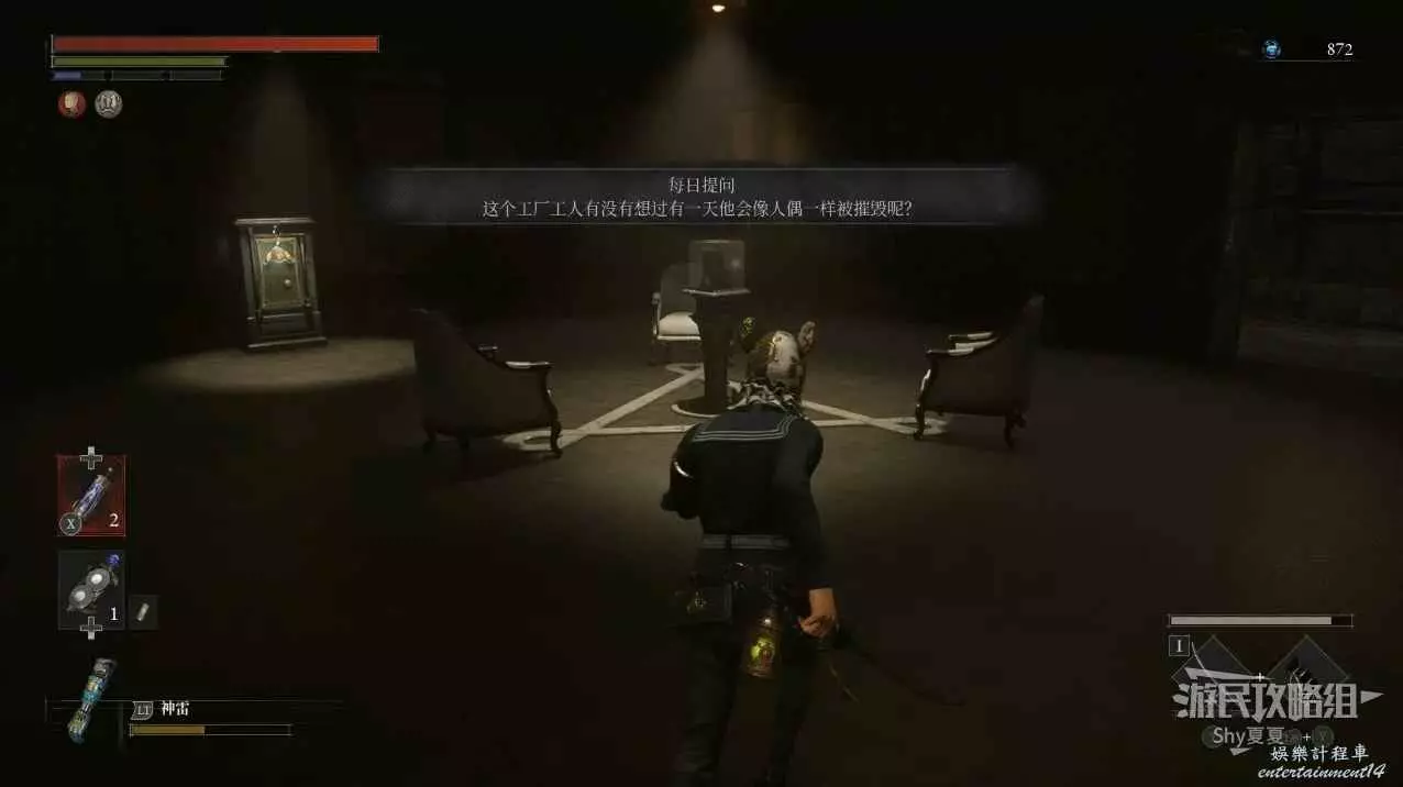 擊敗工坊聯合會一個綠罐敵人獲得。位置在第一次見到黑貓和狐狸後,裡面的道路盡頭左轉。