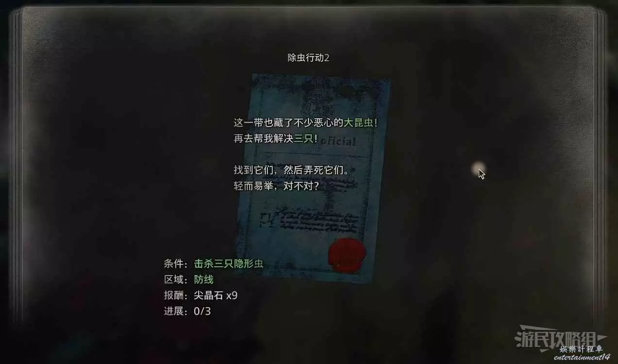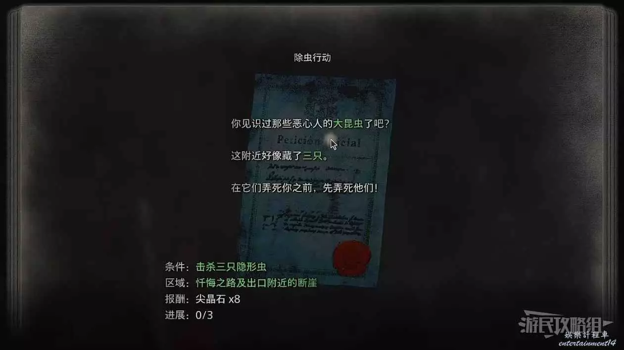 隱形蟲大多會躲在岩石等灰色區域,玩家經過時它們會主動攻擊,但懸賞任務中要求的隱形蟲是不會主動攻擊的,肉眼很難發現。使用第五章在葛列格裡奧水道拿到的【生物傳感鏡】有助於找到它們。