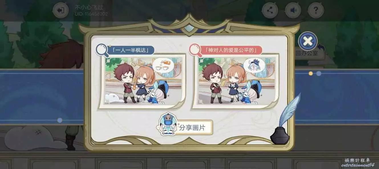 第一個空格選擇“芙甯娜大人”,第二個空格不變,達成結局:【神對人的愛是公平的】;