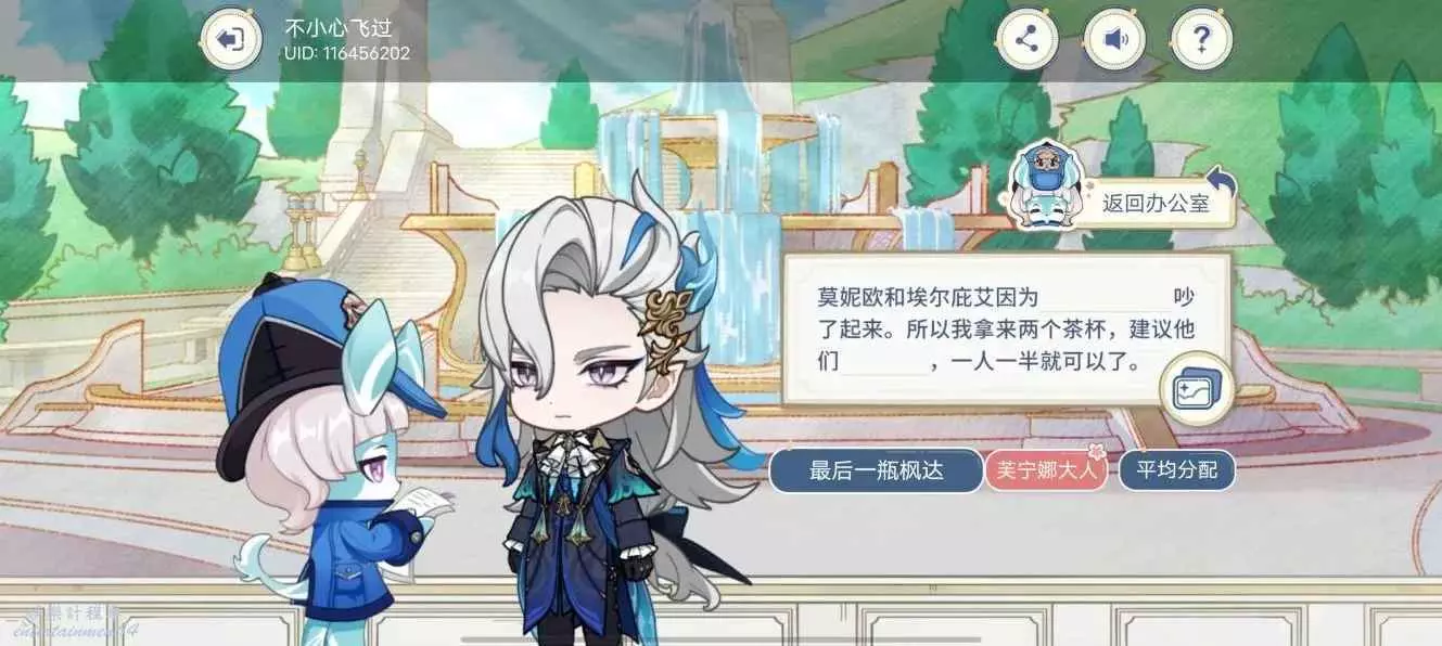 第一個空格選擇“最後一瓶楓達”,第二個空格選擇“平均分配”,達成結局:【一人一半楓達】;