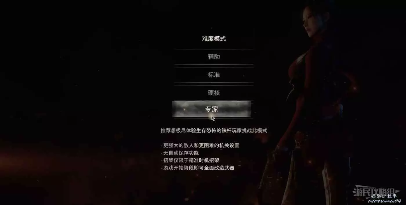 以任意難度通關逆命殊途DLC後都可以解鎖專家難度(最高難度),與其他較低的難度相比,專家難度具有更強大的敵人和更困難的機關設置,並且無法使用自動儲存,同時招架僅限於精準時機招架。此外在遊戲開始階段即可全面改造武器。