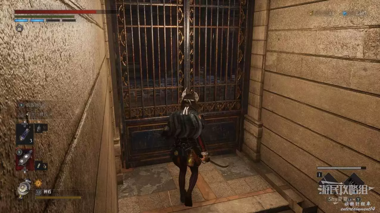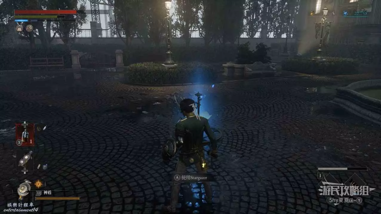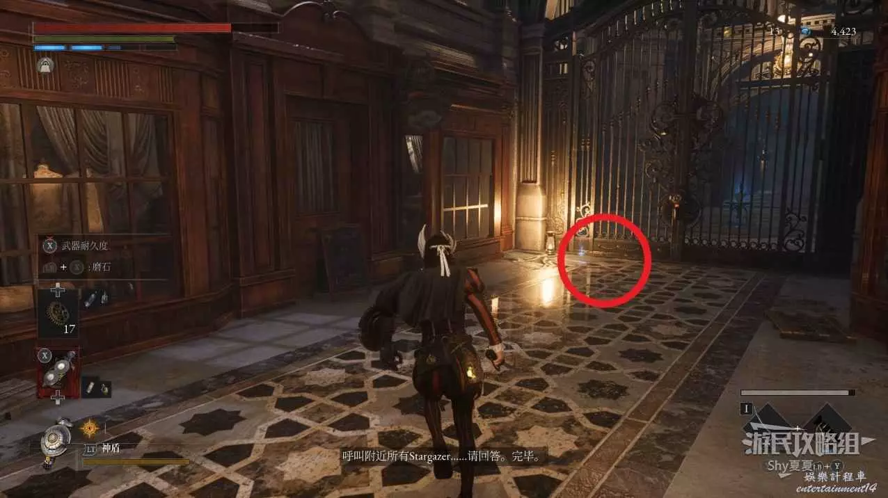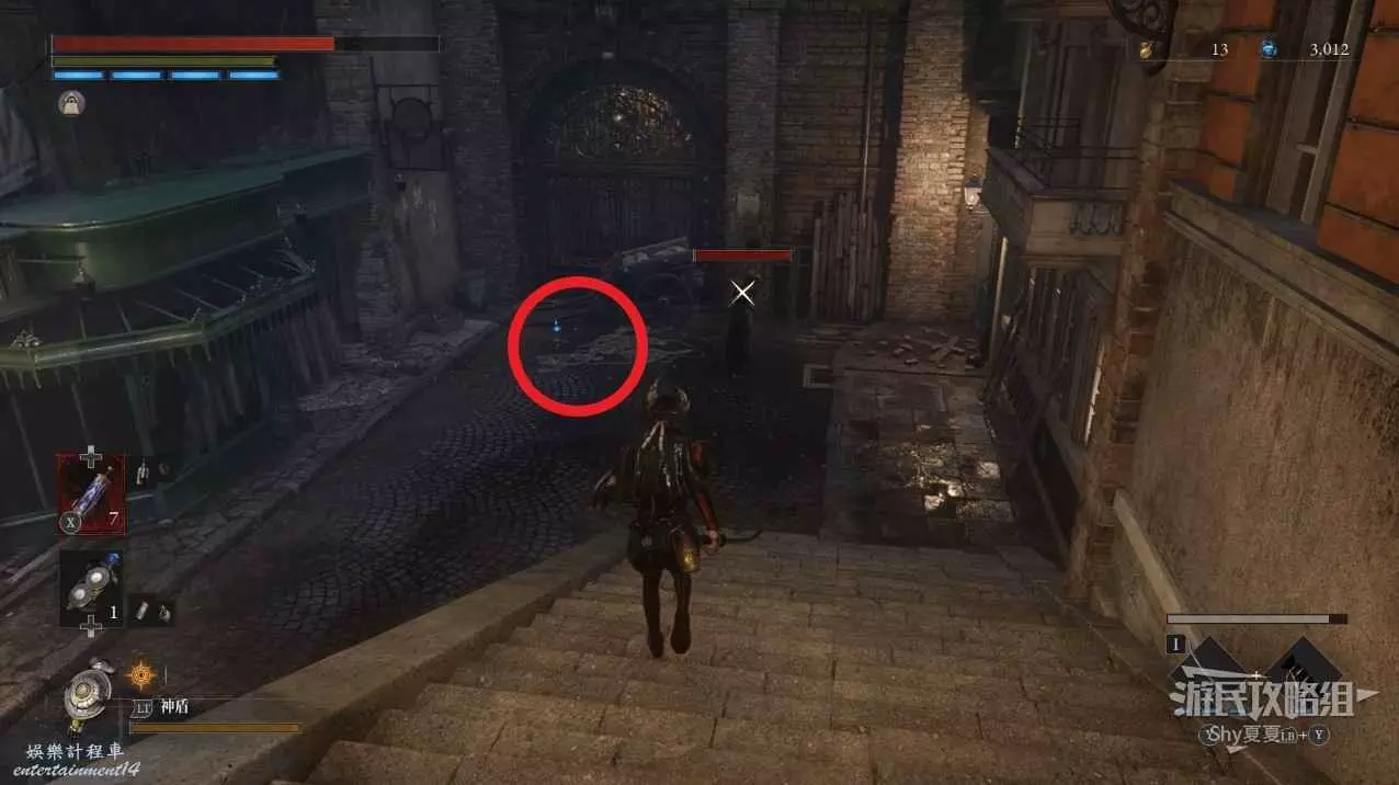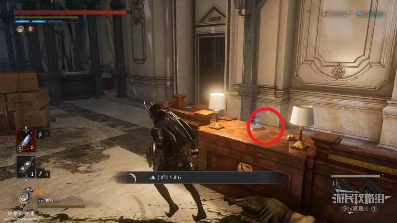出來後,把場景的三個女僕人偶都擊殺掉,轉身可以打開涵洞的捷徑門,就是Stargazer,狀態不好的話可以補給一下繼續前進,門前可以拾取【新月月光石】。