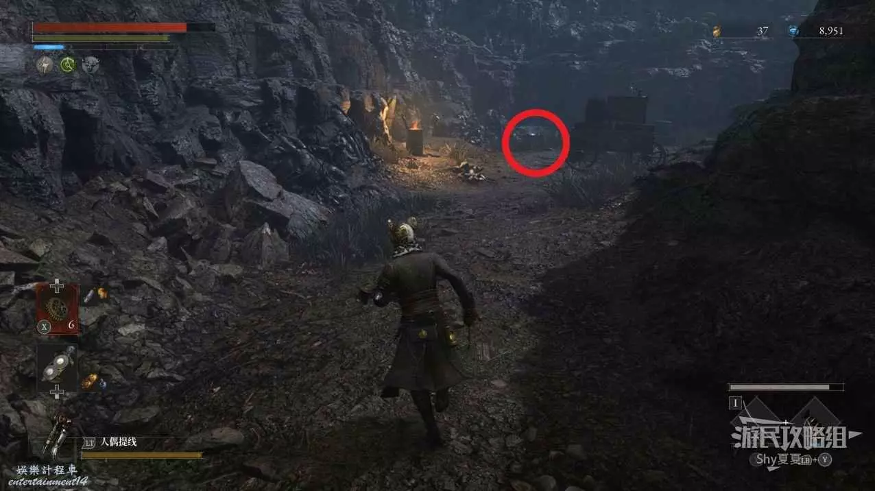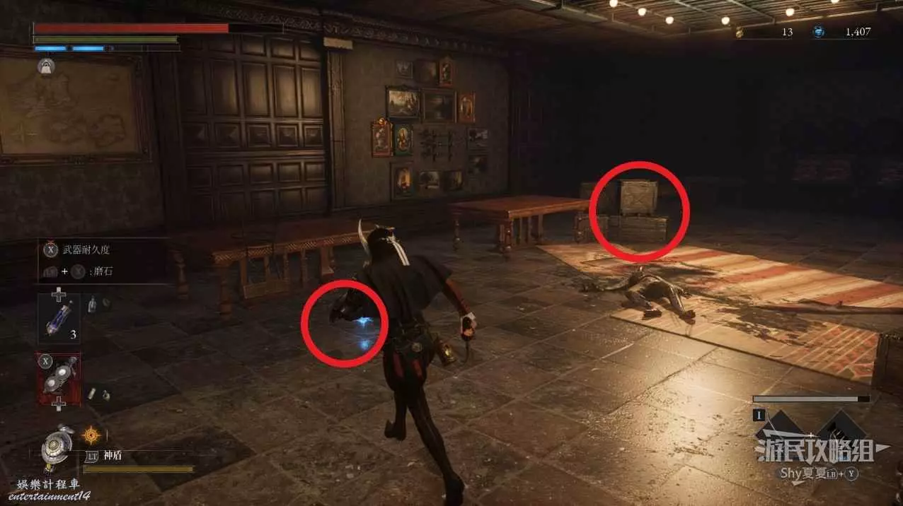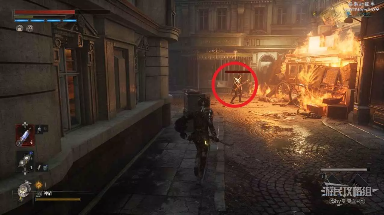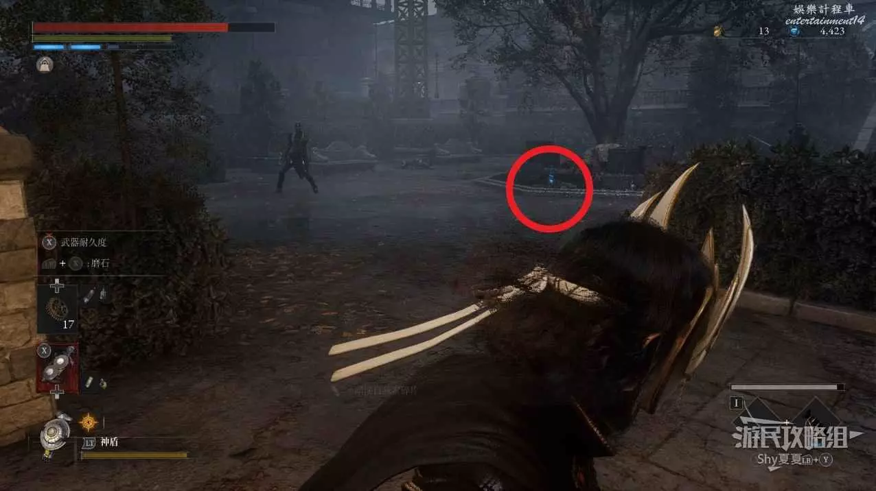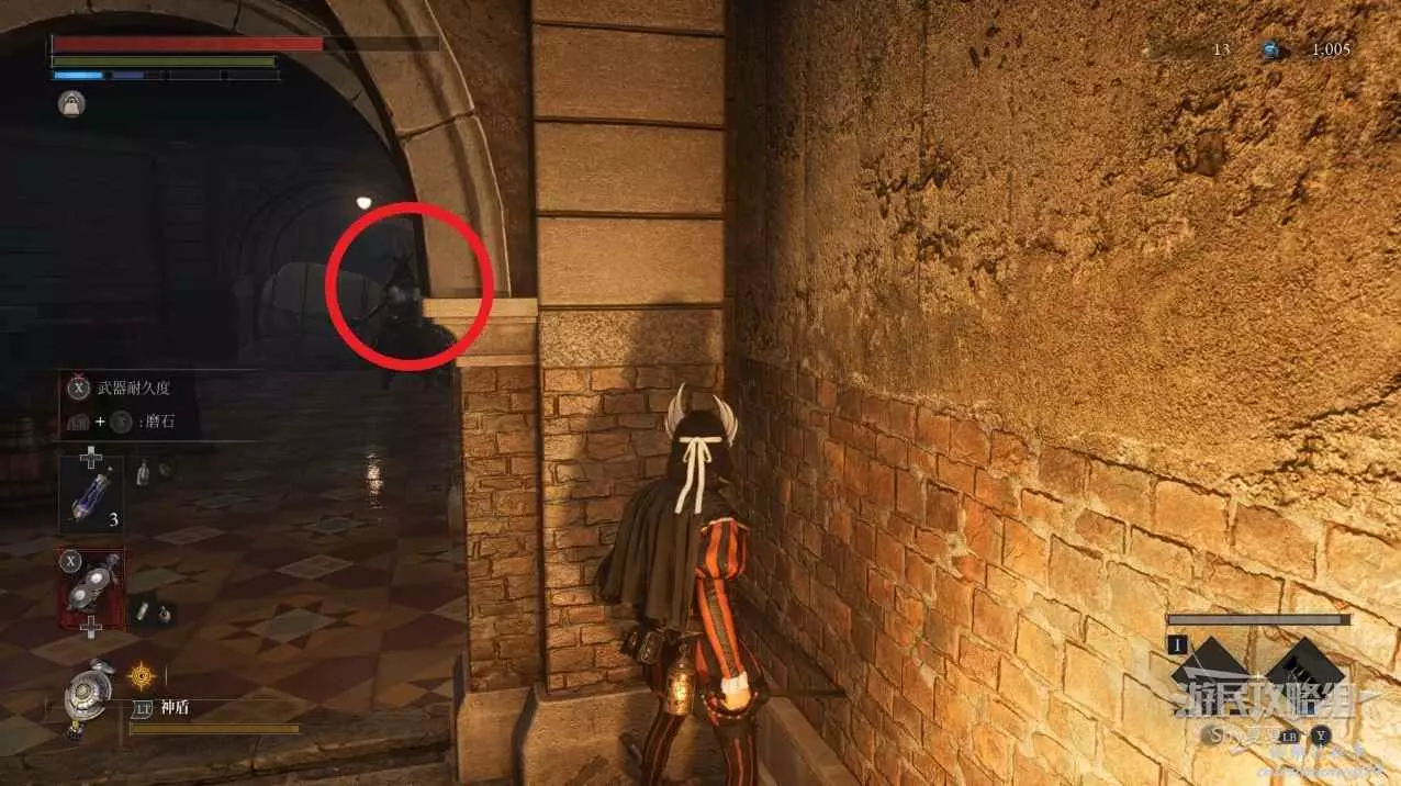 建議從入口走捷徑前進,看到火堆後,繞到士兵後面背刺解決。