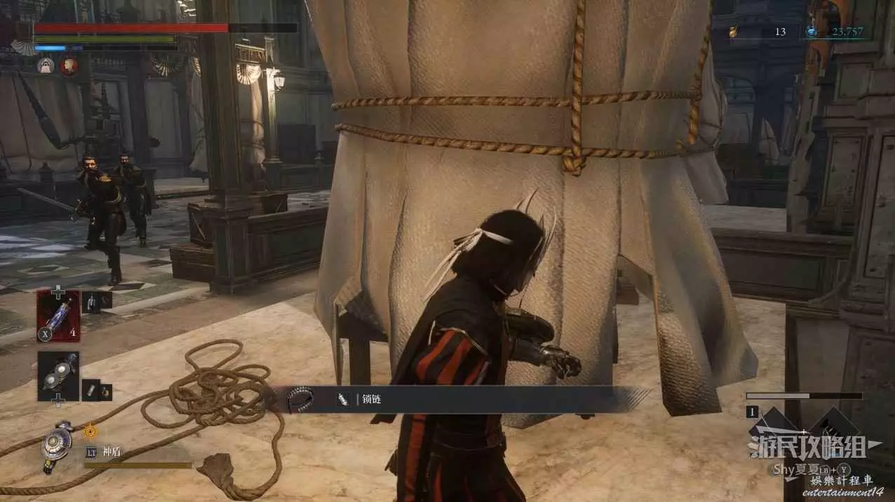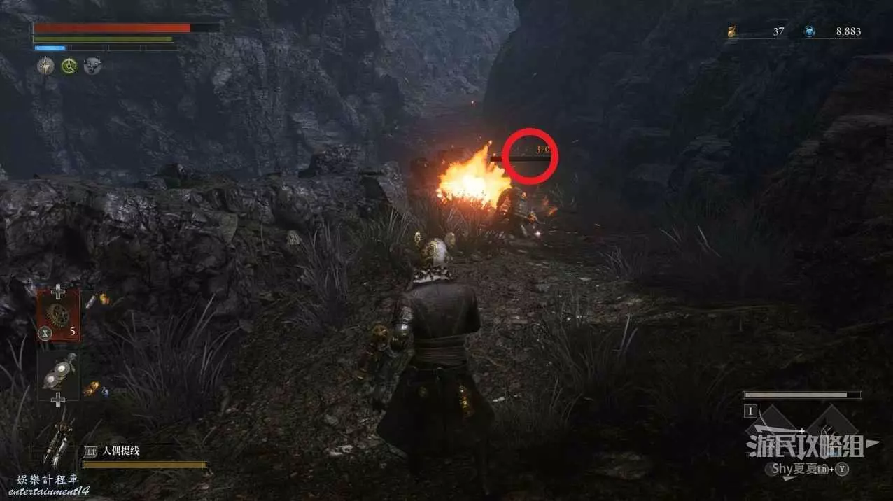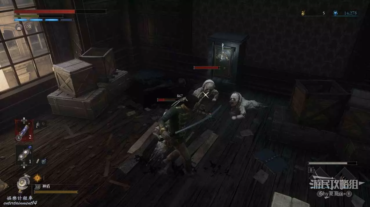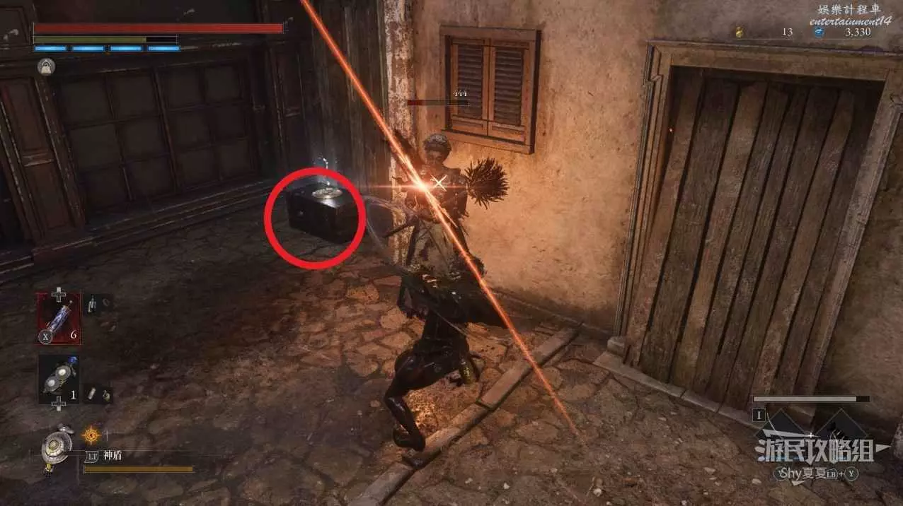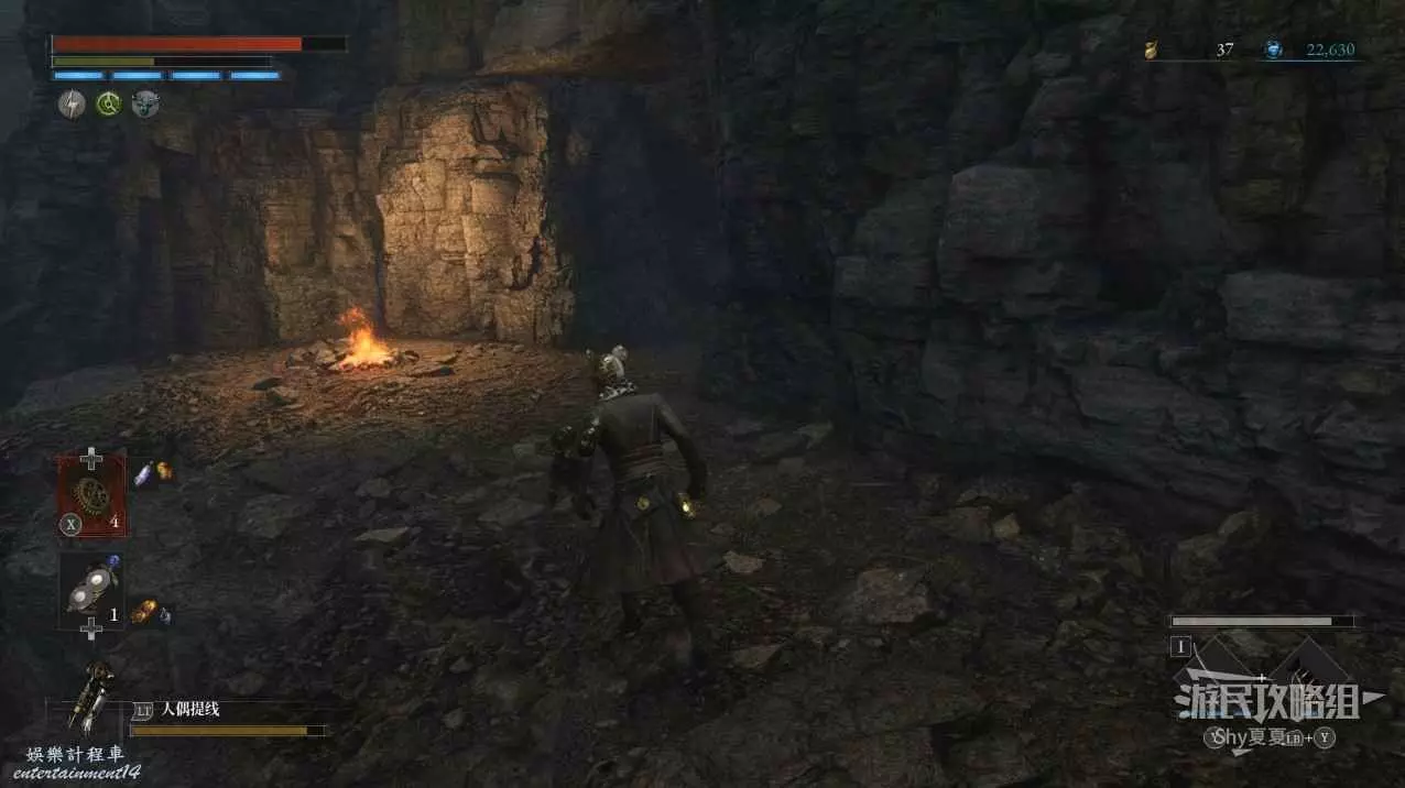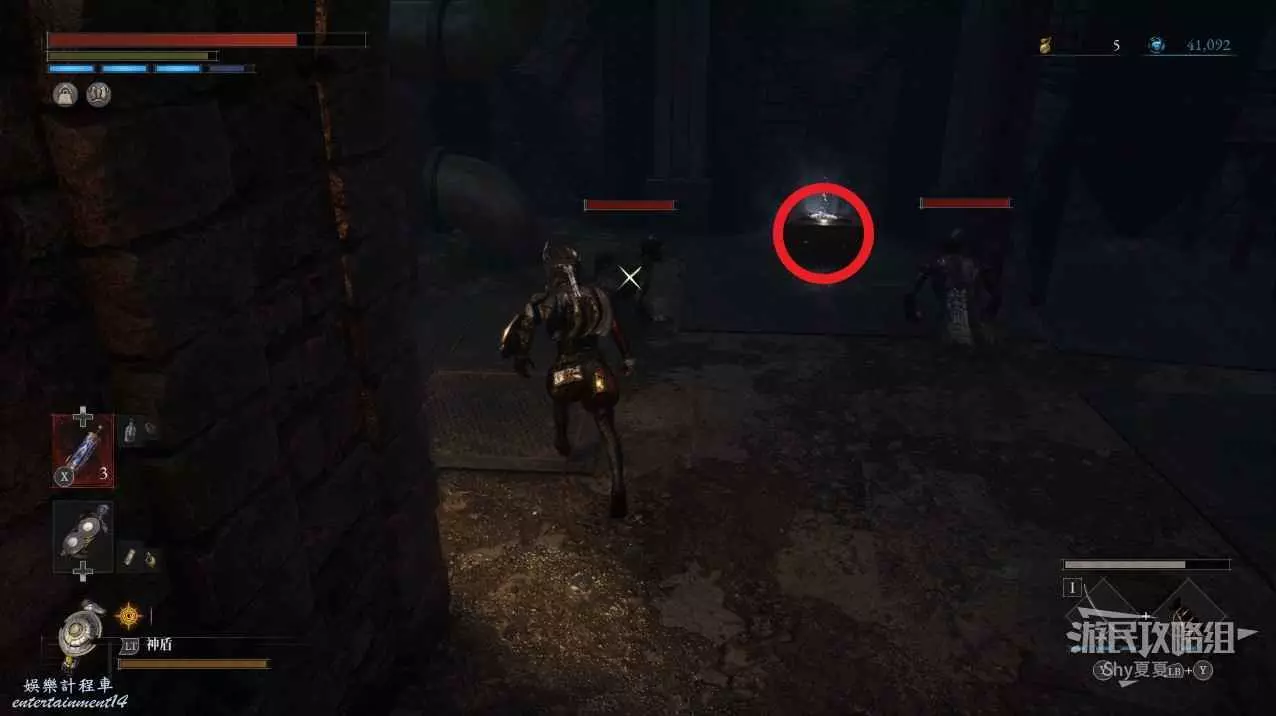 建議從入口走捷徑前進,看到火堆後,繞到士兵後面背刺解決。