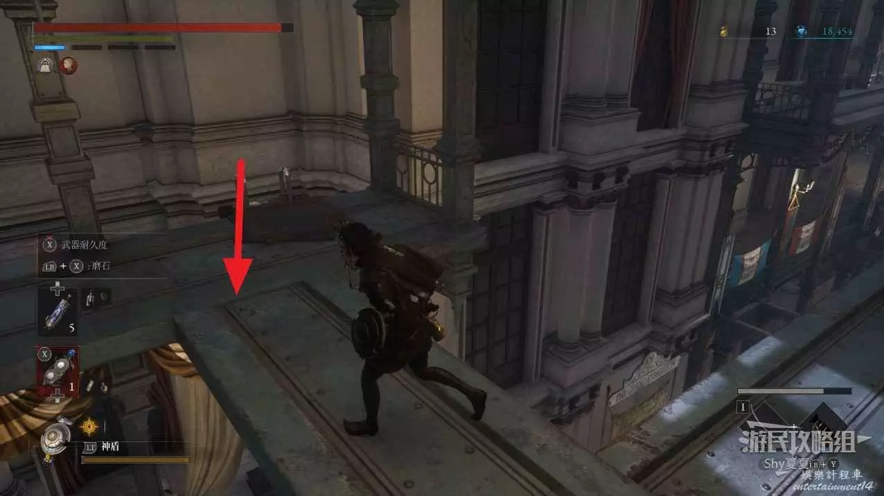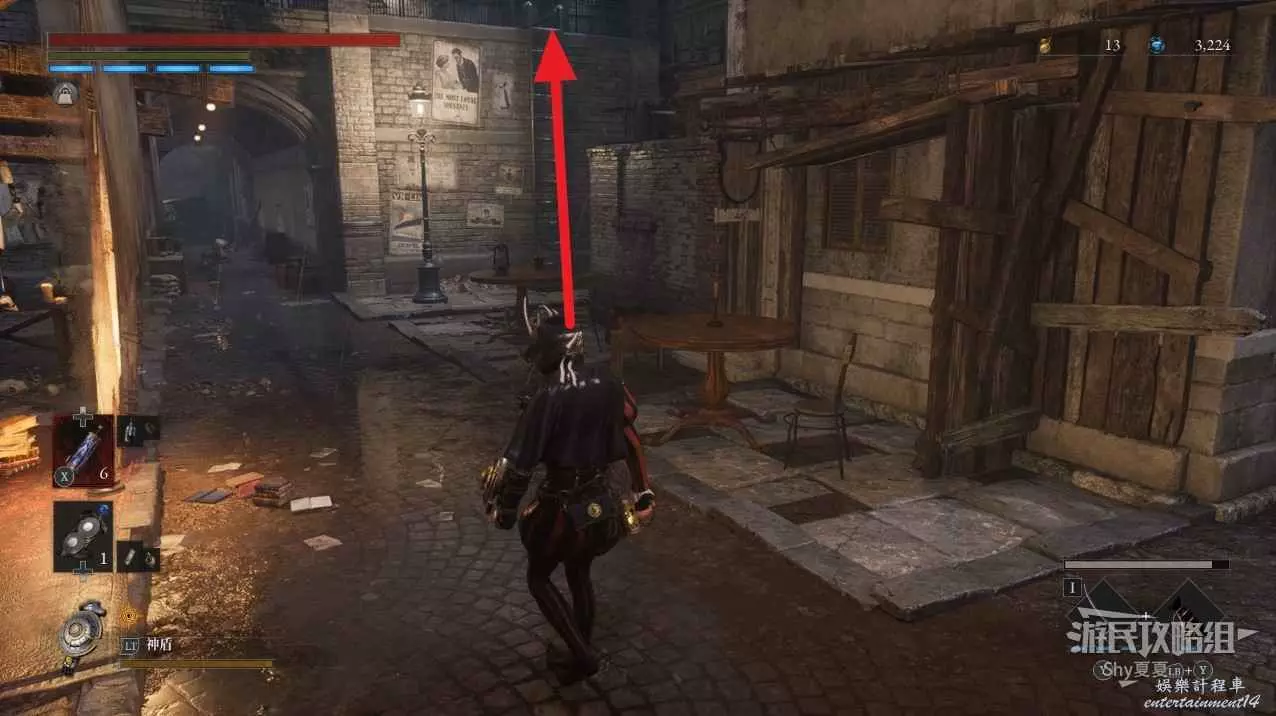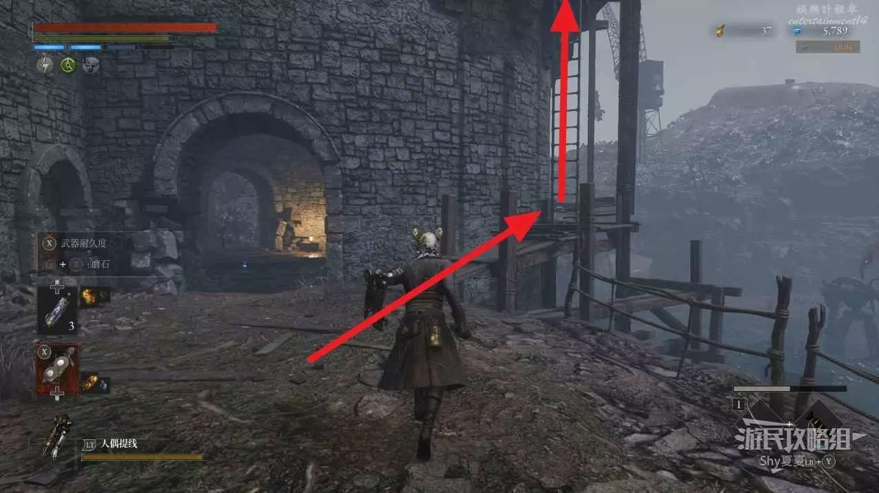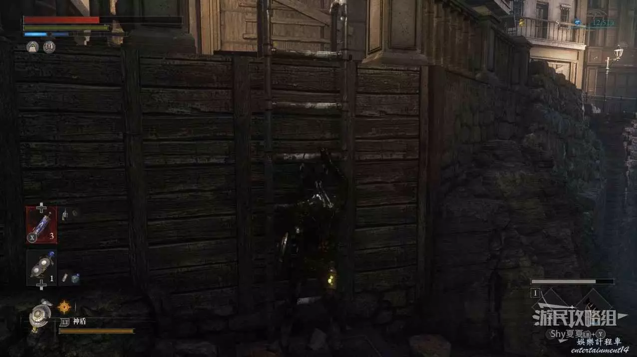 往前走會來到一個類似集市的地方,左側有很多攤位,先不要進前面的門洞,而是從右側牆邊爬上梯子。