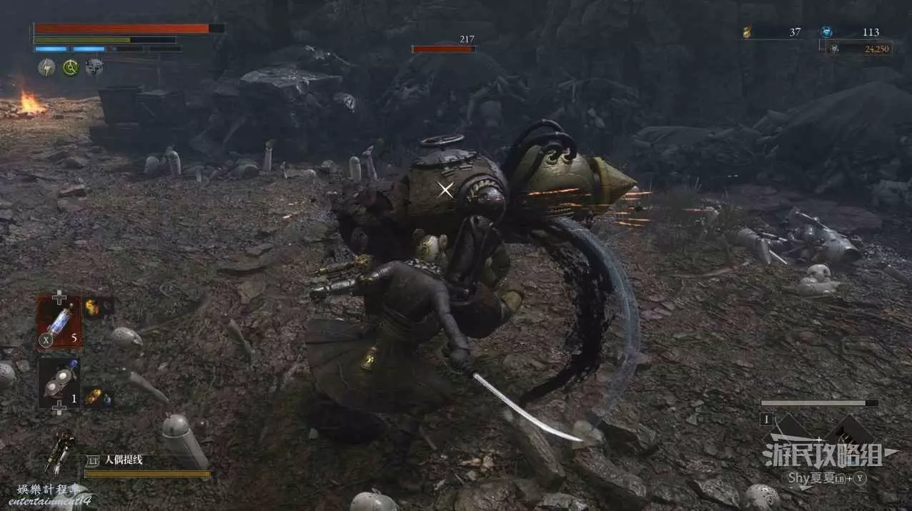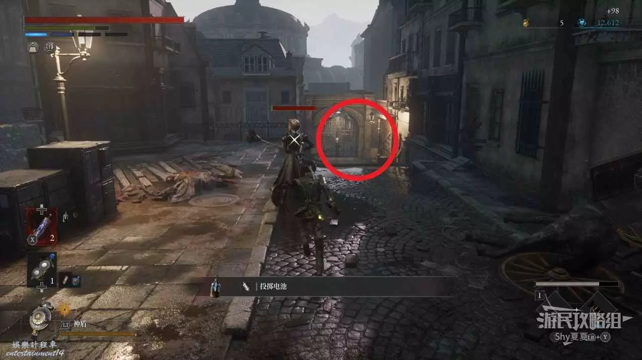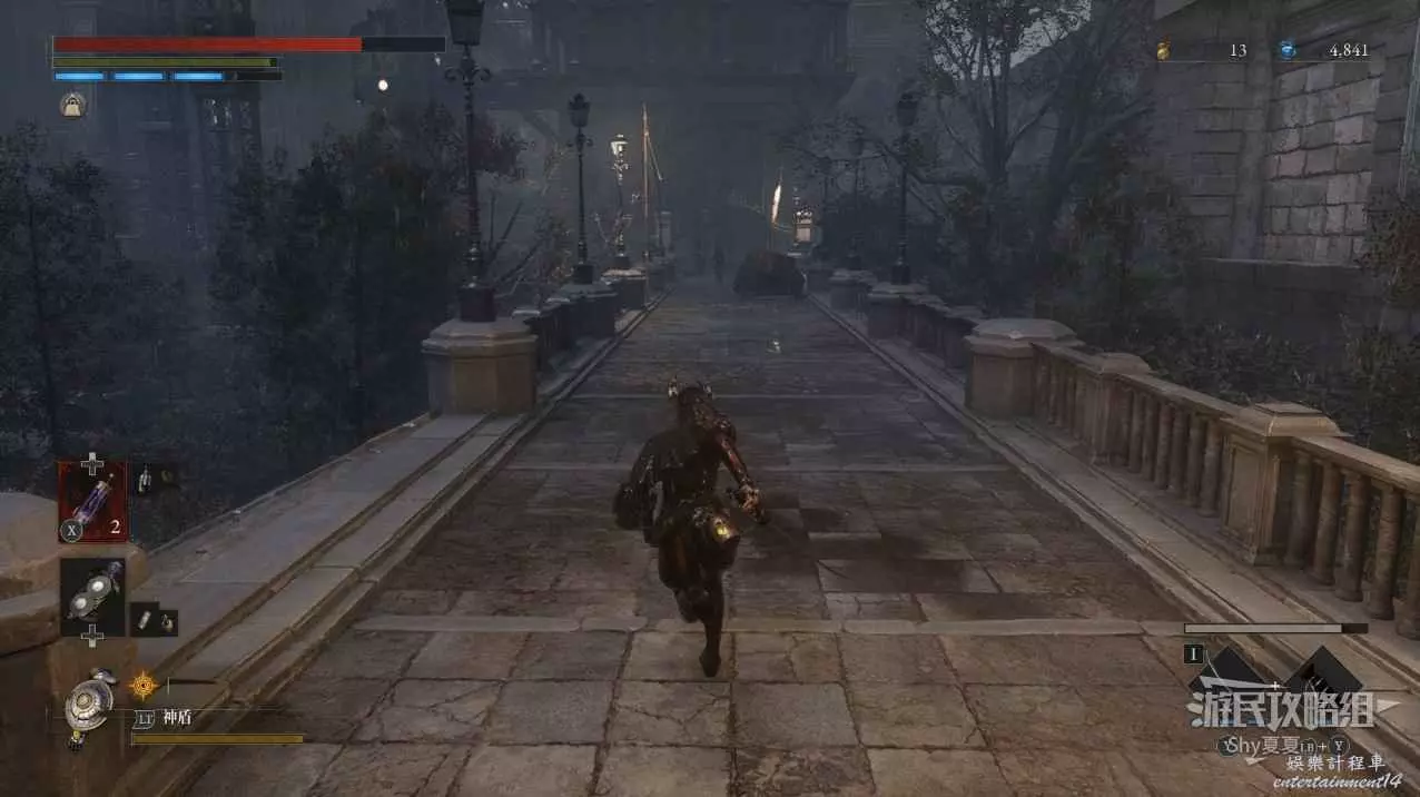 接下來來到一個大廣場,廣場上一共有兩條狗、兩個女僕人偶和一個普通人偶,全部擊敗後,在廣場可以拾取【吉米尼的緊急保護】、【鋸刃】、【軍團彈匣】。