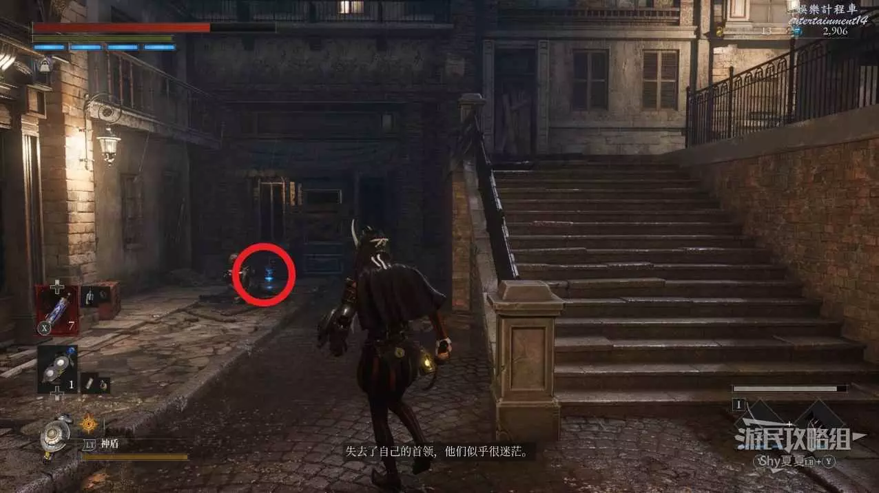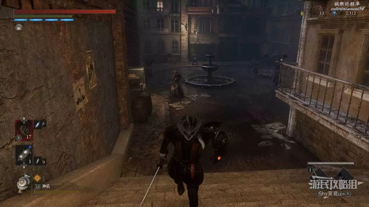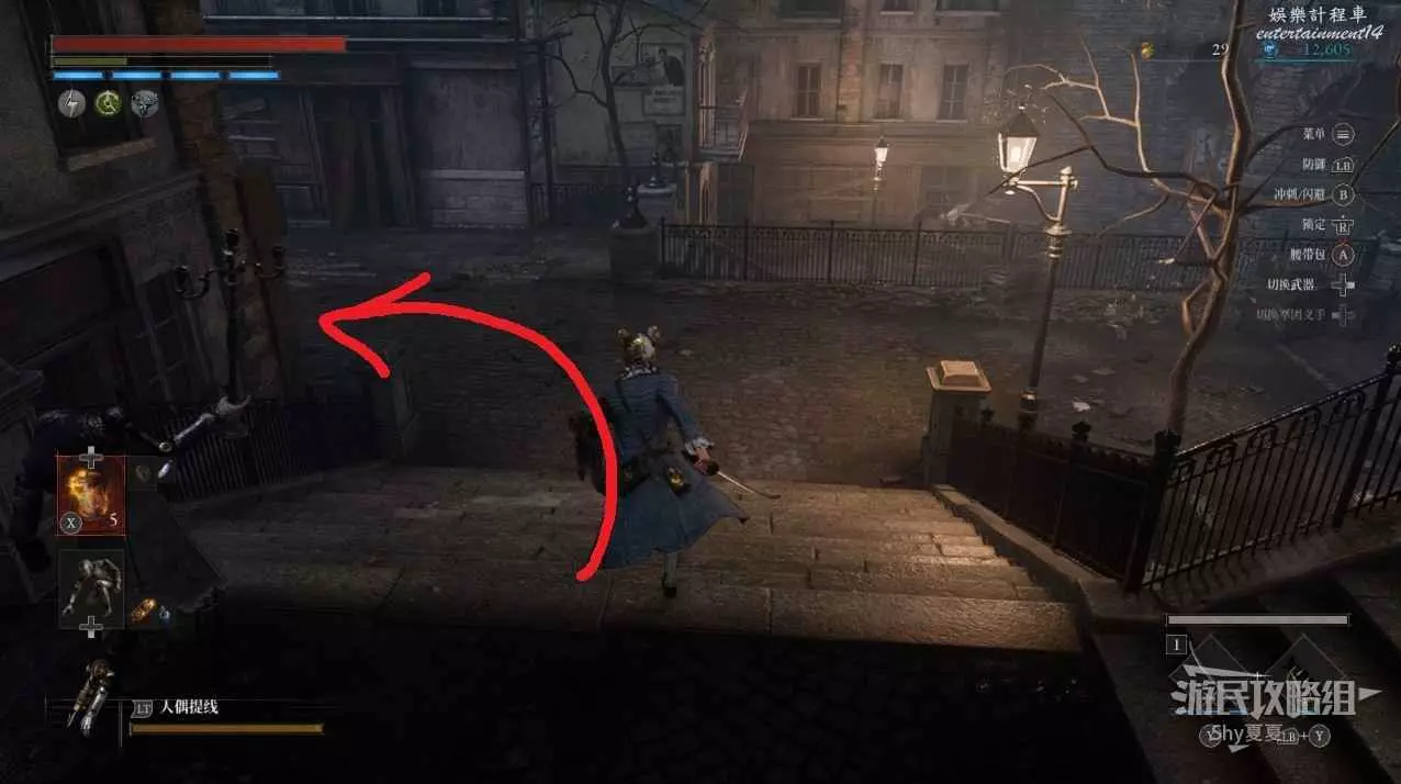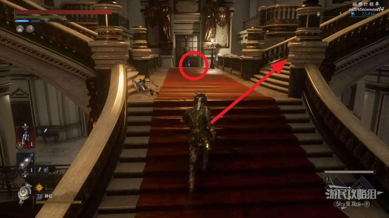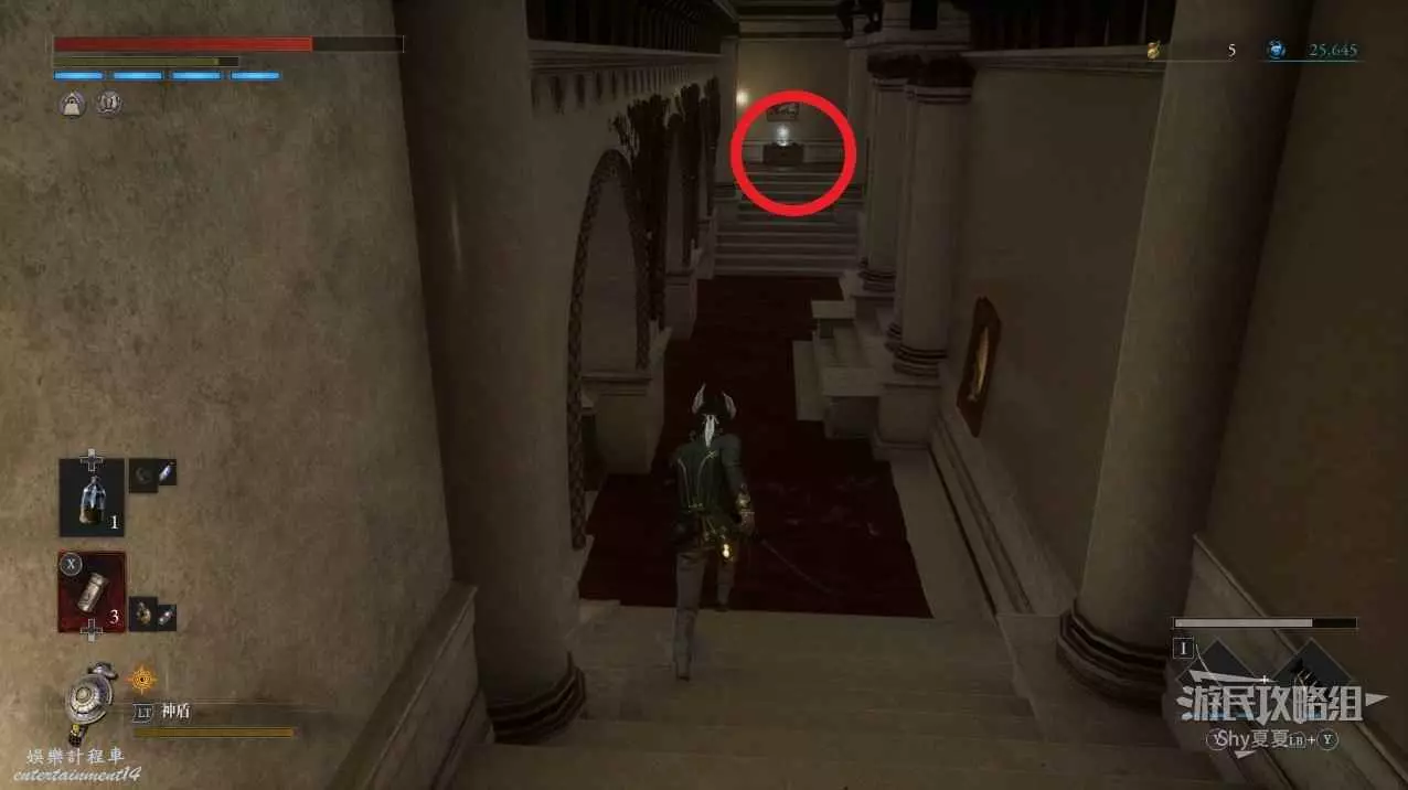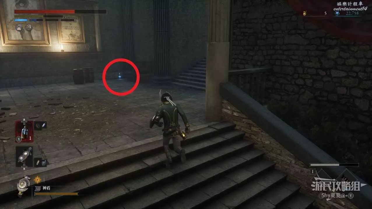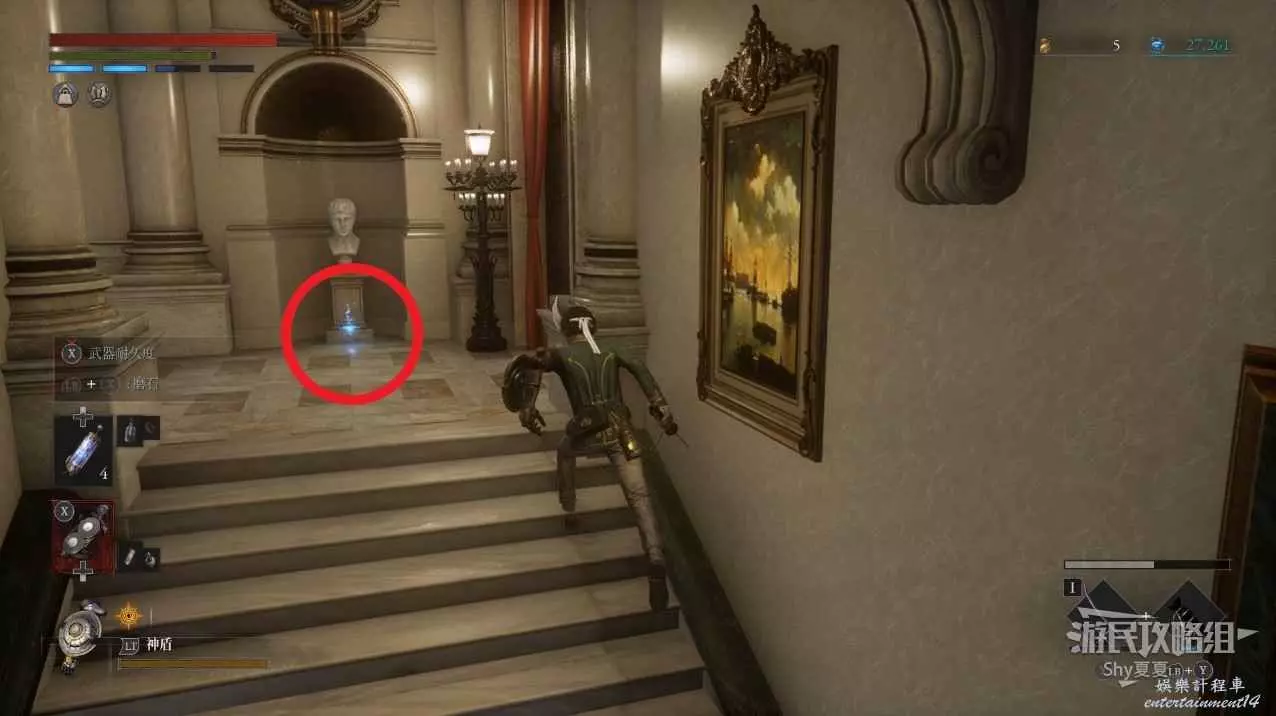 現在在塔的內部,先不要出去,而是轉身,從左側跳到樓梯上,擊殺門口看守的人偶,拾取道具【暗淡自我素碎片(+100)】。