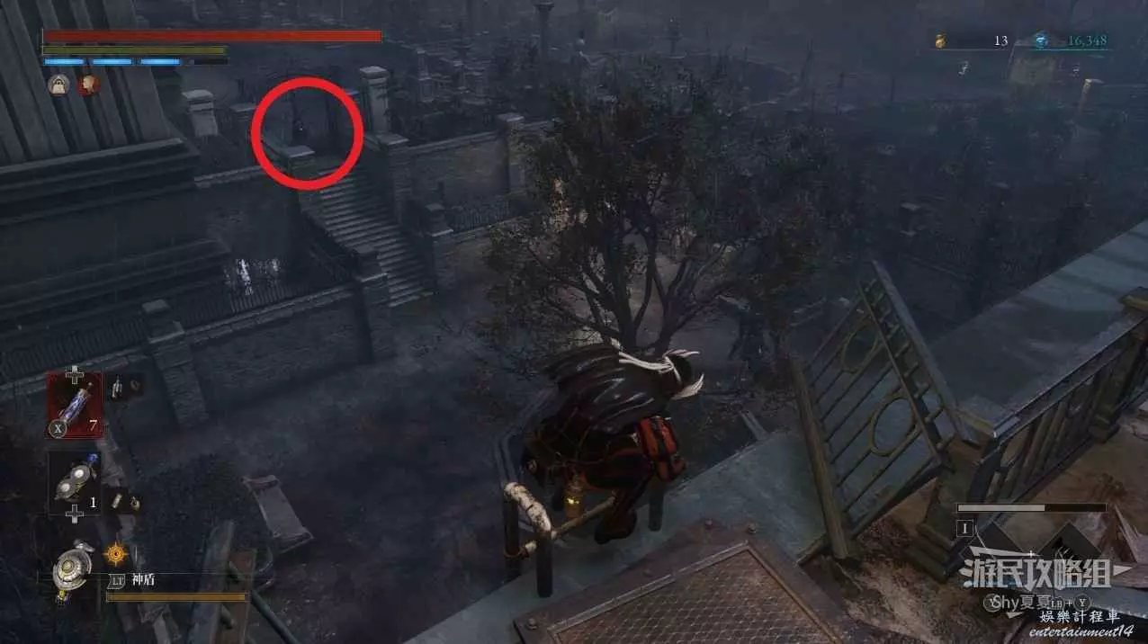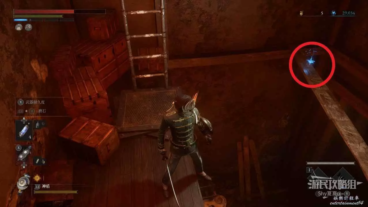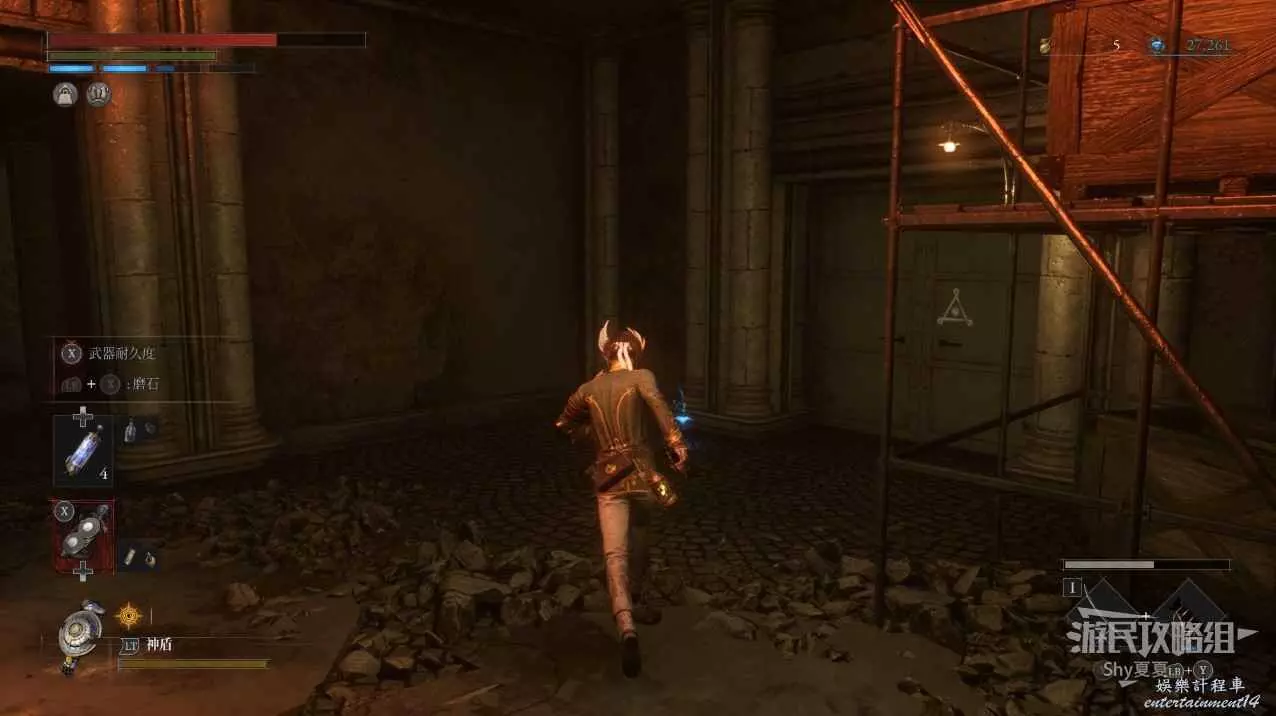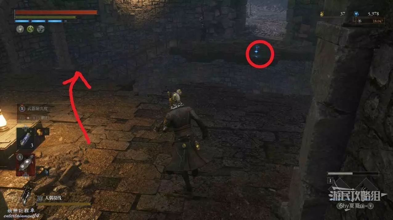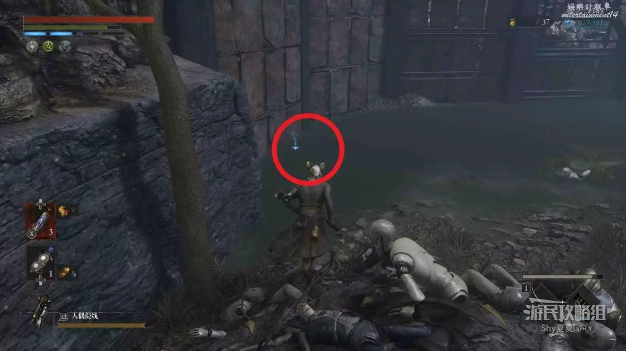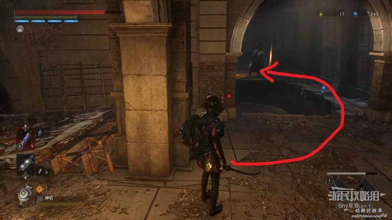 現在在塔的內部,先不要出去,而是轉身,從左側跳到樓梯上,擊殺門口看守的人偶,拾取道具【暗淡自我素碎片(+100)】。