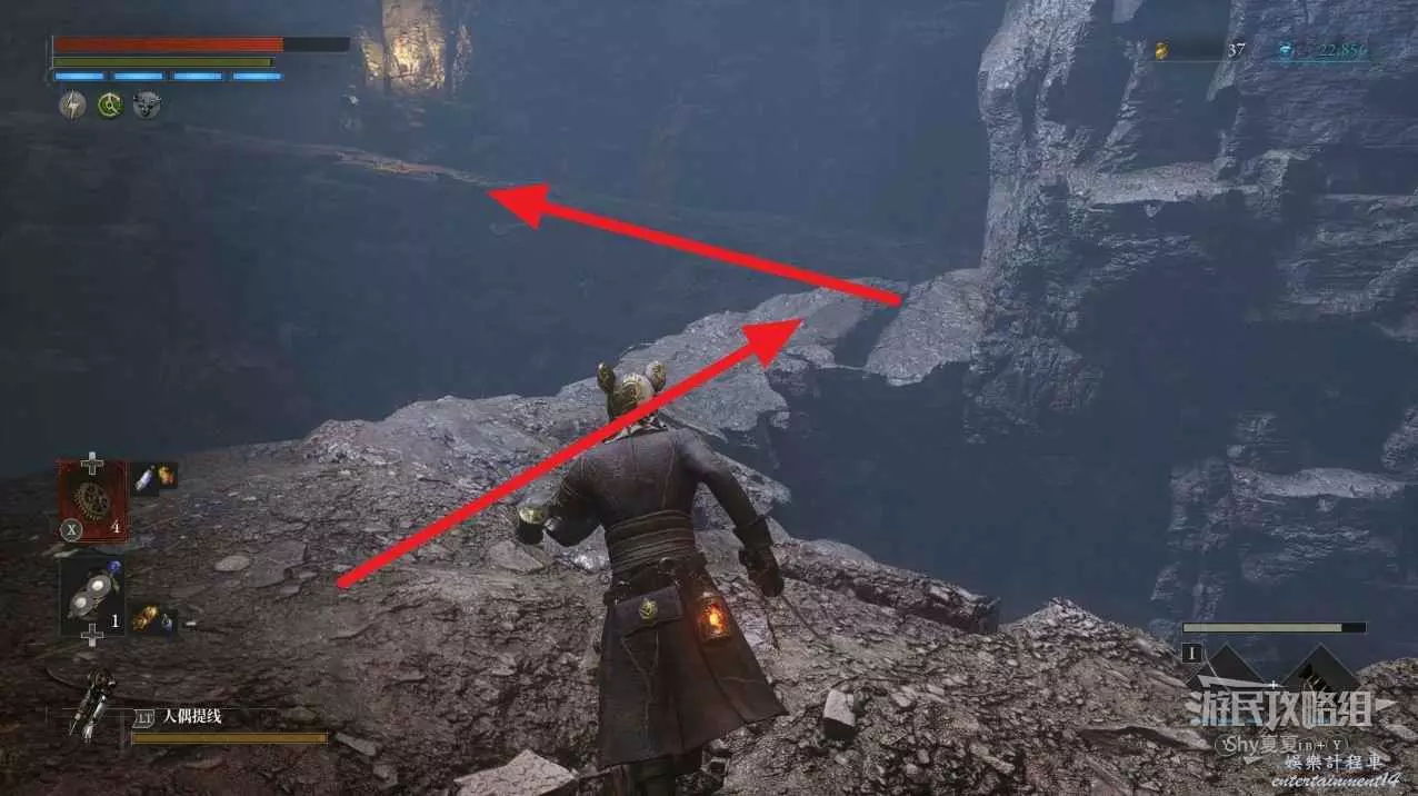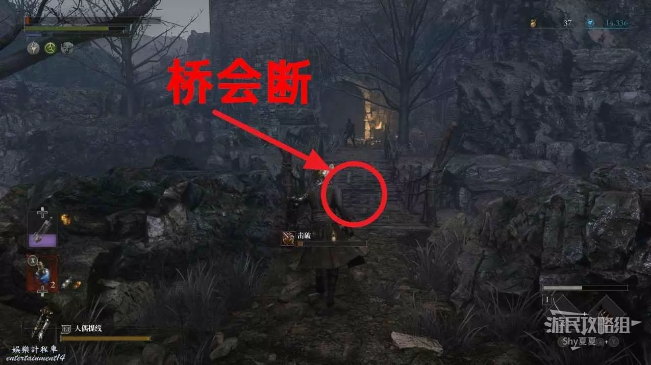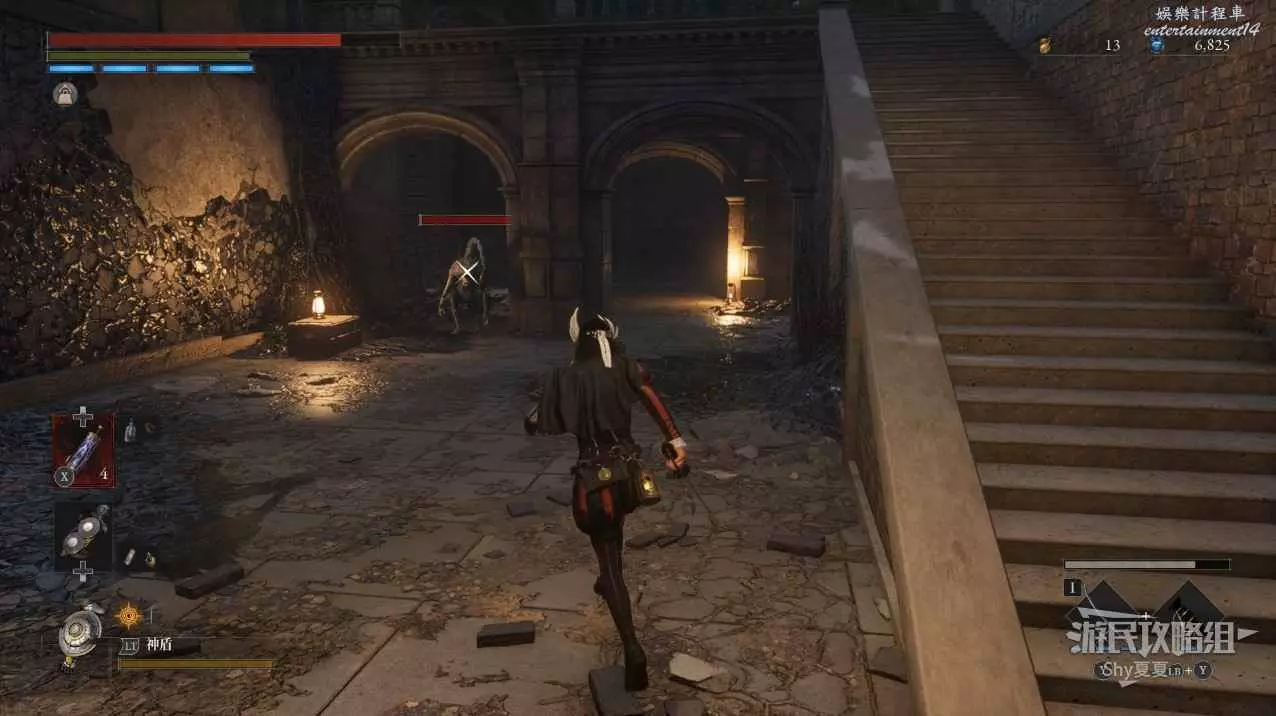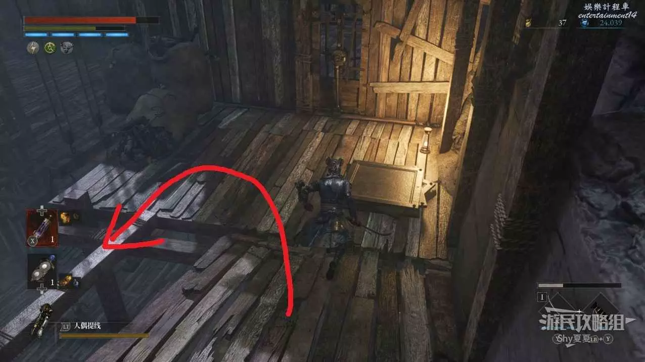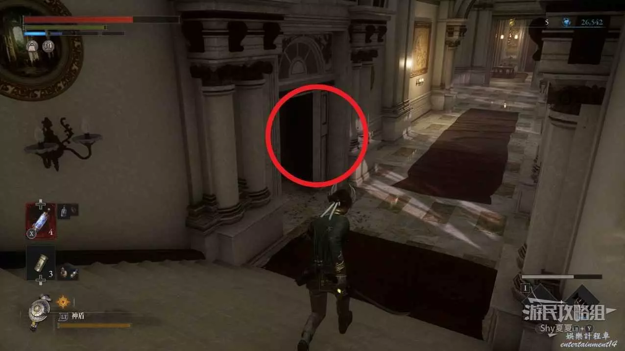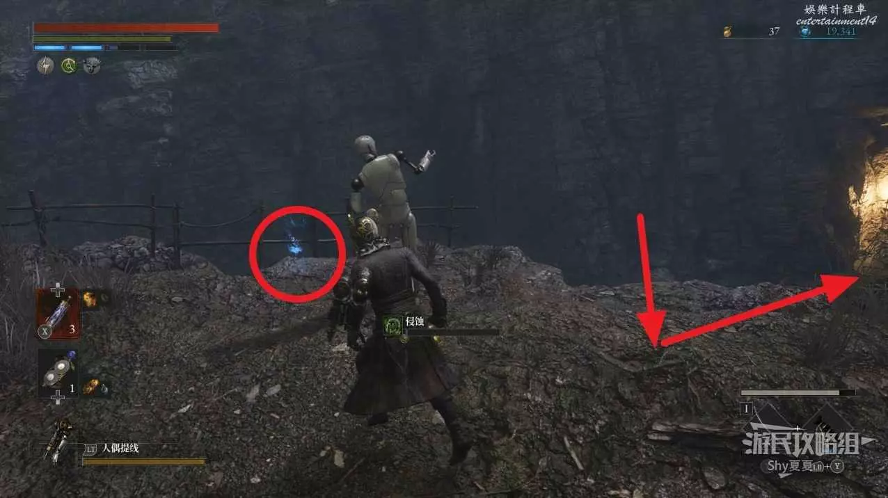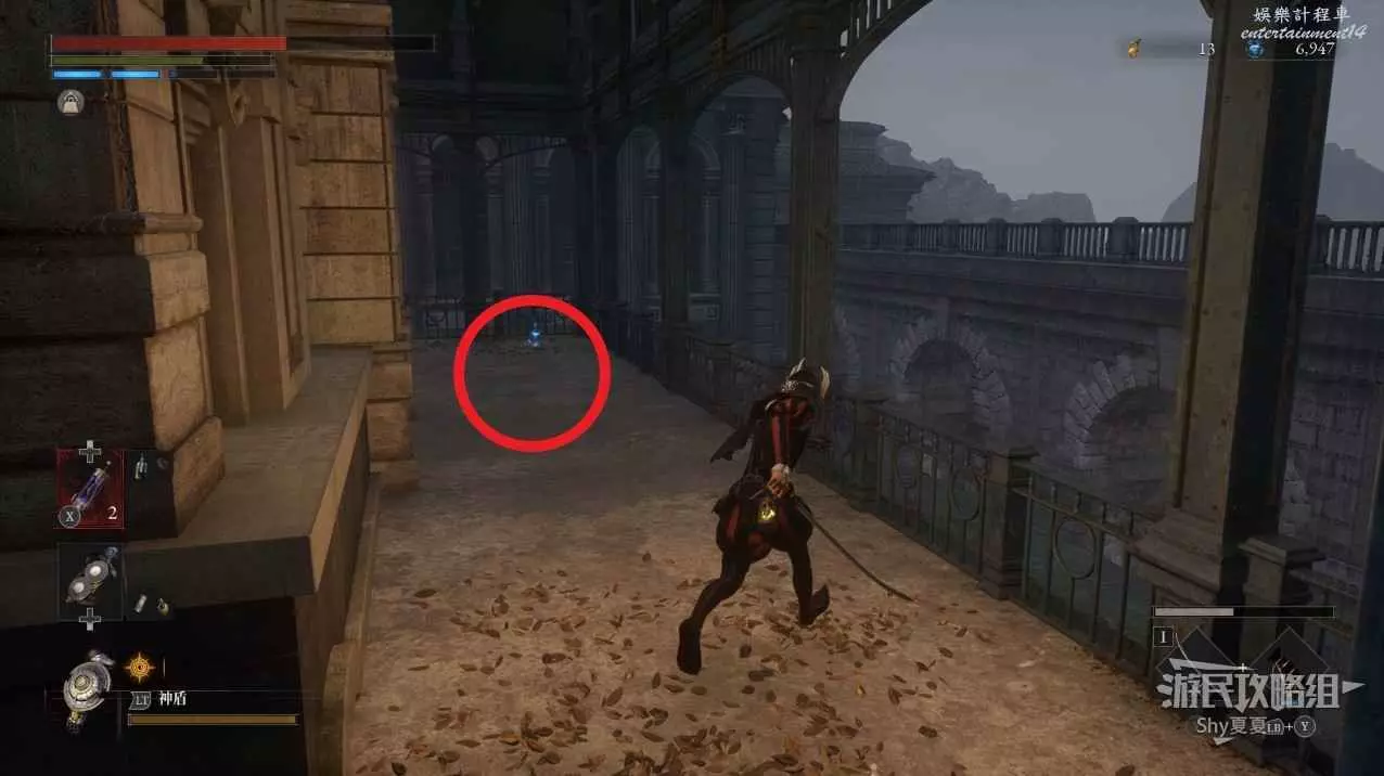 現在在塔的內部,先不要出去,而是轉身,從左側跳到樓梯上,擊殺門口看守的人偶,拾取道具【暗淡自我素碎片(+100)】。