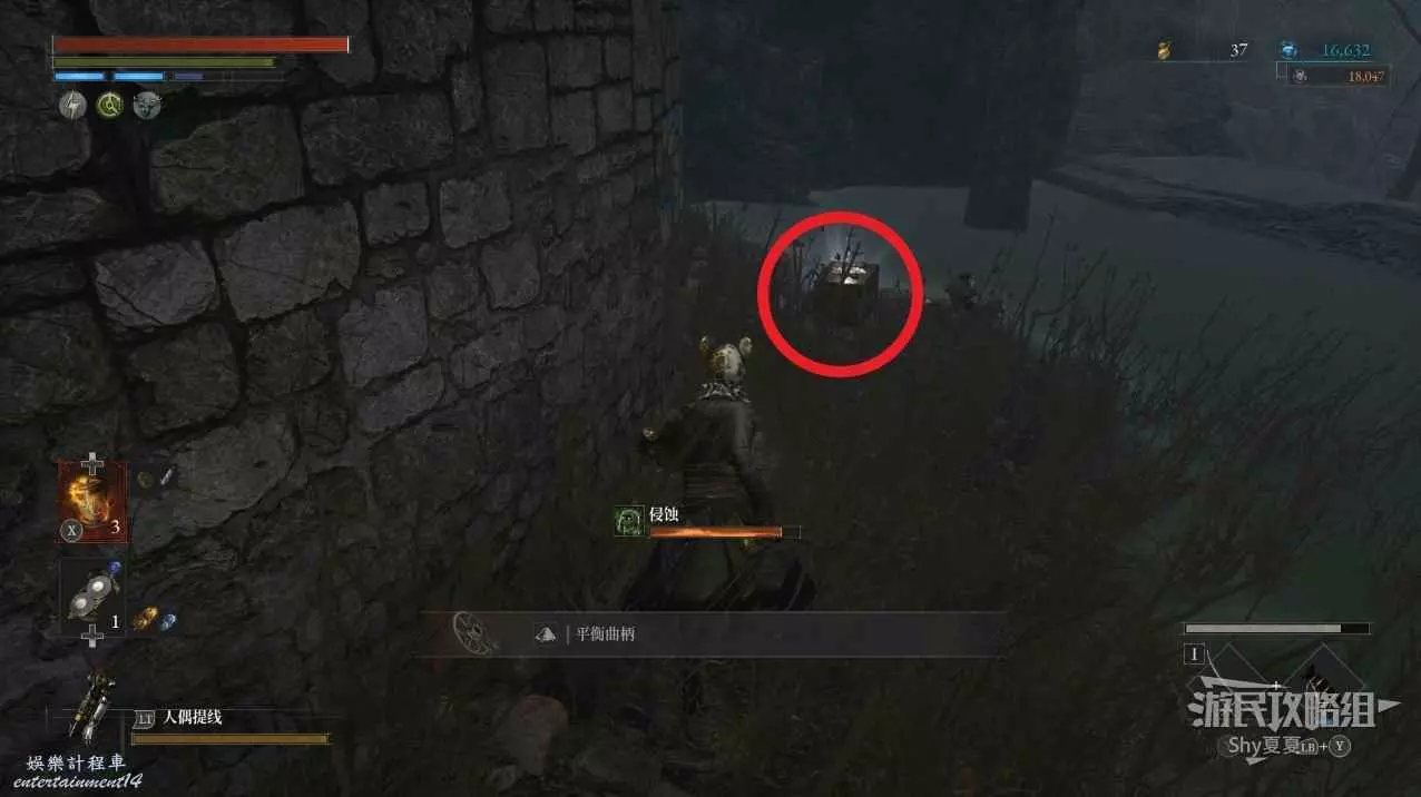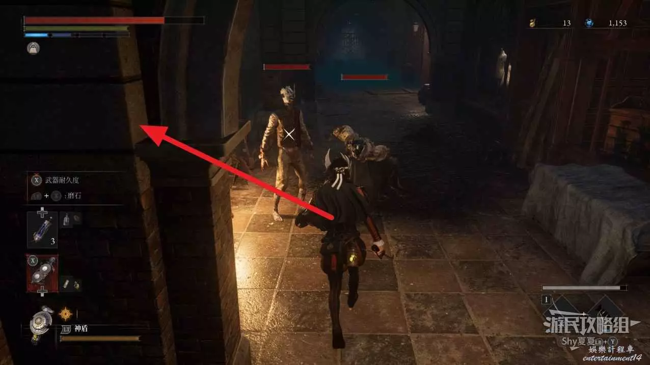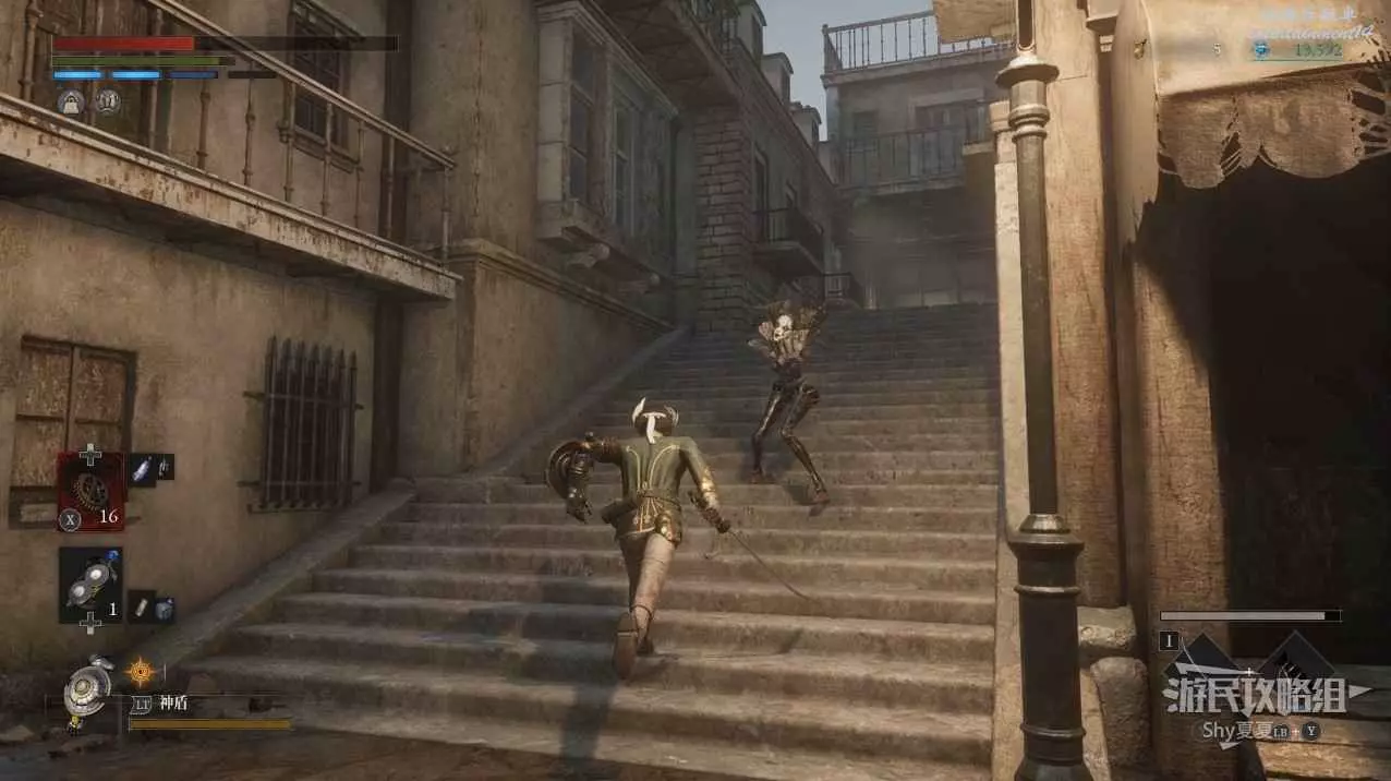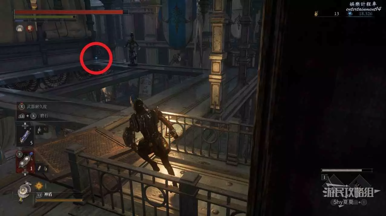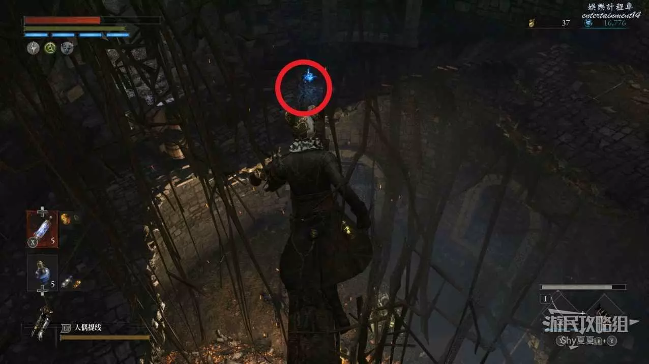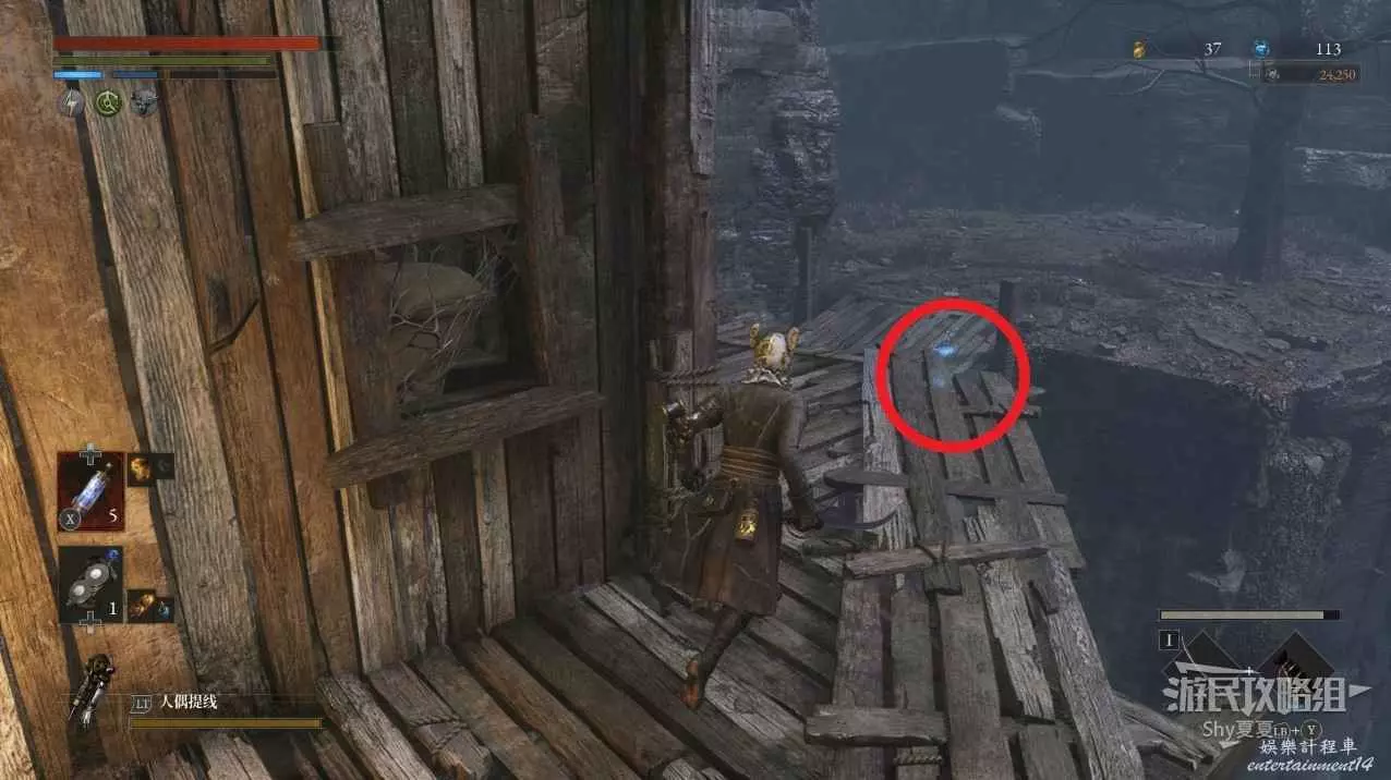 現在在塔的內部,先不要出去,而是轉身,從左側跳到樓梯上,擊殺門口看守的人偶,拾取道具【暗淡自我素碎片(+100)】。