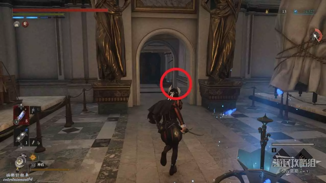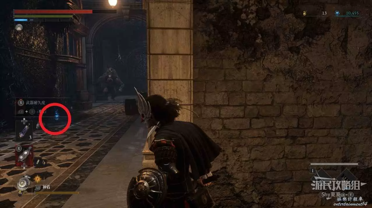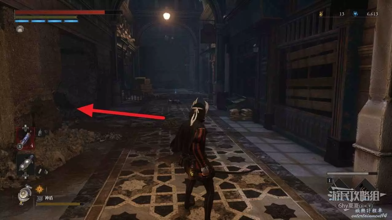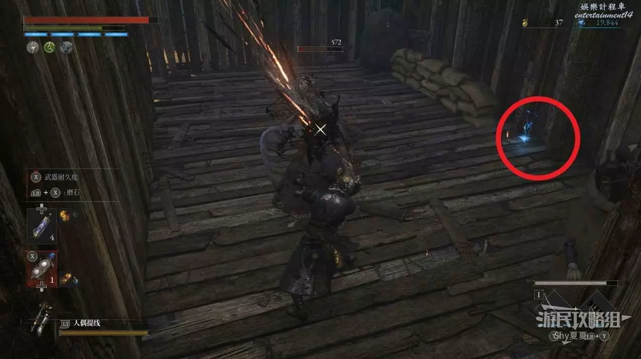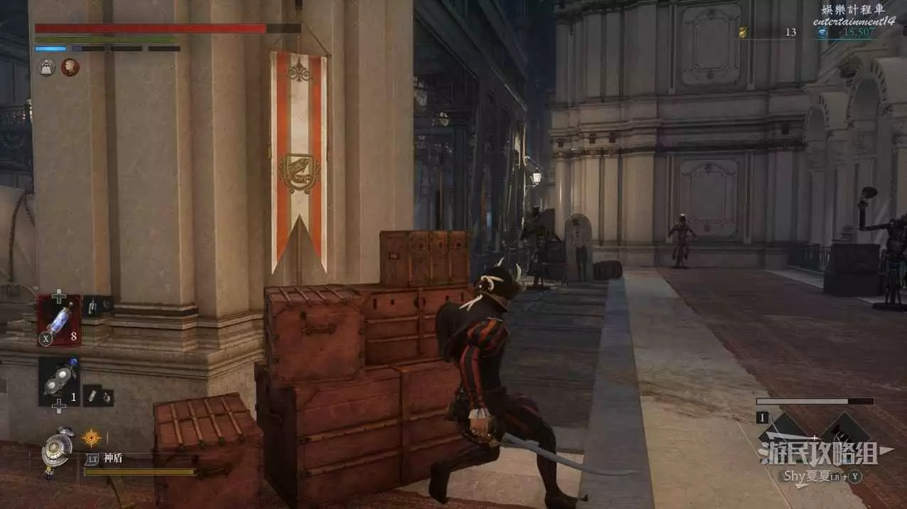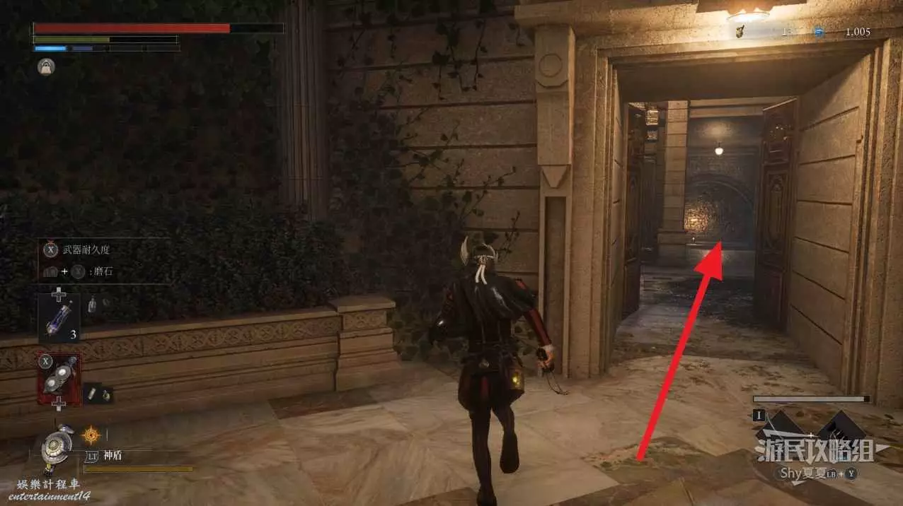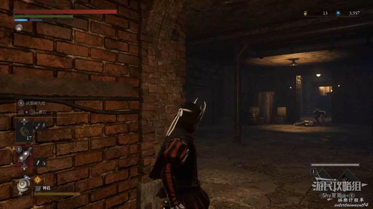 現在在塔的內部,先不要出去,而是轉身,從左側跳到樓梯上,擊殺門口看守的人偶,拾取道具【暗淡自我素碎片(+100)】。