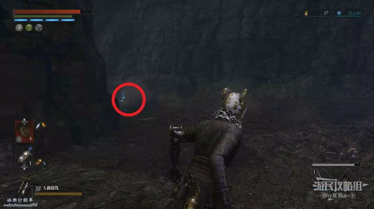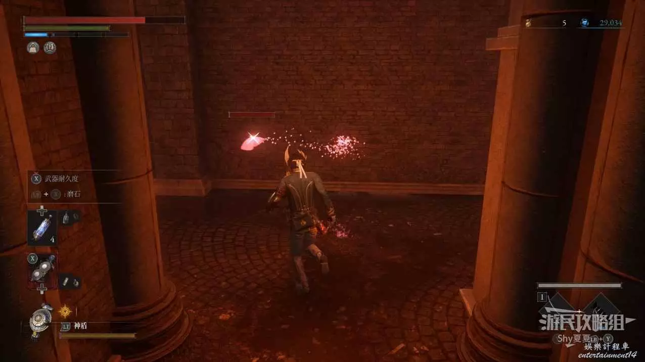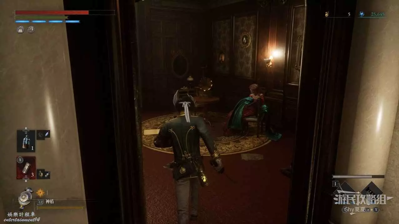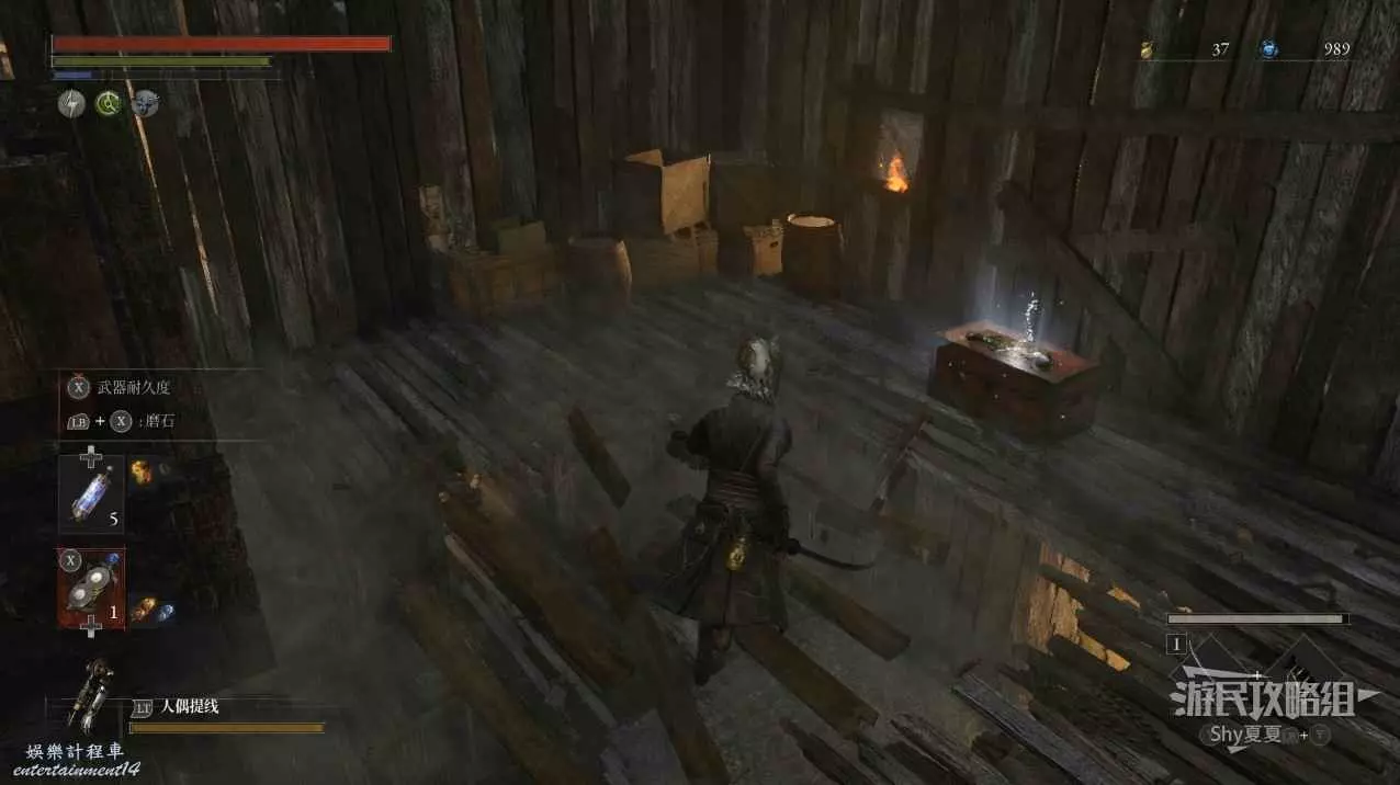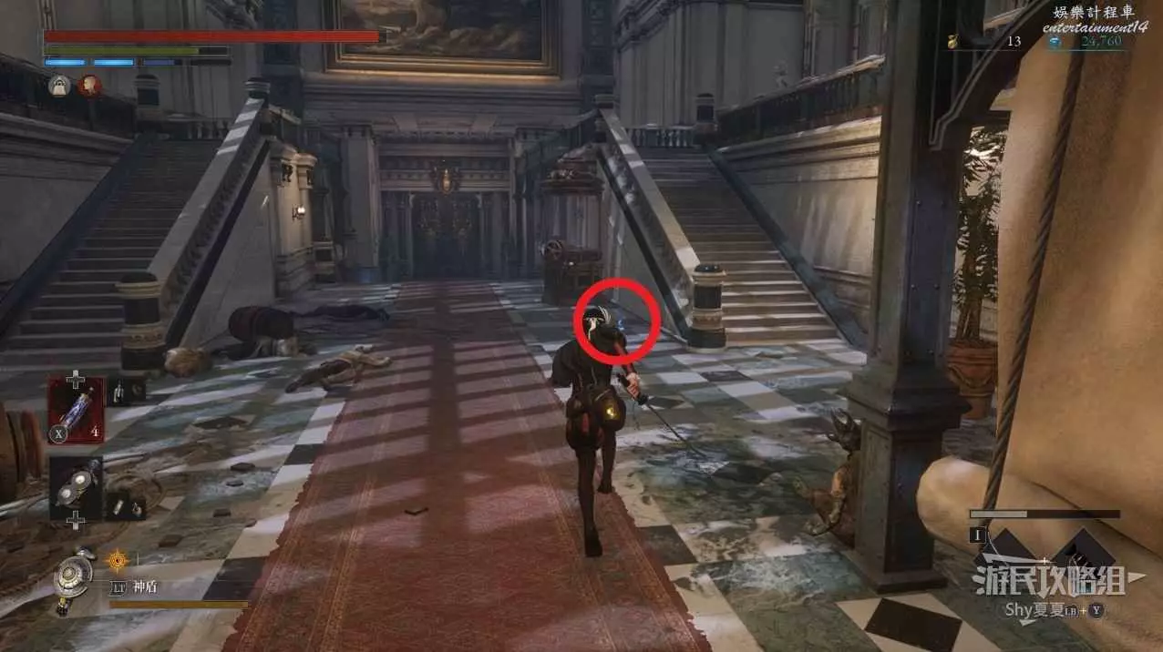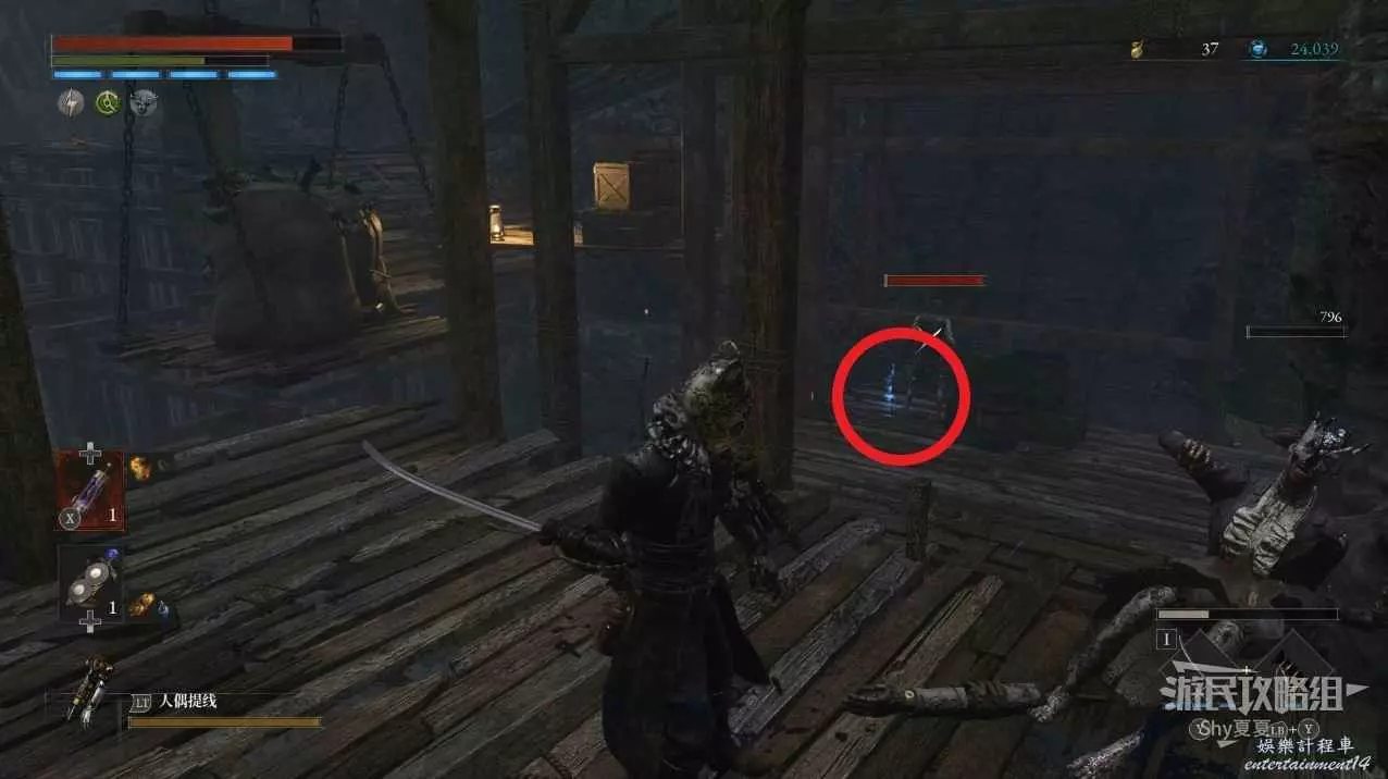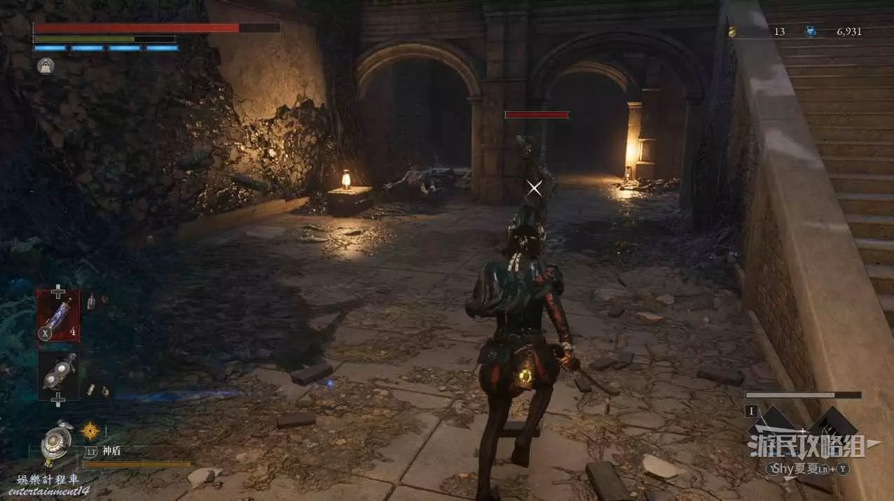 現在在塔的內部,先不要出去,而是轉身,從左側跳到樓梯上,擊殺門口看守的人偶,拾取道具【暗淡自我素碎片(+100)】。