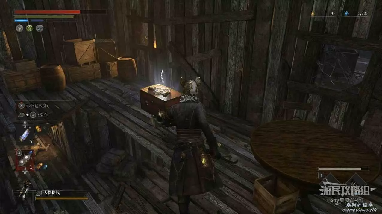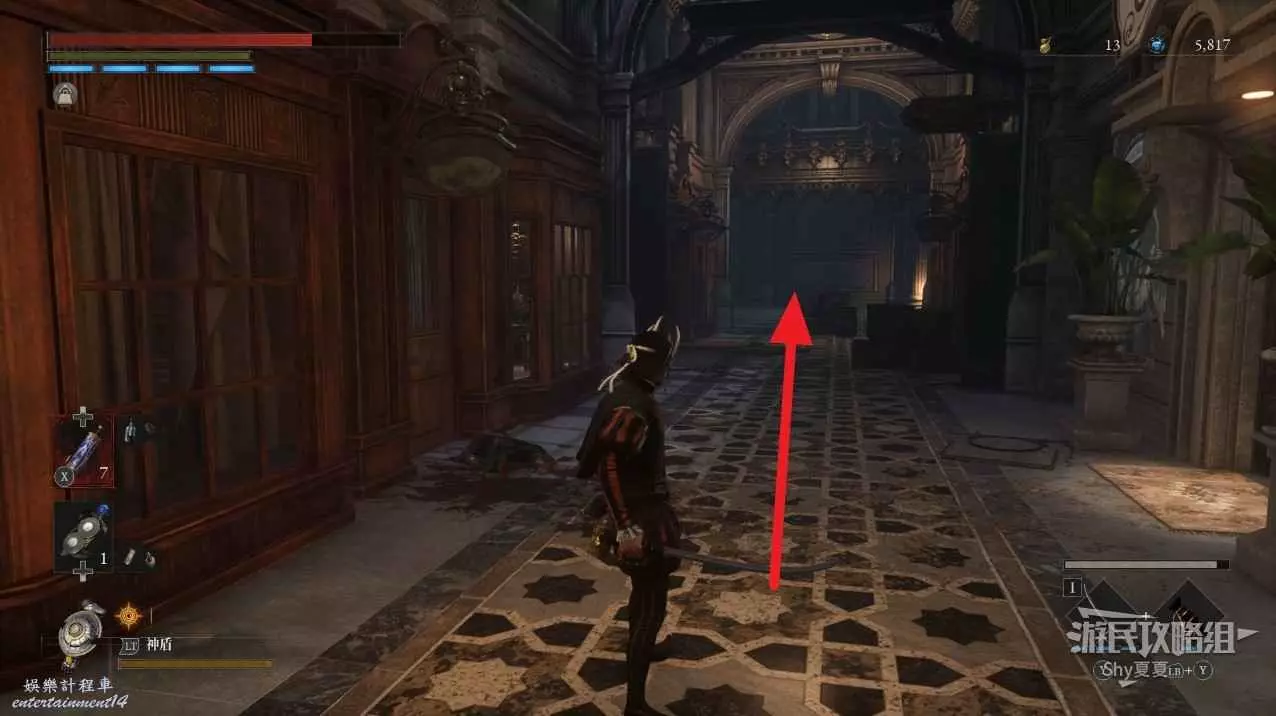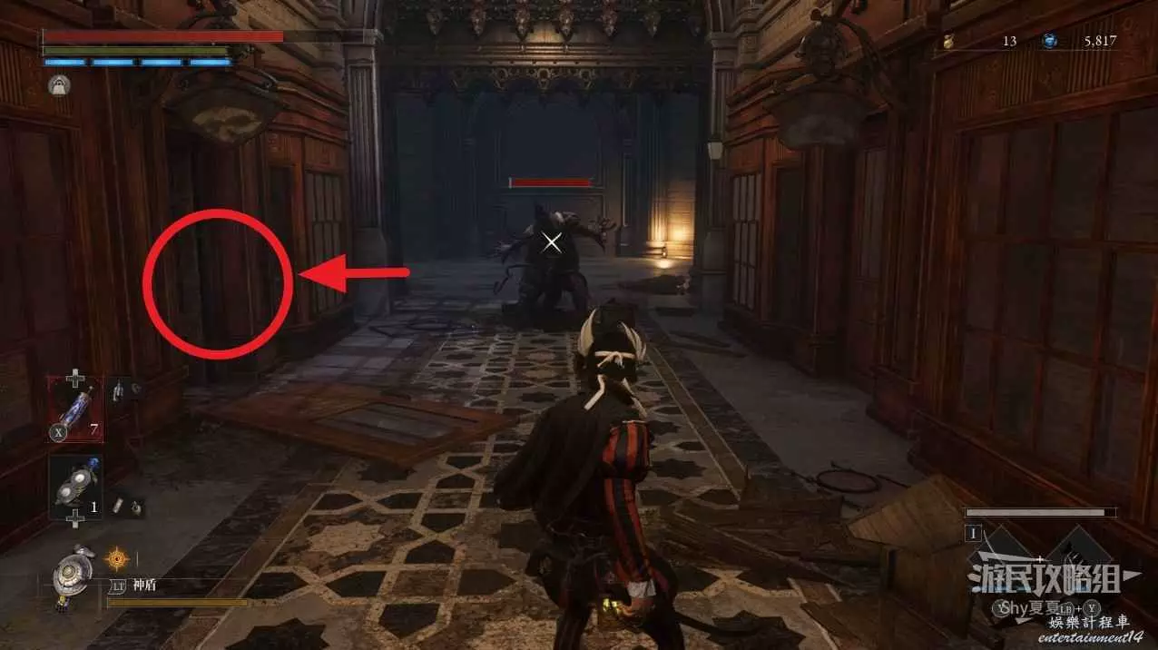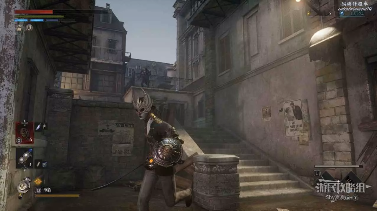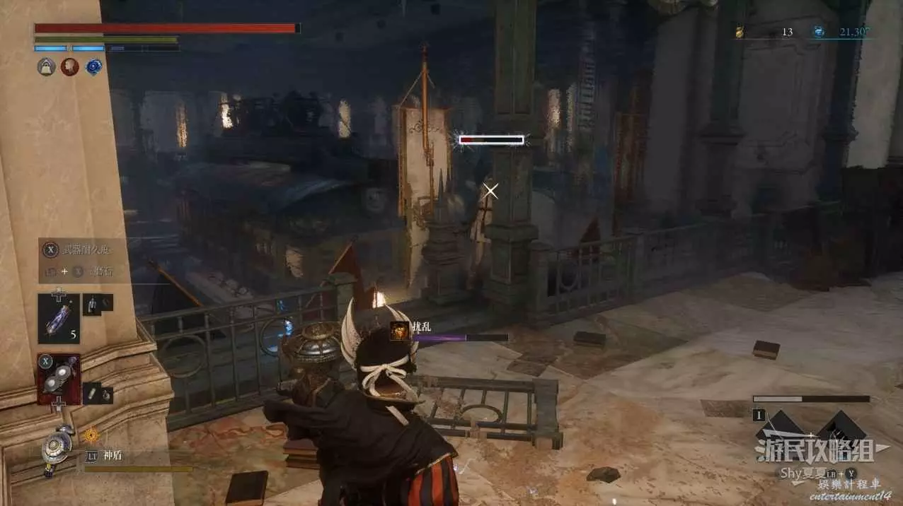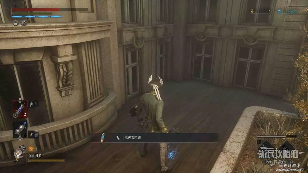 現在在塔的內部,先不要出去,而是轉身,從左側跳到樓梯上,擊殺門口看守的人偶,拾取道具【暗淡自我素碎片(+100)】。