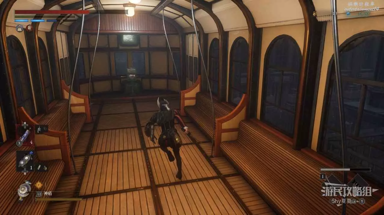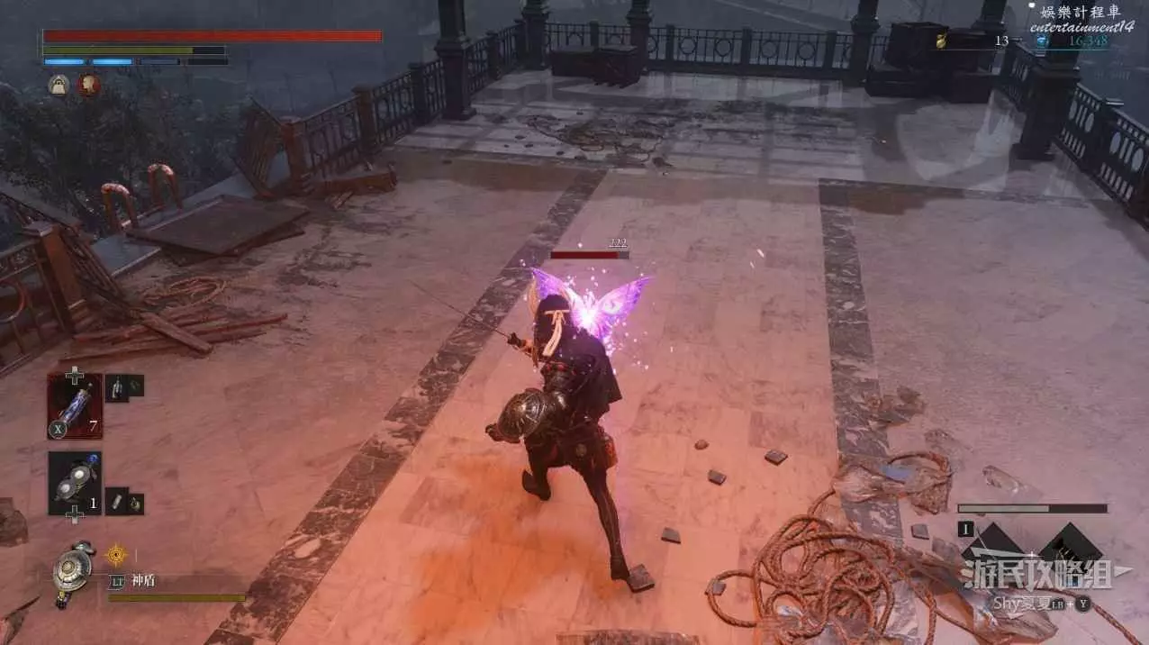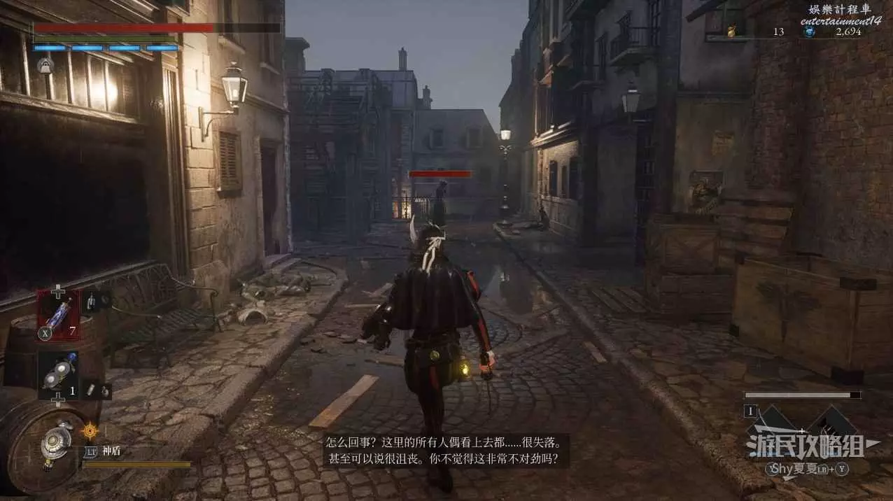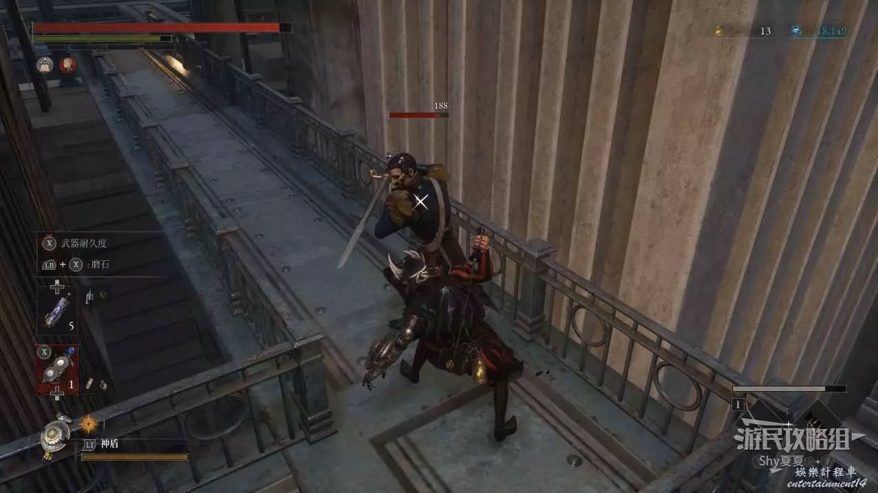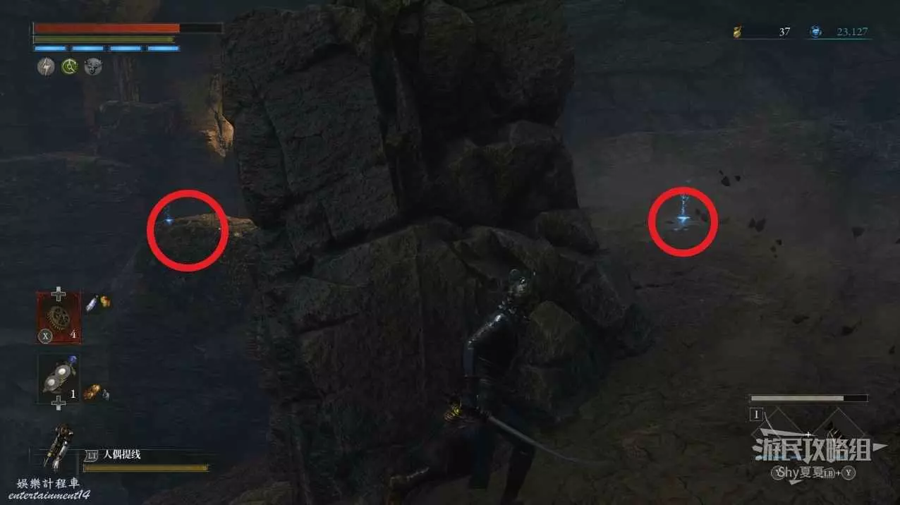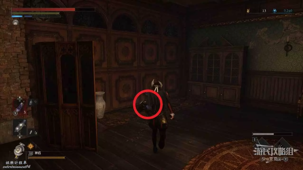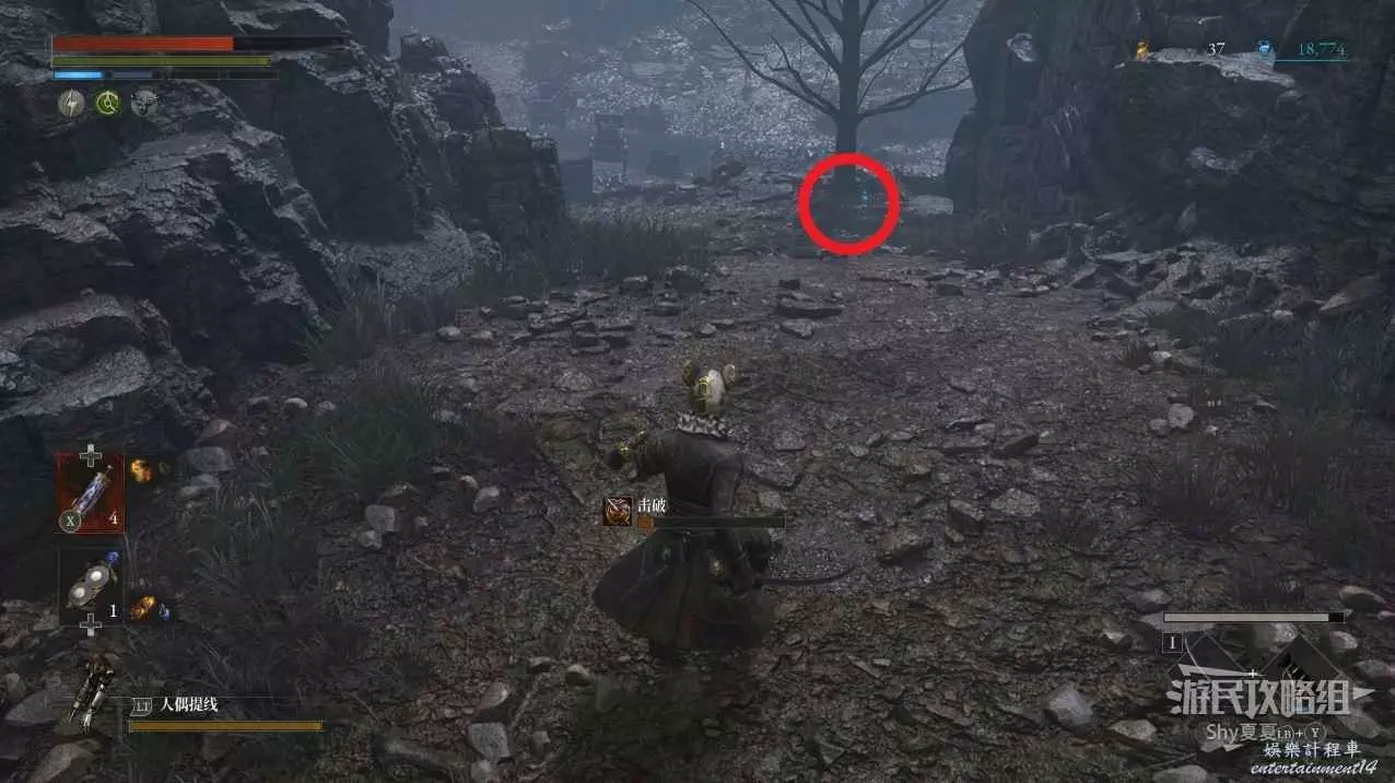 現在在塔的內部,先不要出去,而是轉身,從左側跳到樓梯上,擊殺門口看守的人偶,拾取道具【暗淡自我素碎片(+100)】。