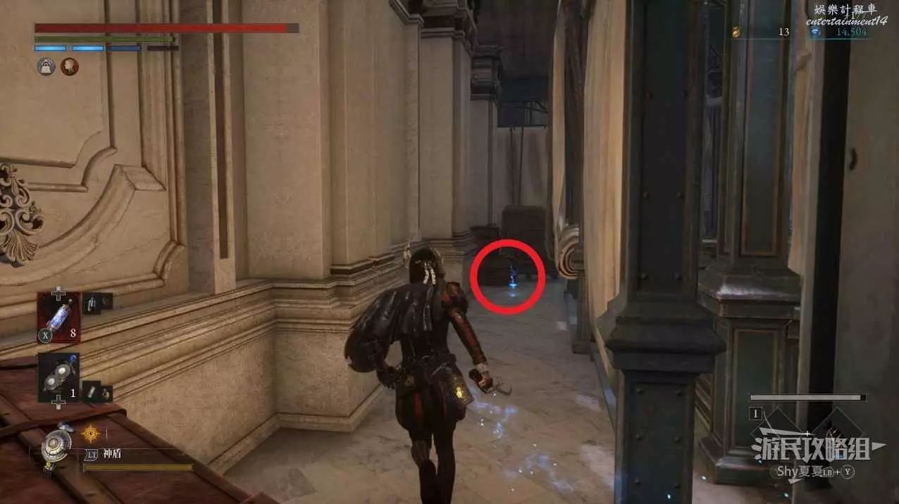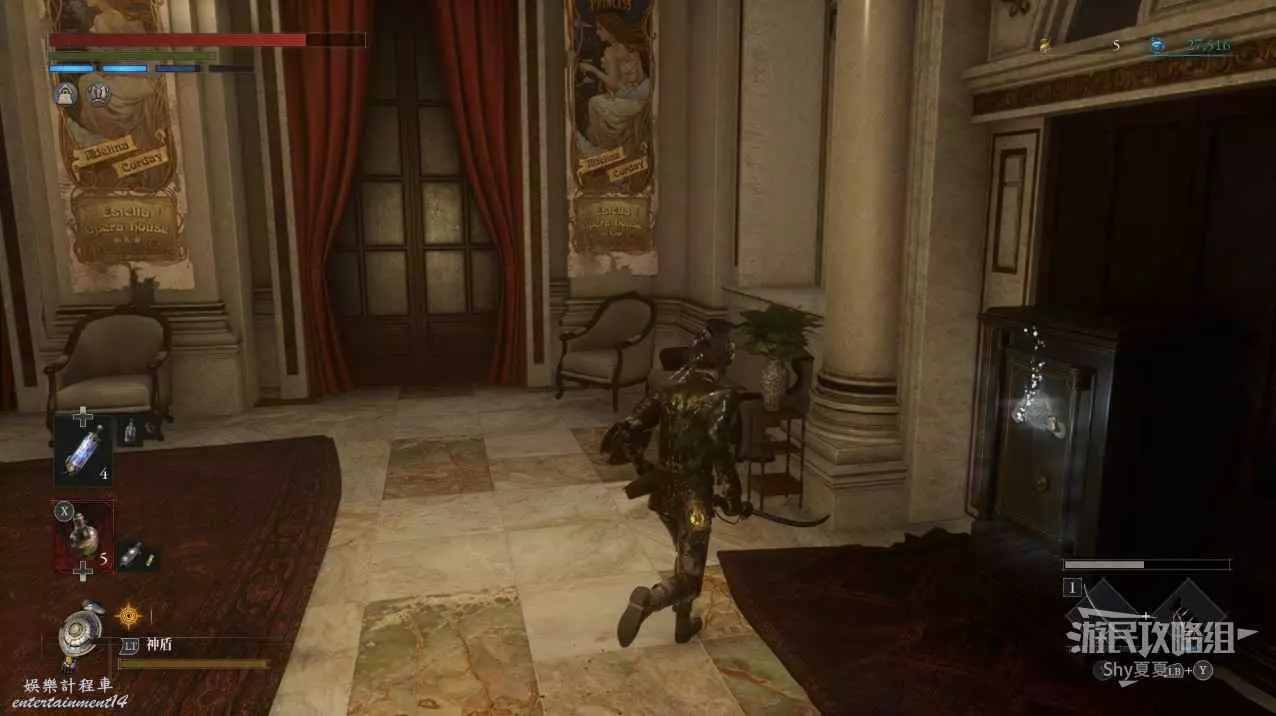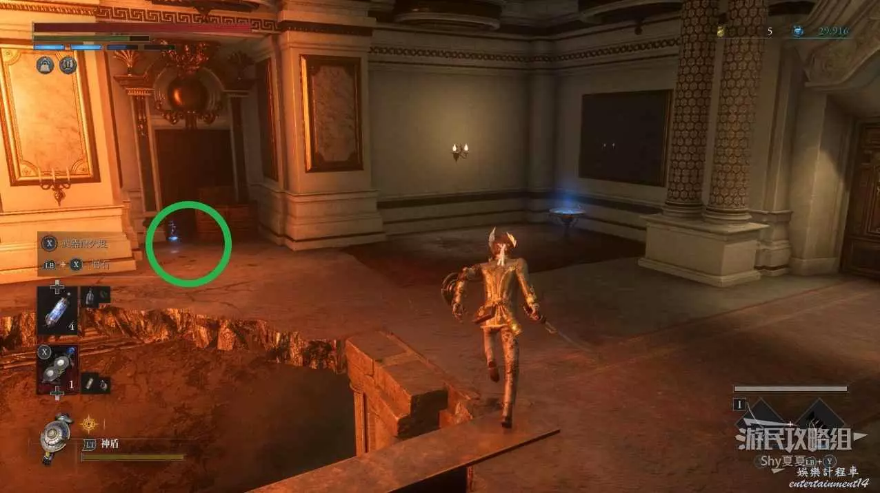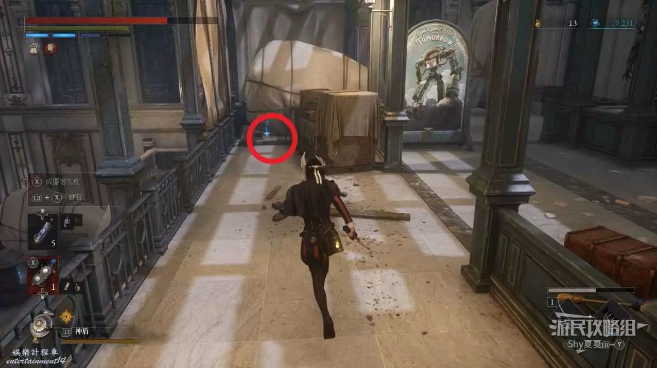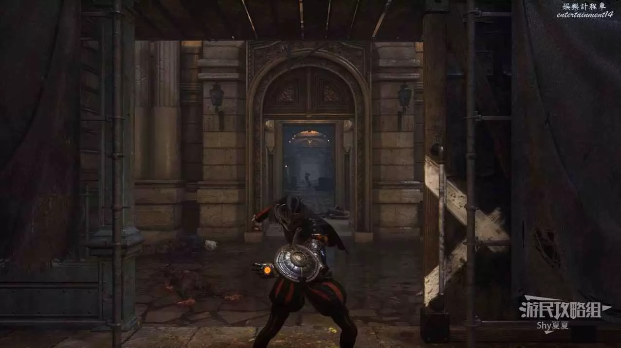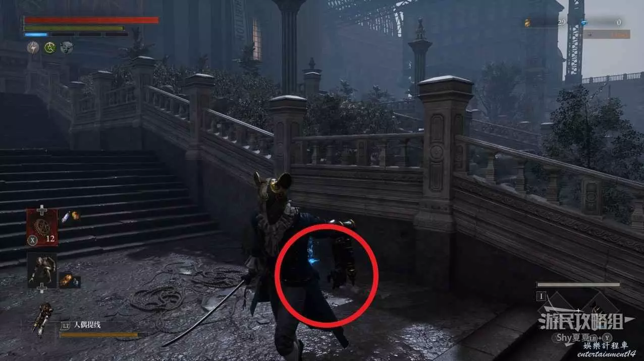 打開前方建築的大門,進入歌劇院,首先盡頭的門暫時無法打開,但是門口可以拾取【特殊淨化安瓶】,建議大家先走右側上樓,會遇到提線木偶,如果被其攻擊到會進入擾亂狀態,當擾亂條滿後會立即死亡,可以用【特殊淨化安瓶】接觸此狀態。一層的欄杆可以拾取【契約暗月月光石】。
