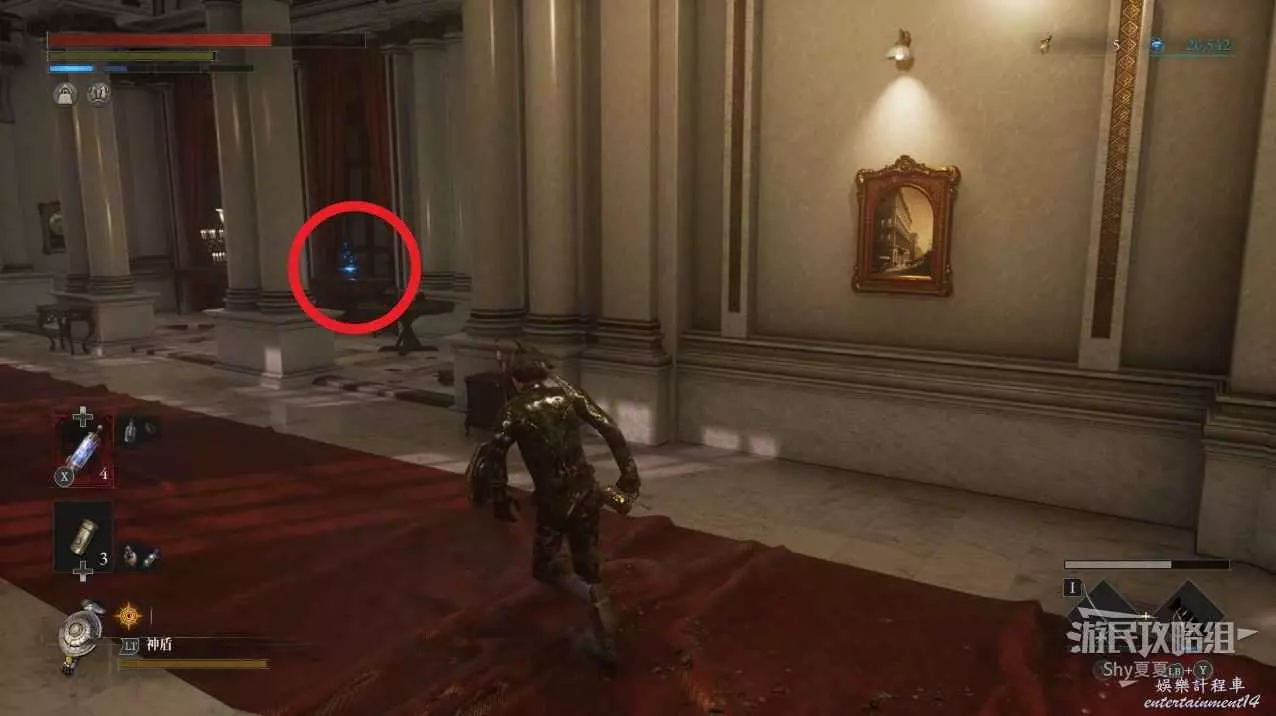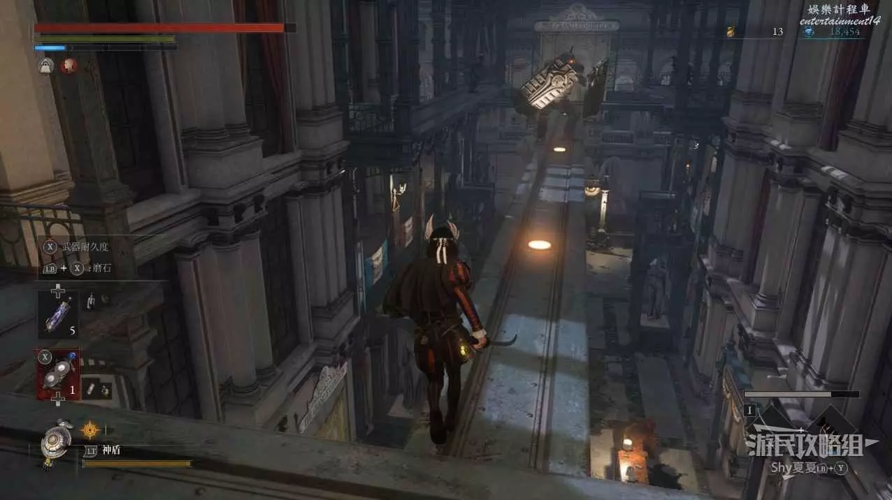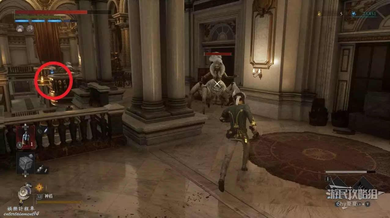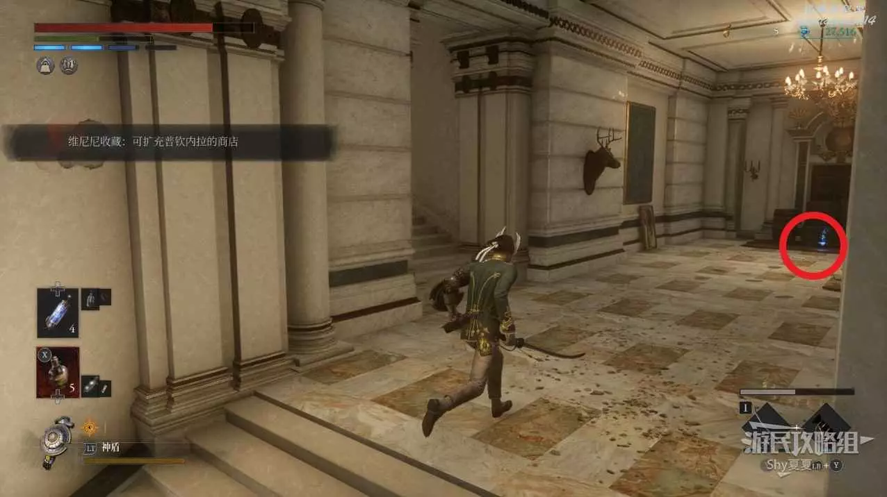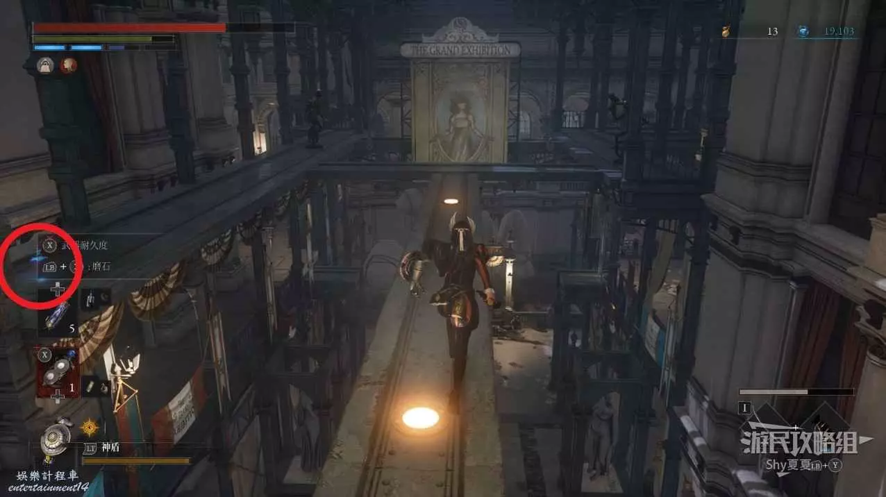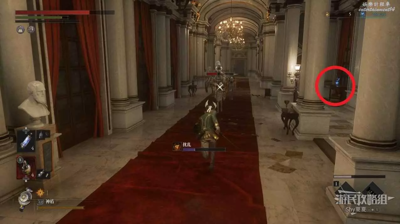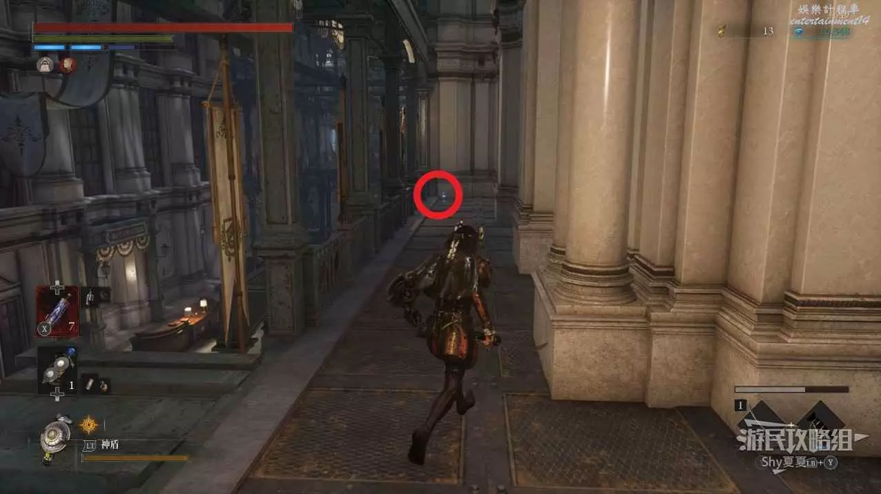 打開前方建築的大門,進入歌劇院,首先盡頭的門暫時無法打開,但是門口可以拾取【特殊淨化安瓶】,建議大家先走右側上樓,會遇到提線木偶,如果被其攻擊到會進入擾亂狀態,當擾亂條滿後會立即死亡,可以用【特殊淨化安瓶】接觸此狀態。一層的欄杆可以拾取【契約暗月月光石】。