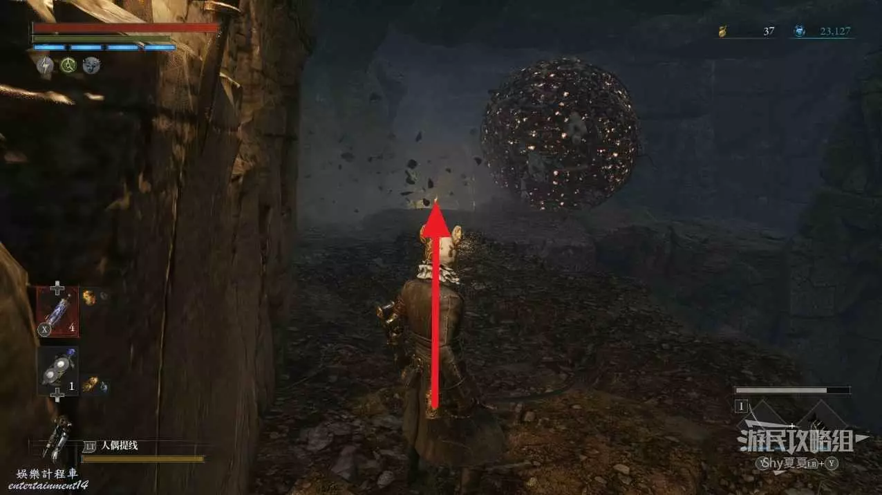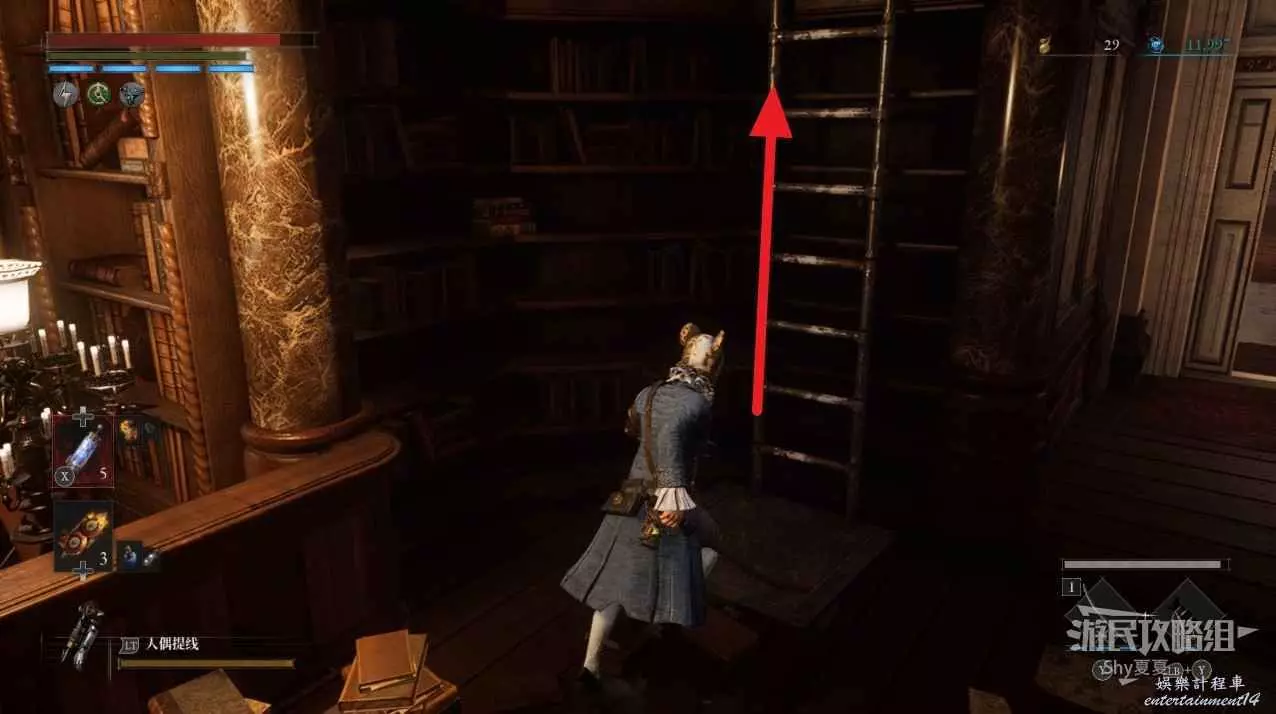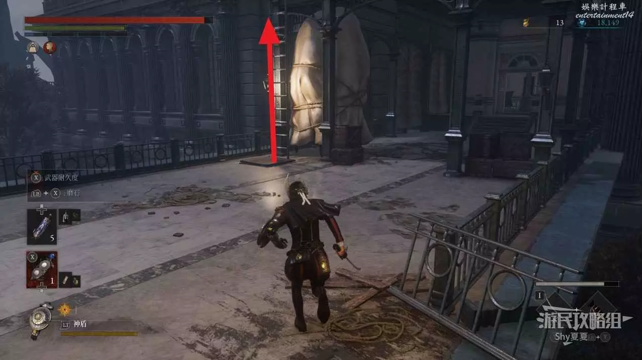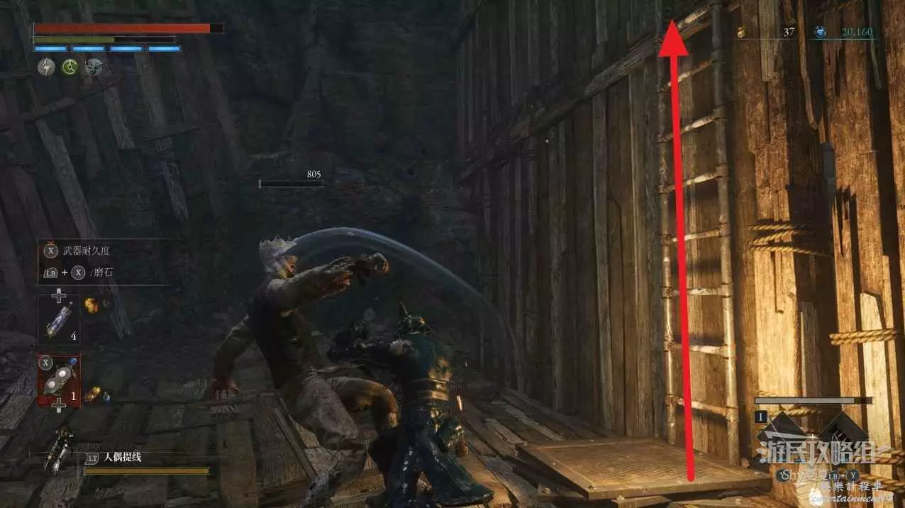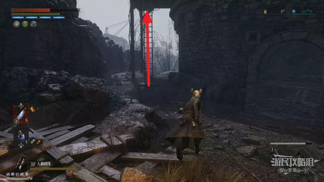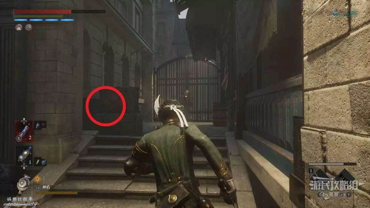 看到一個梯子後,旁邊會有一個鐵臂哥,先爬上梯子,打開門,就是之前白衣女旁邊的捷徑門,還能拾取【星星碎片】。然後再下來擊敗鐵臂哥。