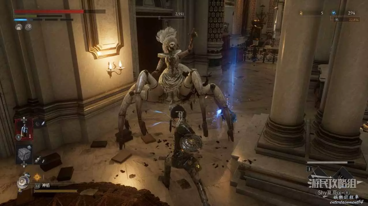 在上方有一個蜘蛛腿的人偶,她就是操控提線木偶的敵人,靠近時她會喊叫釋放擾亂,此時需要拉開距離,防止被秒殺。擊殺後在欄杆邊拾取【鮮豔自我素碎片(+300)】。