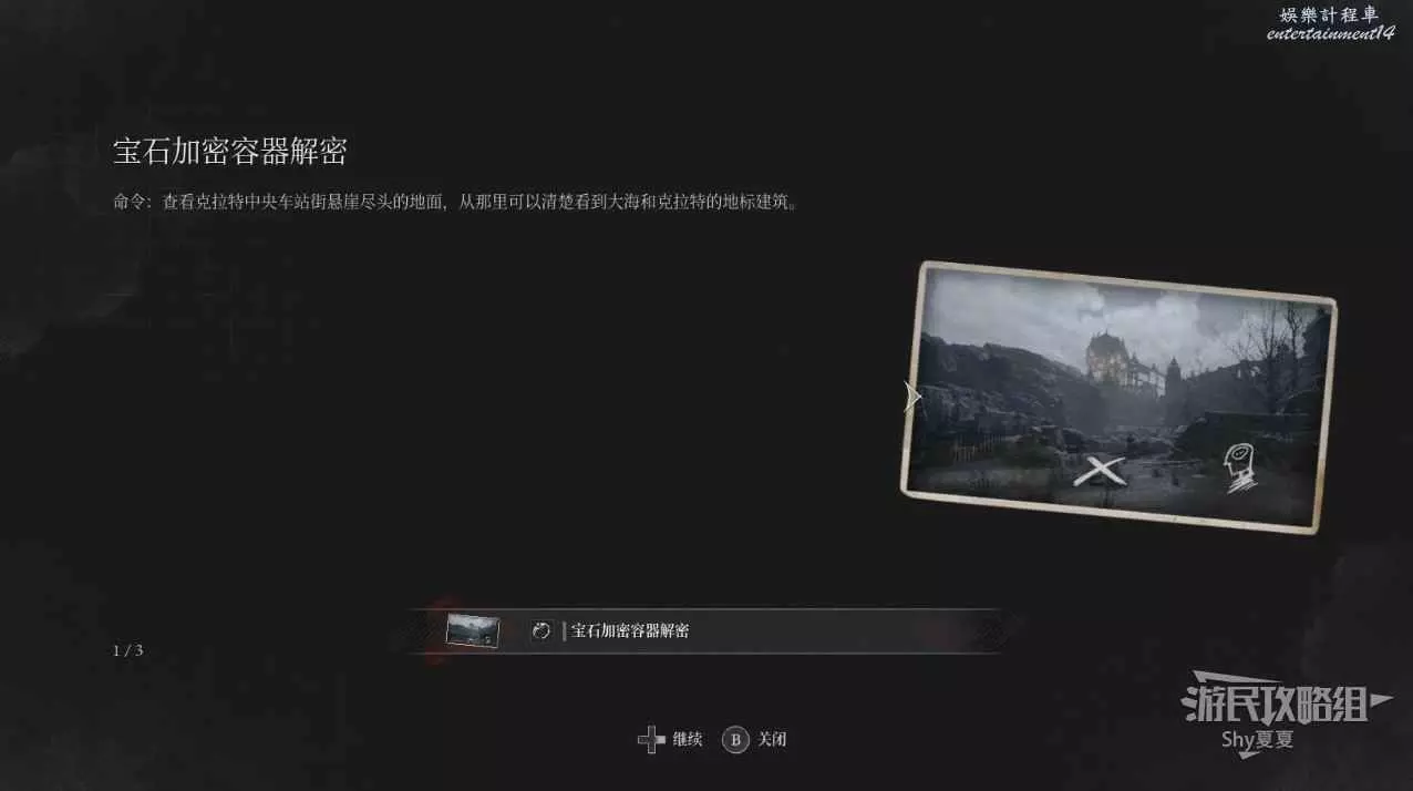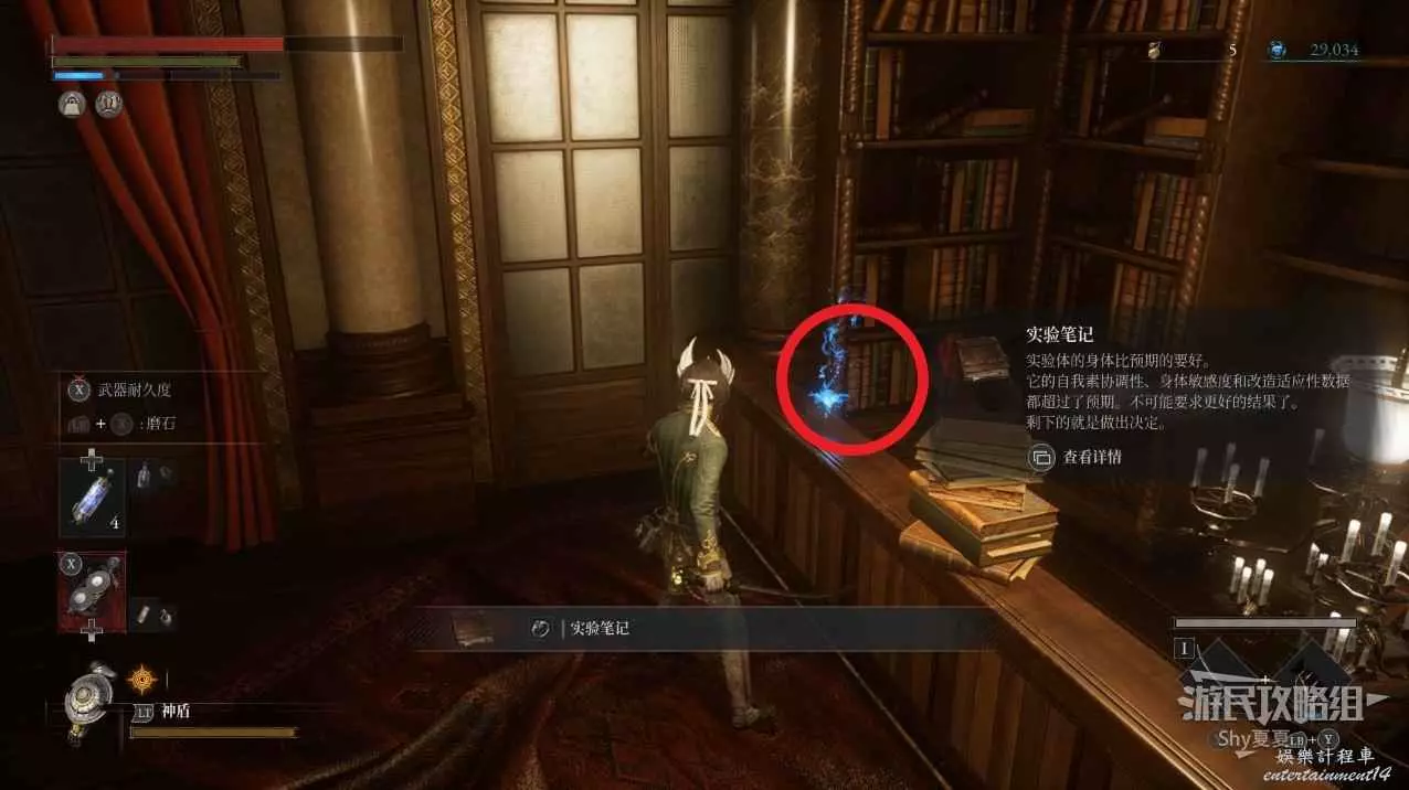 盡頭的屋子可以拾取【實驗筆記】。轉身有一個向上的梯子,上去可以獲得【寶石加密容器】。