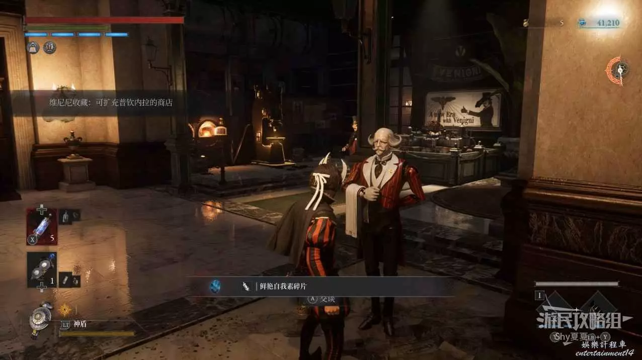回到酒店可以將【非凡維尼尼收藏】交給普欽內拉,擴充商店獲得【鮮豔自我素碎片(+300)】,並可以花費【2000自我素】購買武器【暴君殺人魔匕首】,花費【1000自我素】購買防禦零件【貝爾福德纖維強化/多層/間隔式裝甲內襯,花費【1300自我素】購買護身符【活屍屠夫護身符】。