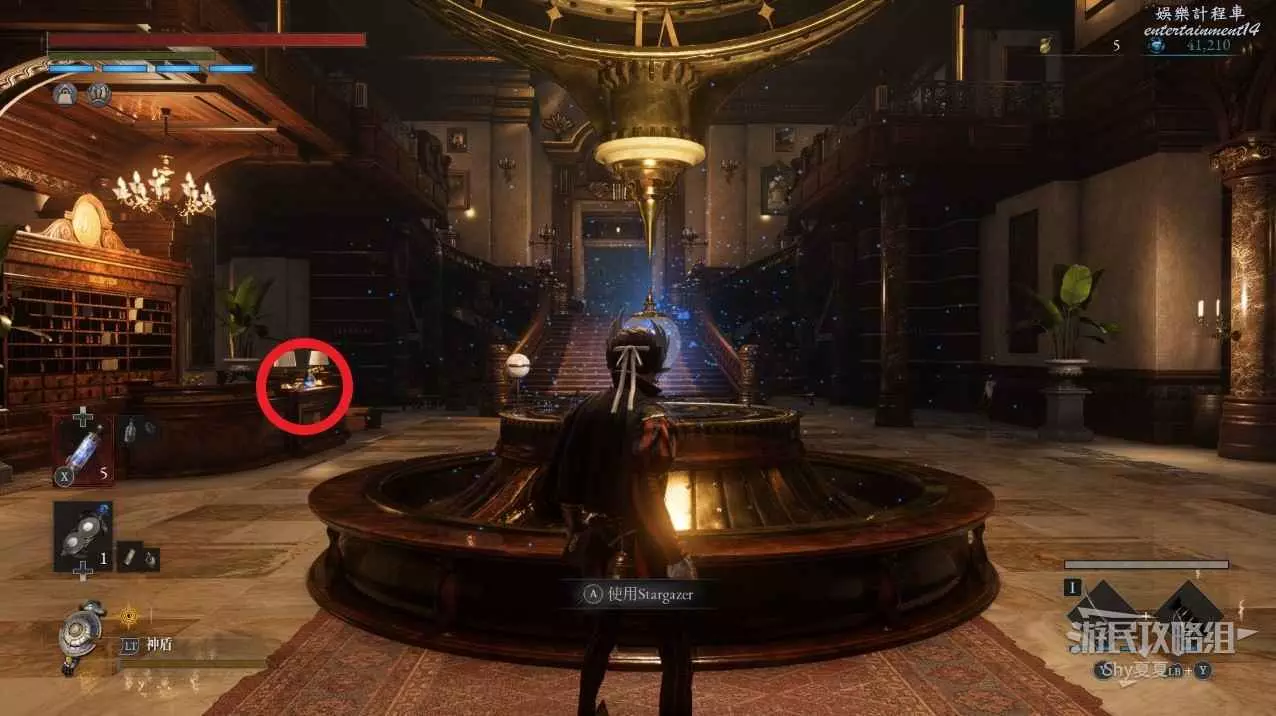 上樓梯(兩邊都一樣)就能來到一個花園,在花園中有Stargazer,補給後可以在周圍拾取【屬性淨化安瓶】、【電閃雷鳴研磨劑】、【特殊抗性安瓶】。