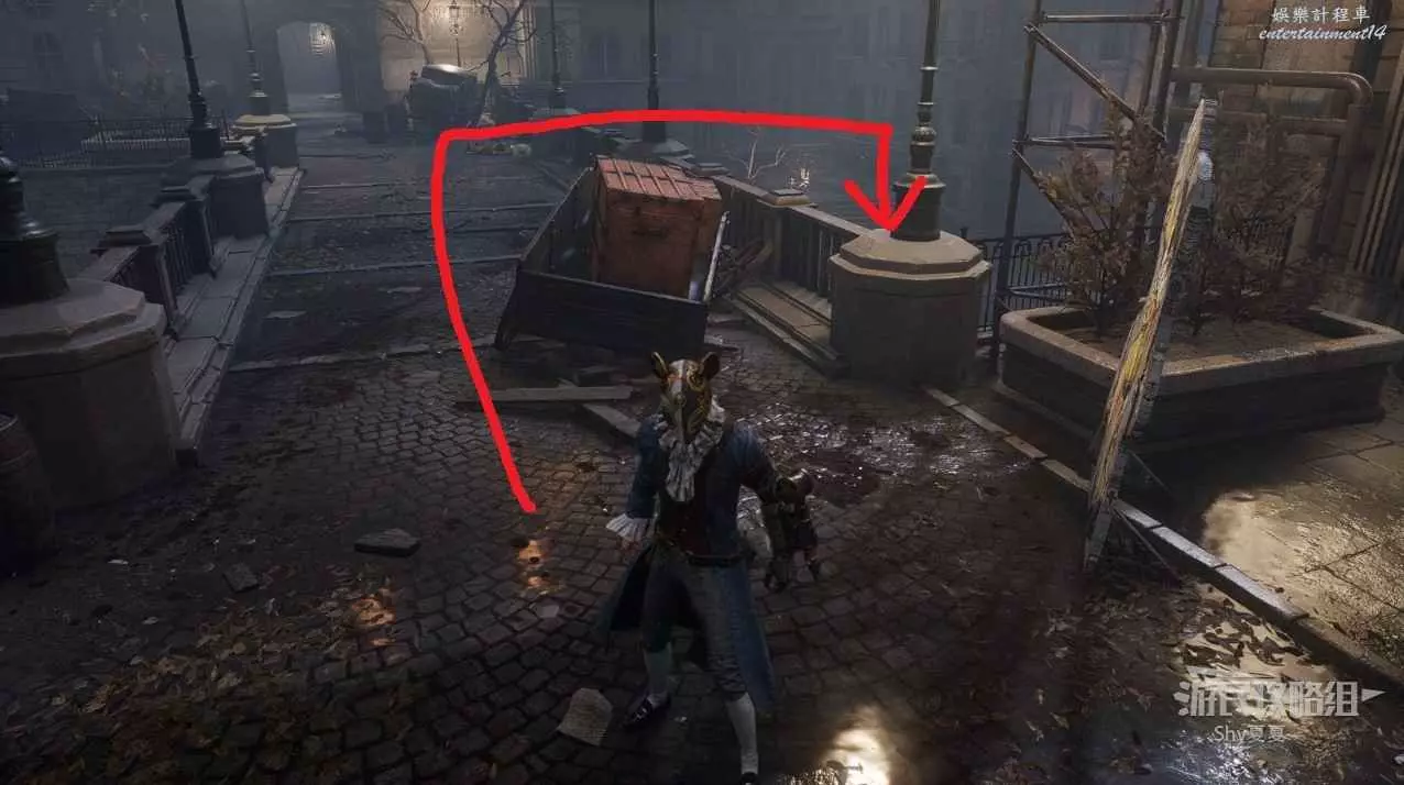 前往【第五章-朝聖者之道】Stargazer,乘坐電梯下樓,半途跳下電梯來到平臺,到了平臺上沿著下圖紅色路線走。