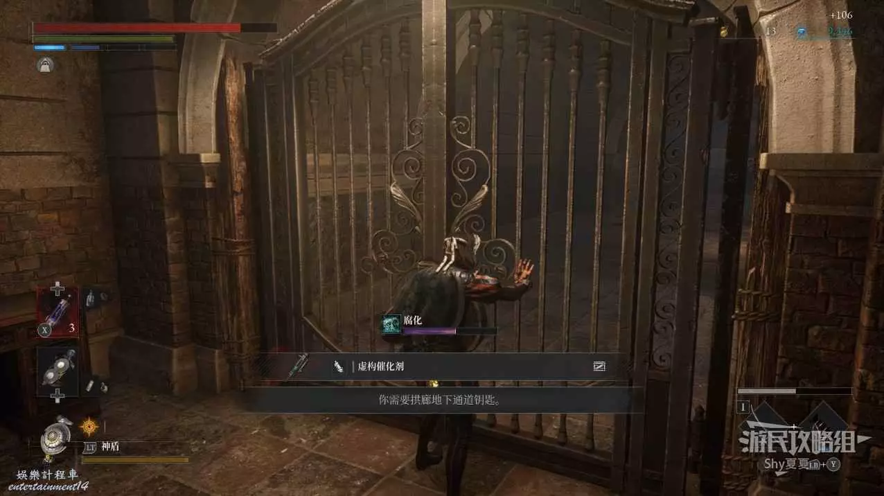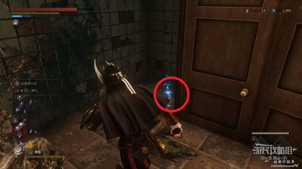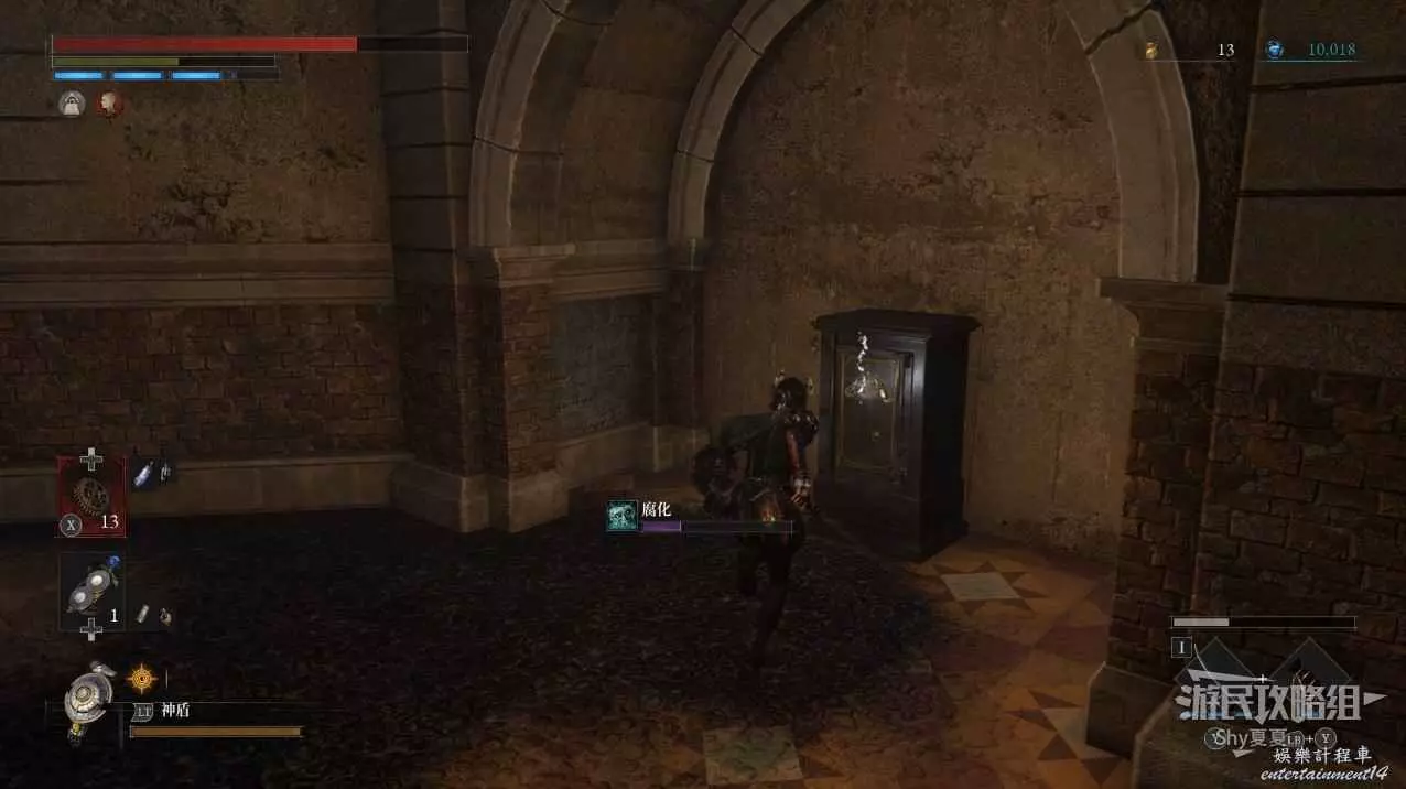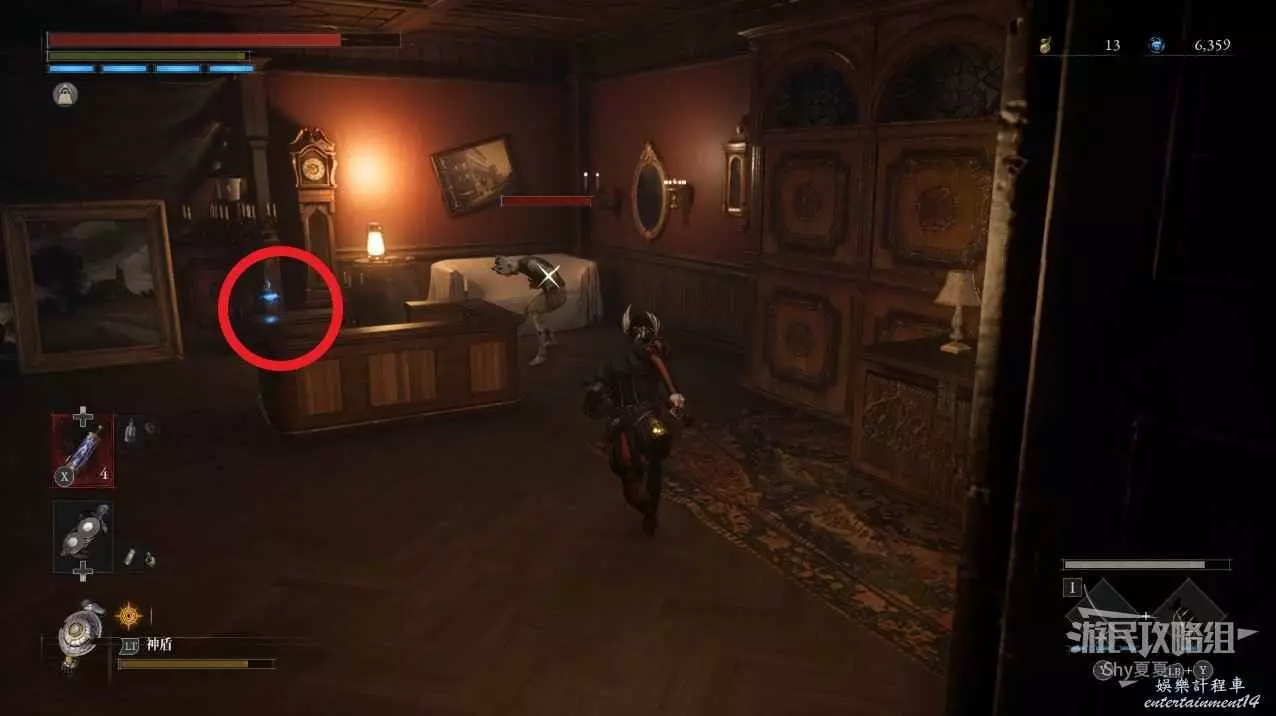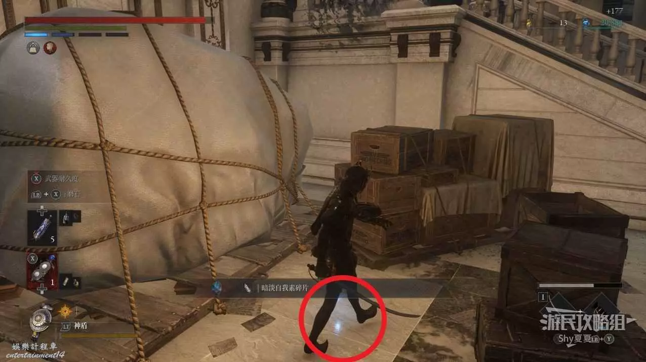 繼續前進,在前方右側有一個敲牆的人偶,擊殺後可以在他身後獲得【閃亮自我素碎片(+500)】,左側爬上樓梯則可以拾取【屬性淨化安瓶】。