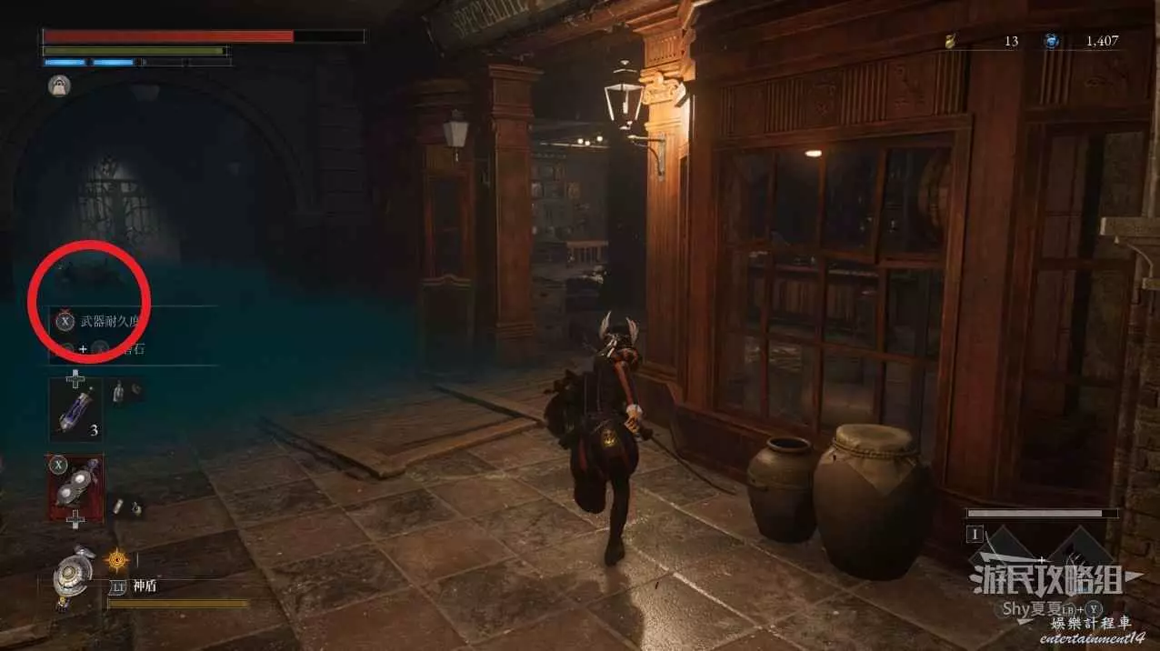 走到盡頭下樓梯,往前走,左側有一個小黑屋,進去在盡頭可以獲得【技術護身符】。拾取後,回到下圖一直往前走,盡頭的屋子有一個強敵。