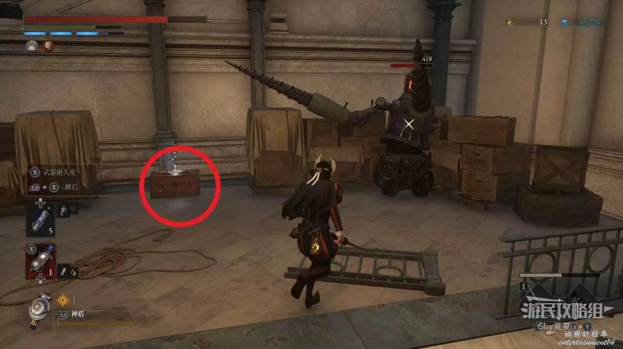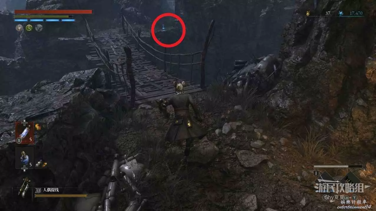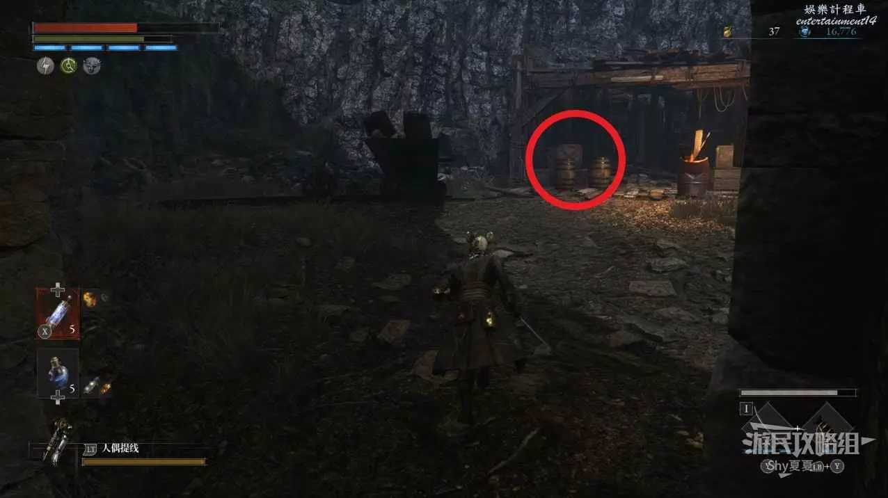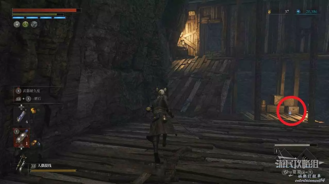 來到懸崖邊,使用姿勢【檢查地面】調查下圖紅圈的木桶,可以獲得【贖罪者狩獵服】、【軍團口徑】。