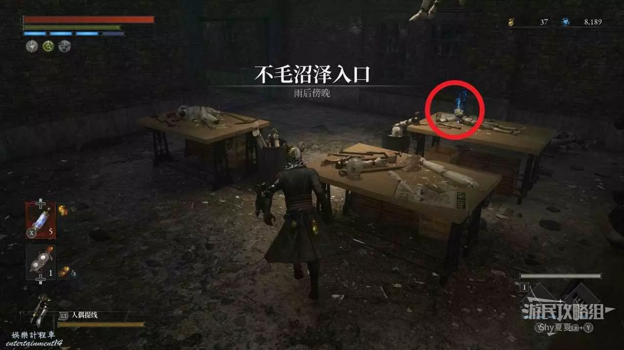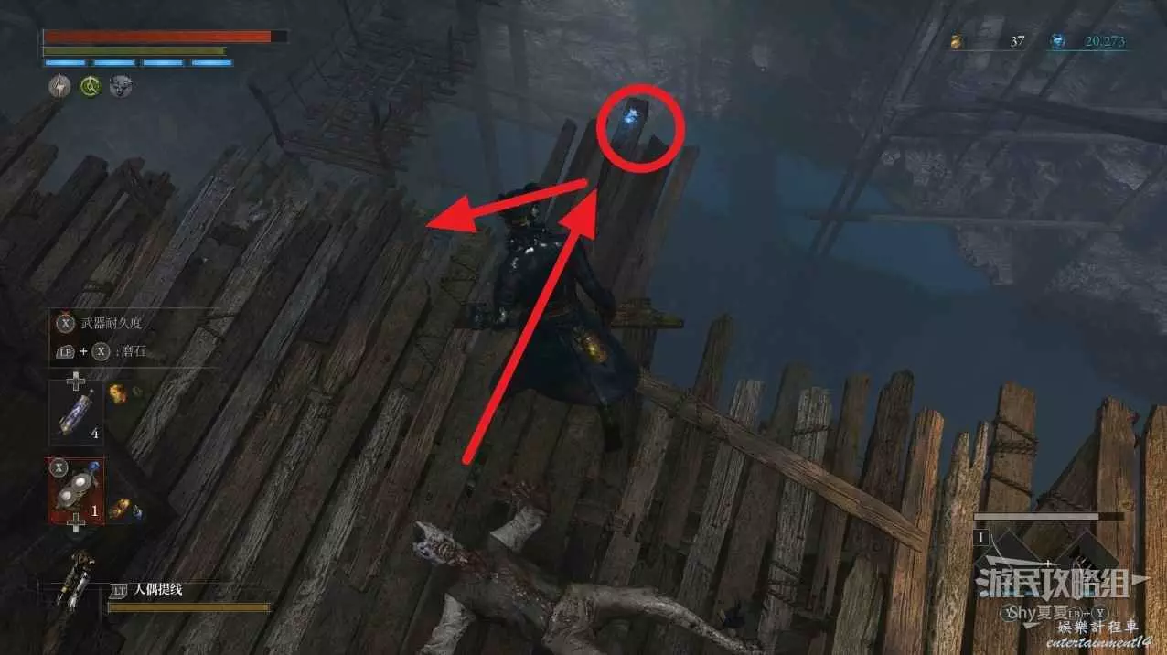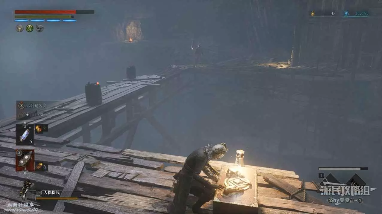 爬上高塔後,擊敗操作大炮的人偶,並且把大炮也毀了,拾取旁邊寶箱裡的【武器-活人偶斧】,然後就能去探索下面的沼澤了。
