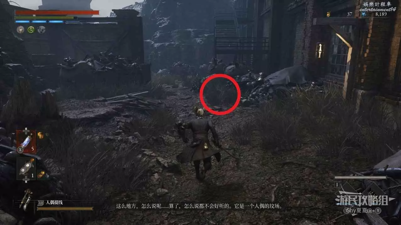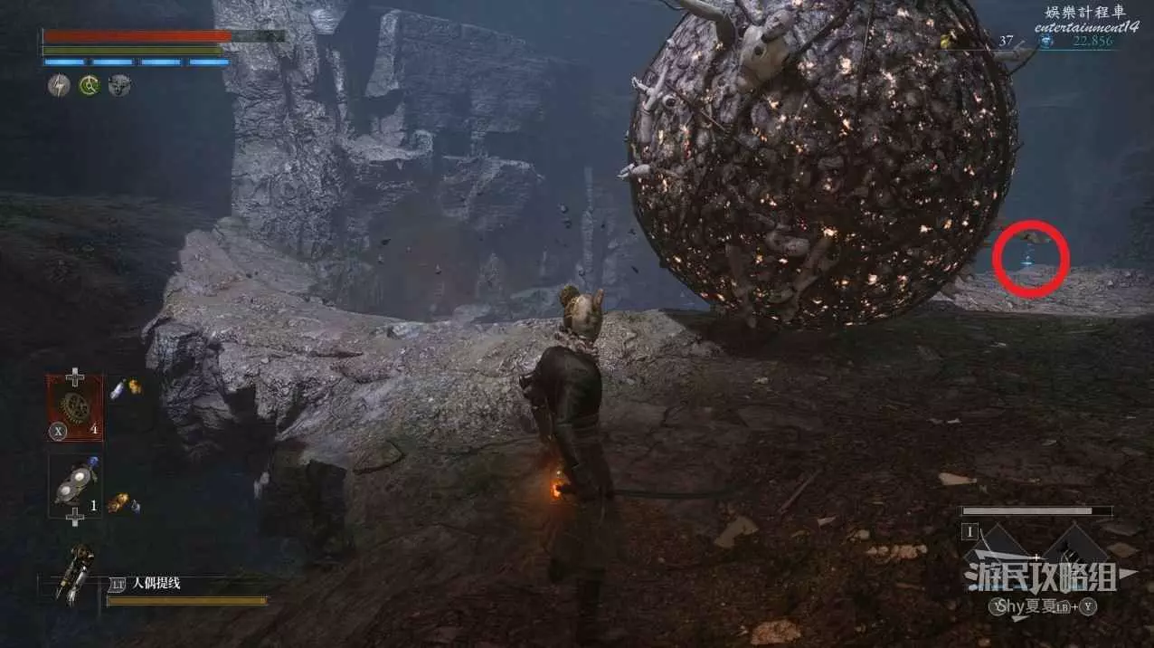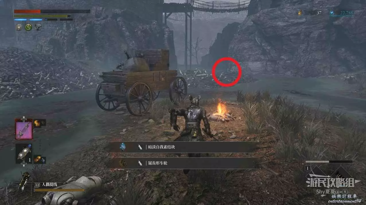 有一個下臺階的區域,裡面有一個女僕人偶,小心下去就會出現自爆人偶,建議用齒輪吸引女僕人偶出來擊殺,然後攻擊紅圈位置會出現的自爆人偶。全部擊殺後拾取地面的【鋸齒形車輪】。