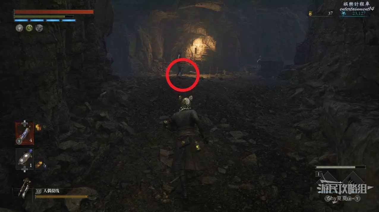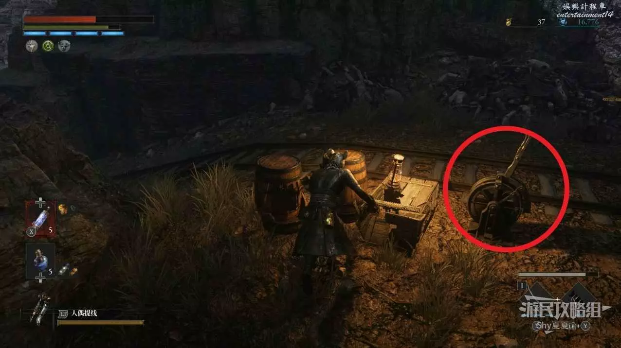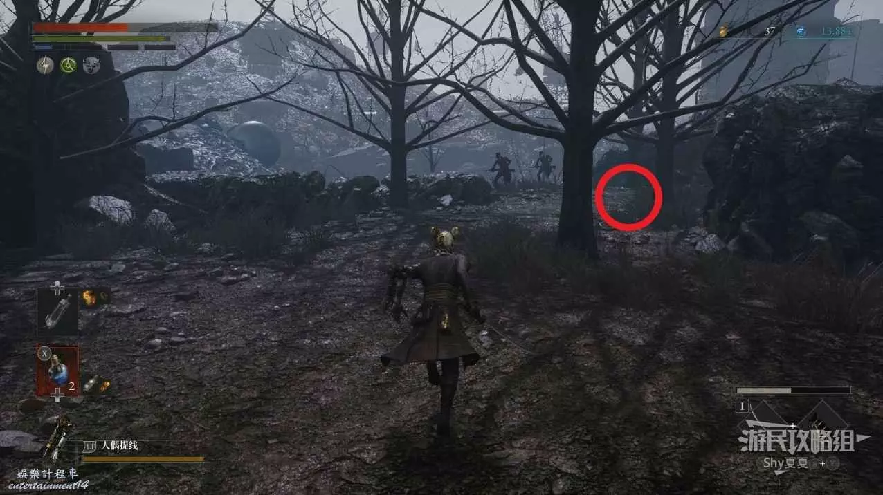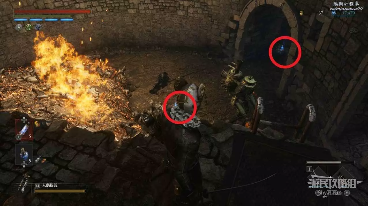 有一個下臺階的區域,裡面有一個女僕人偶,小心下去就會出現自爆人偶,建議用齒輪吸引女僕人偶出來擊殺,然後攻擊紅圈位置會出現的自爆人偶。全部擊殺後拾取地面的【鋸齒形車輪】。
