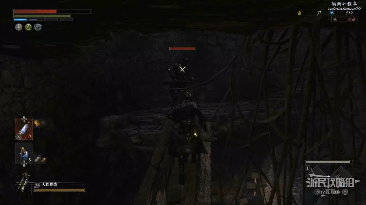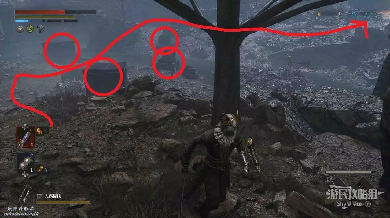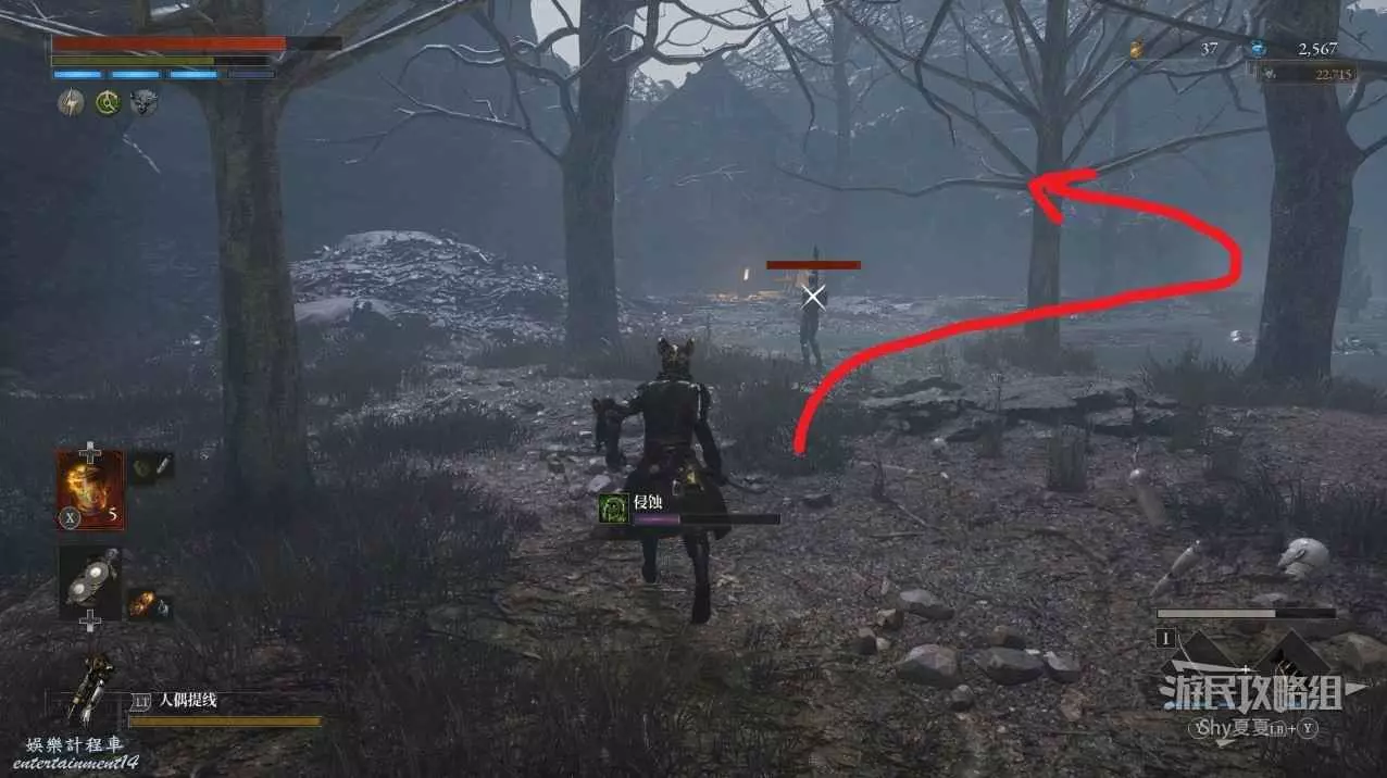 有一個小斜坡,上來之後有一名背對我們的人偶,擊敗後在旁邊拾取【暗淡自我歲碎片(+100)】。然後跳到下方的毒池中向右走。
