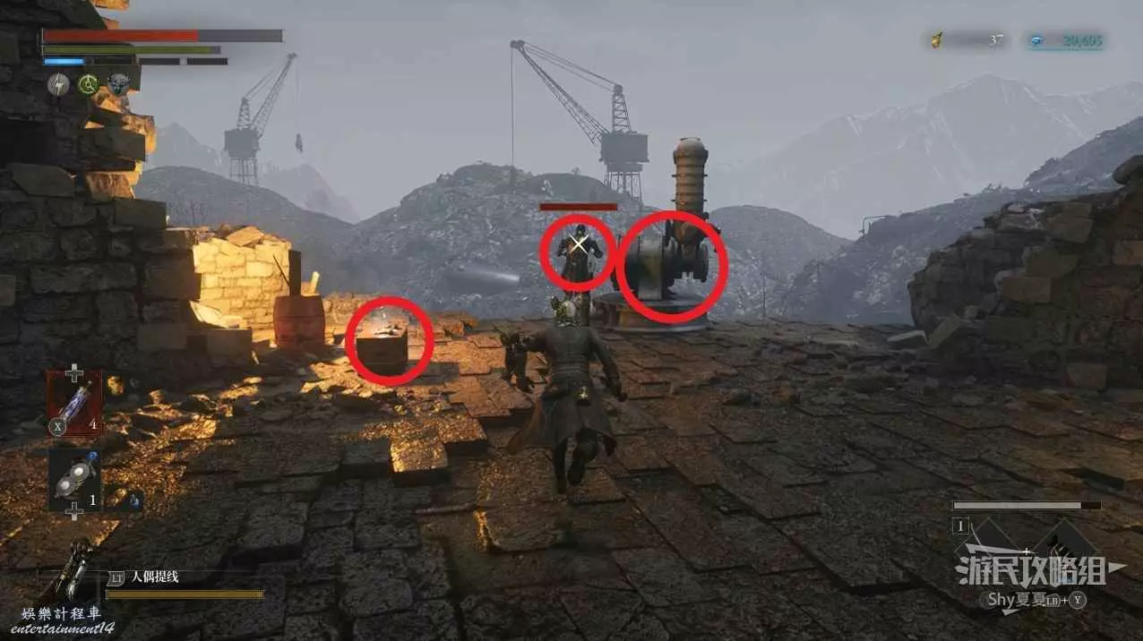 來到沼澤後要保持移動,如果聽到開炮的聲音,馬上加速跑就能躲開。躲在下圖四個紅圈的位置,讓火炮把這兩個箱子和兩台車破壞掉,裡面可以拾取道具。然後馬上沿著紅線進入塔內,爬上樓梯。先不要理會任何敵人。