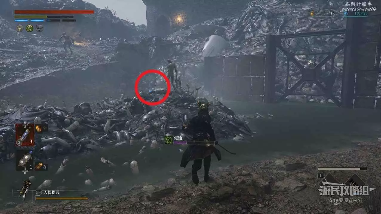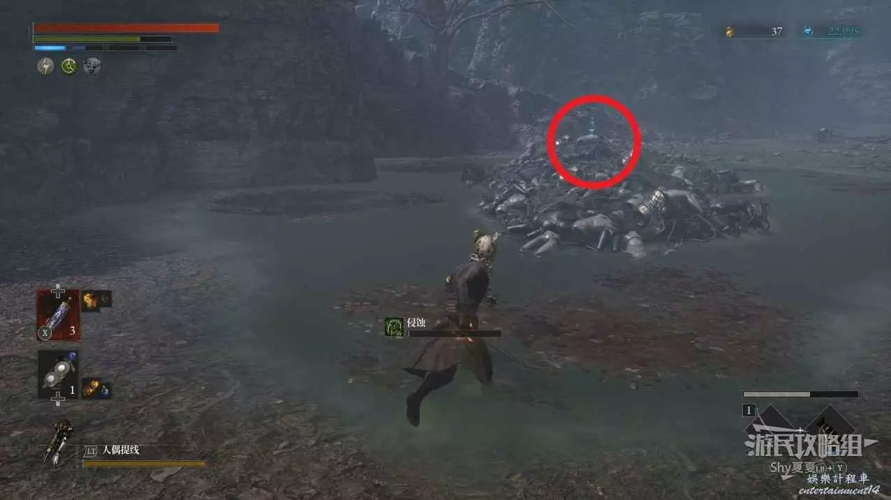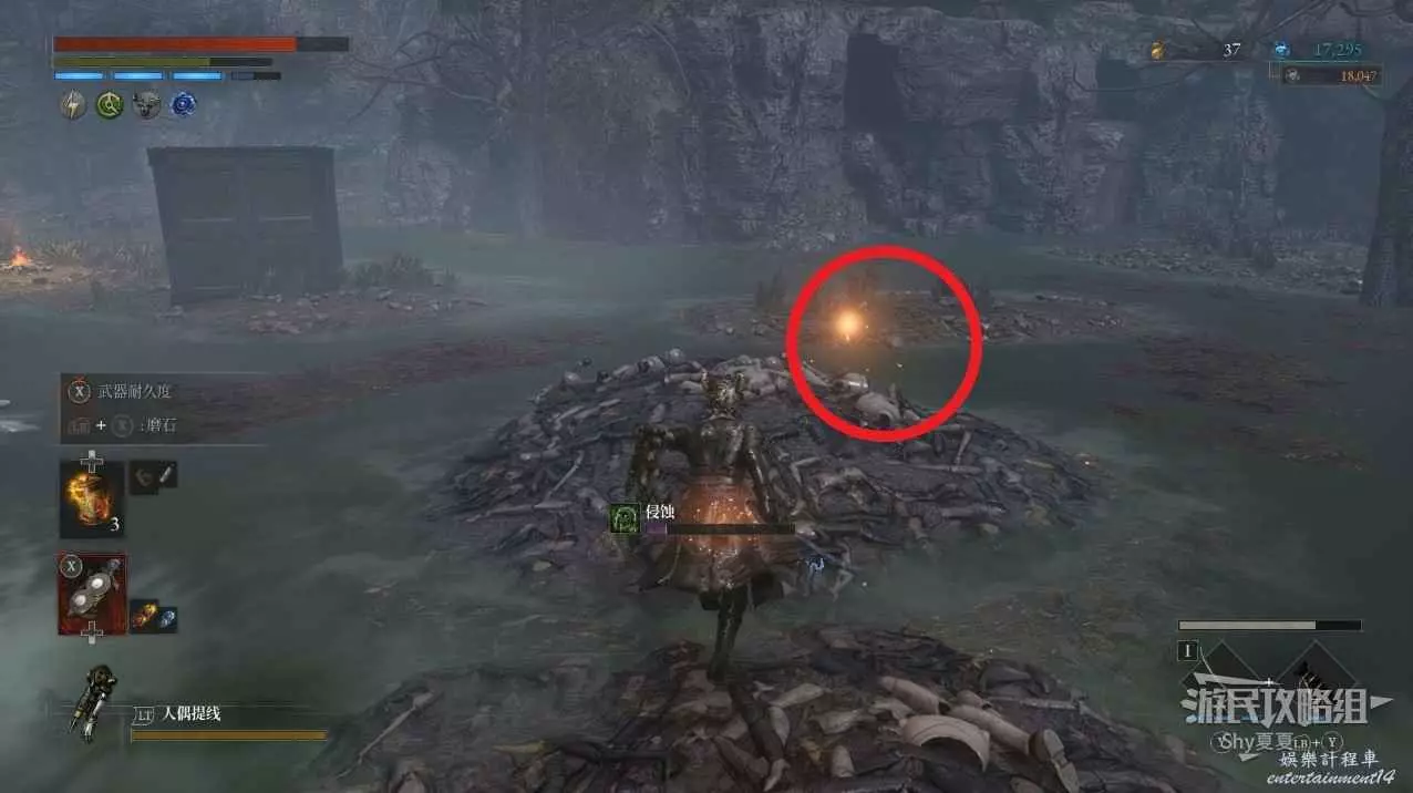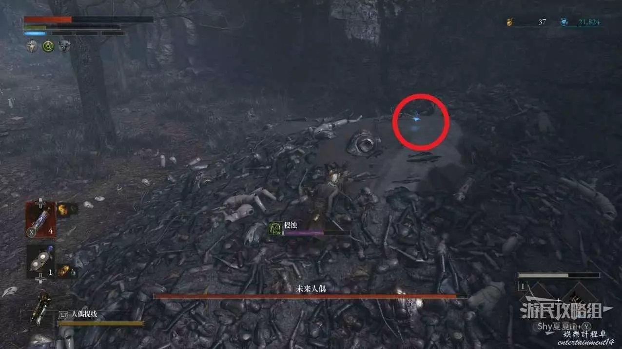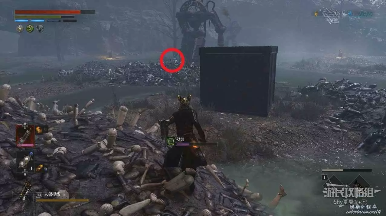 從小木屋出來後,會在左側看到一個被人偶屍體堆起來屍堆,上面可以拾取【暗淡自我素結塊(+1000)】。