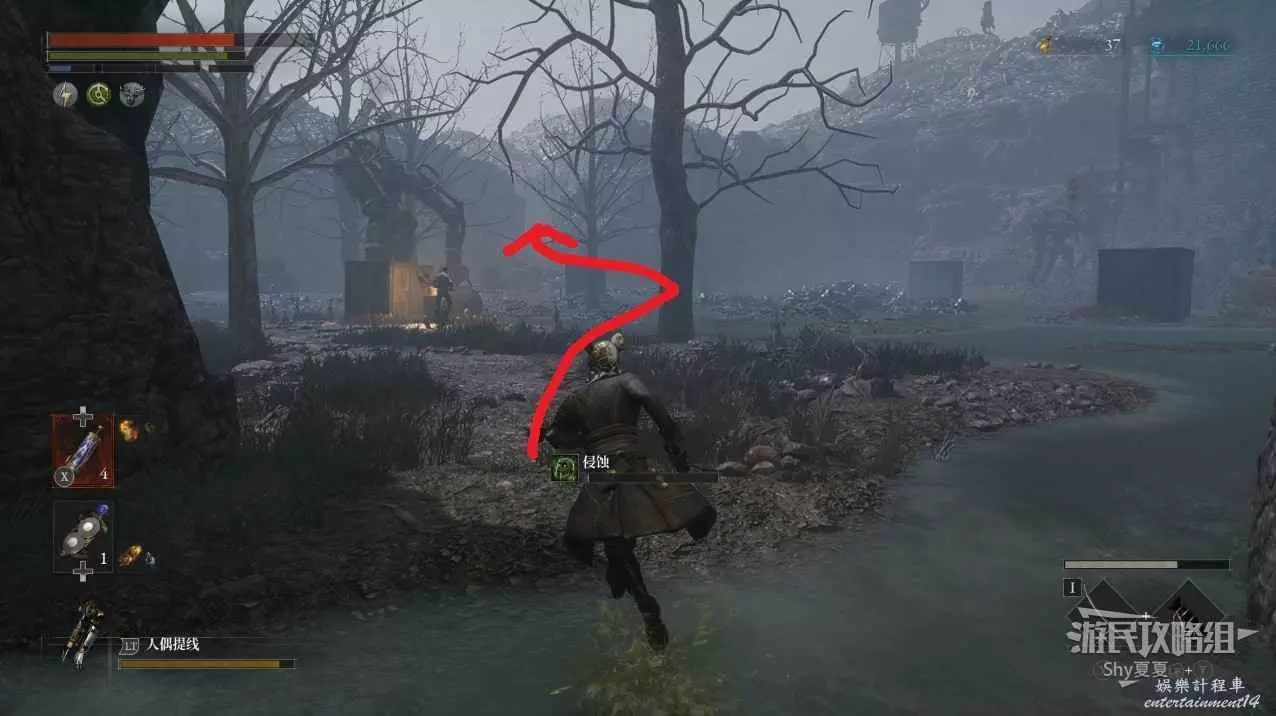 在Stargazer休整之後,會來到有兩個未來人偶巡邏的沼澤,這裡建議不要理會任何敵人,沿著下圖路線,徑直往前跑,等之後破壞大炮後再回來攻略此區域。