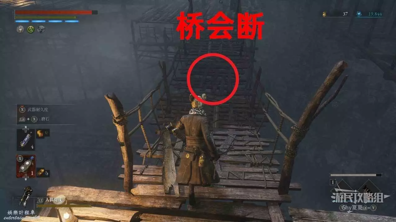 回到剛剛的木橋,中間會斷裂,直接跳過去。