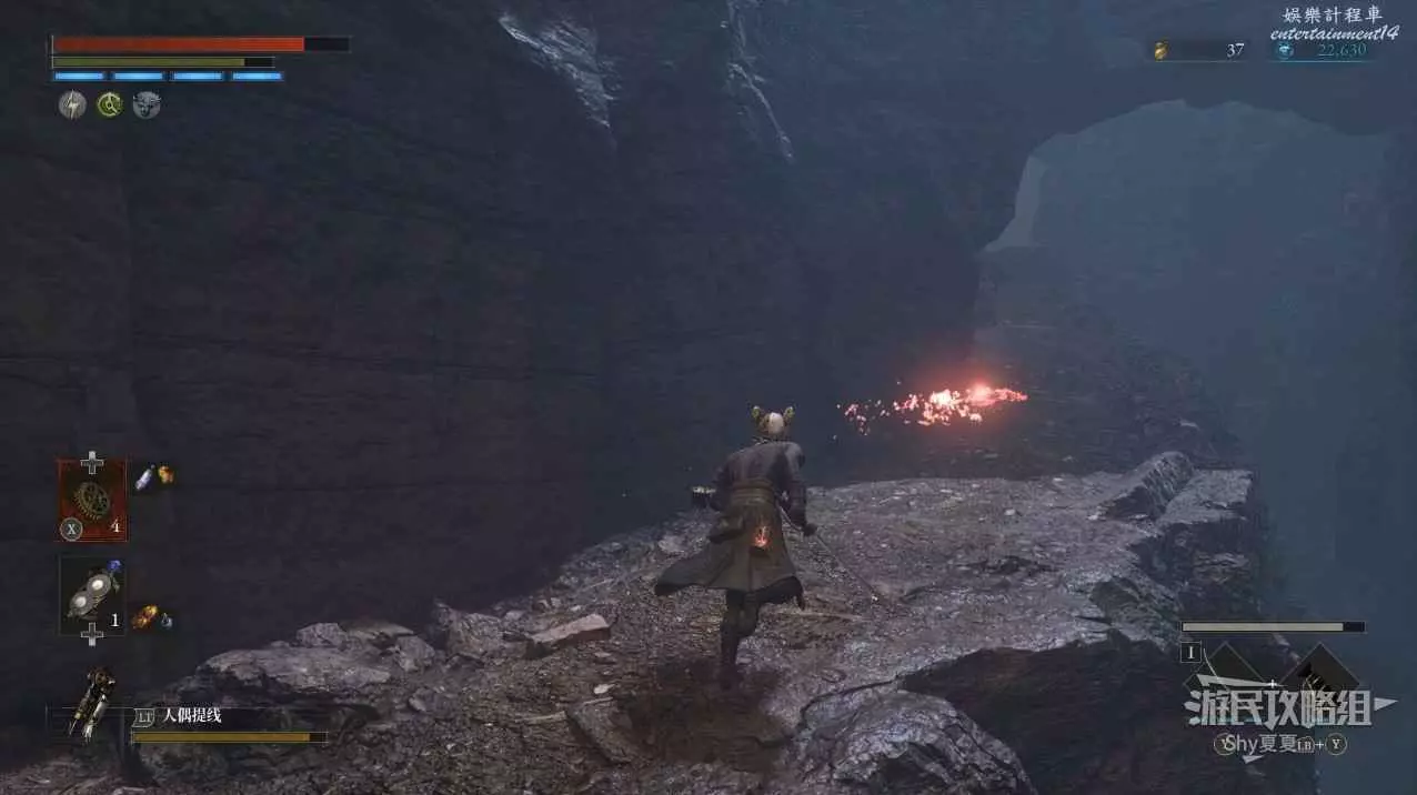 走到一個懸崖後,轉身上坡擊敗一個活屍,此時還會有火球滾下,對面拾取【鮮豔自我素碎片(+300)】。