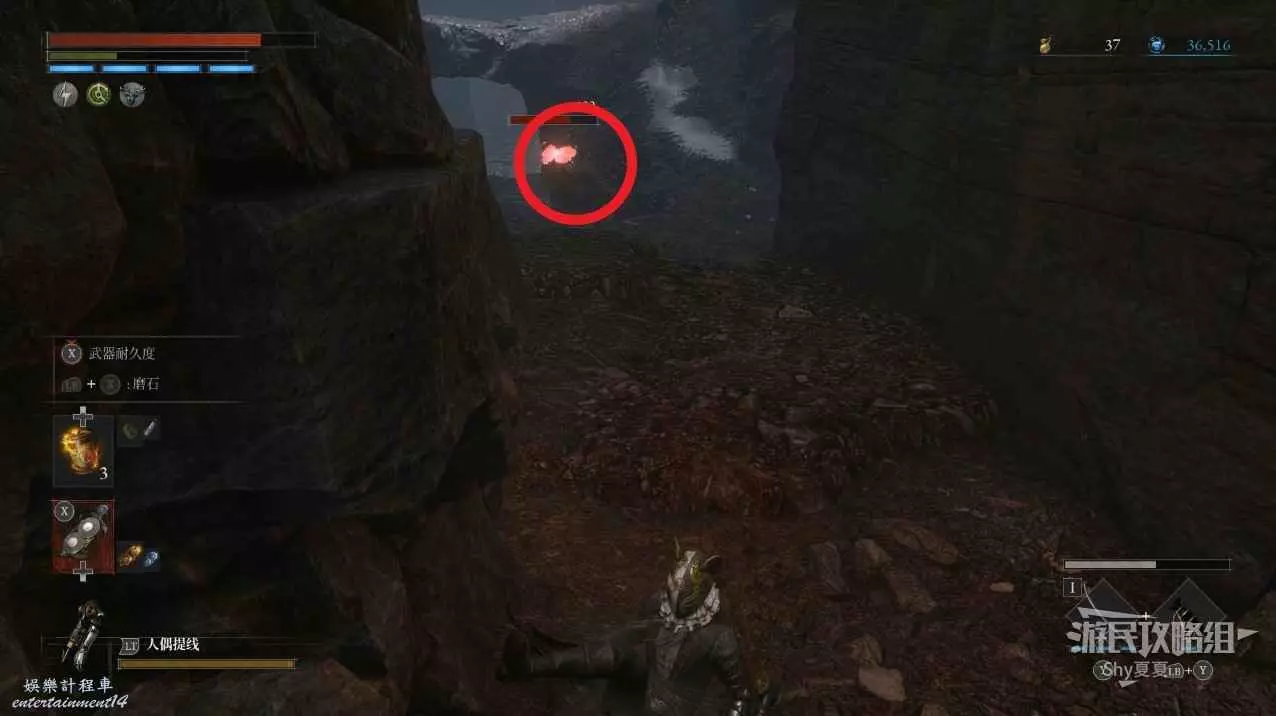 繼續前進,左側有兩個道具,分別為【電閃雷鳴研磨劑】、【暗淡自我素結塊(+1000)】,拾取的時候比較極限。