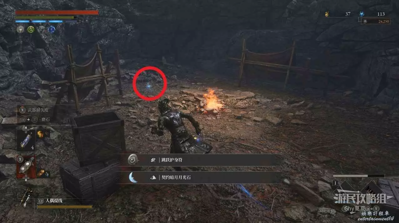 回到屋子旁,往前走會看到一團篝火,篝火右側有一個山洞,進去。